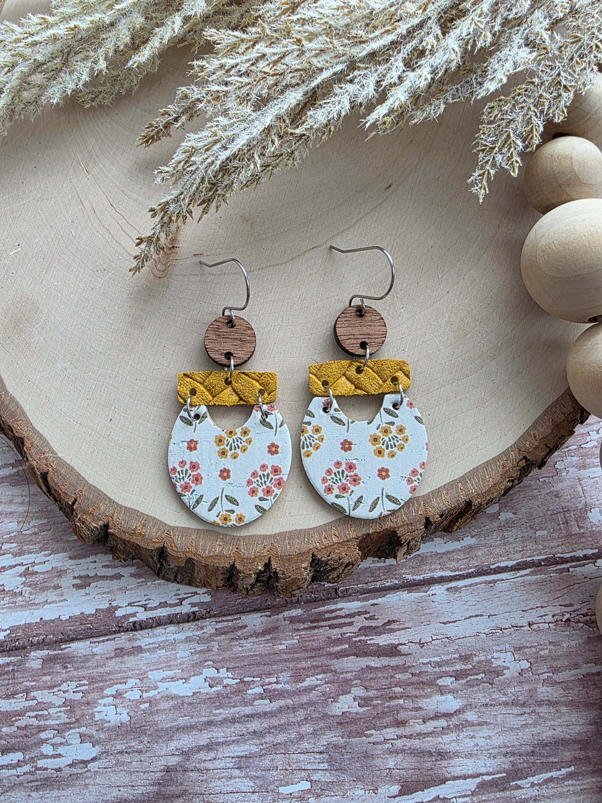 Autumn Floral earrings made with genuine leather backed cork, mustard colored genuine leather, wood connector and stainless steel hardware (hypoallergenic and tarnish resistant).
