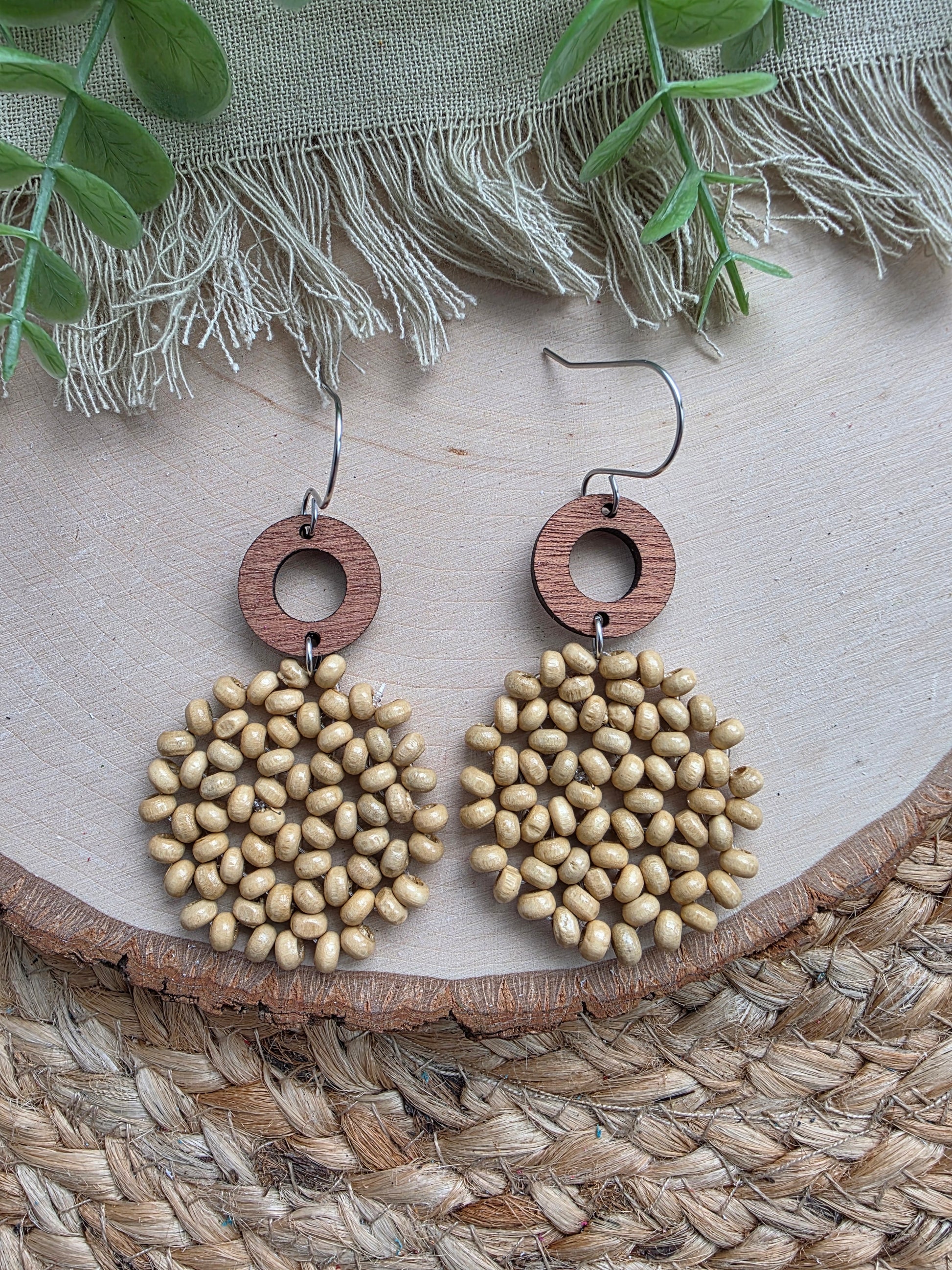 Beige beaded circle earrings made with wood beads, wood connector and stainless steel hardware (hypoallergenic & tarnish resistant).