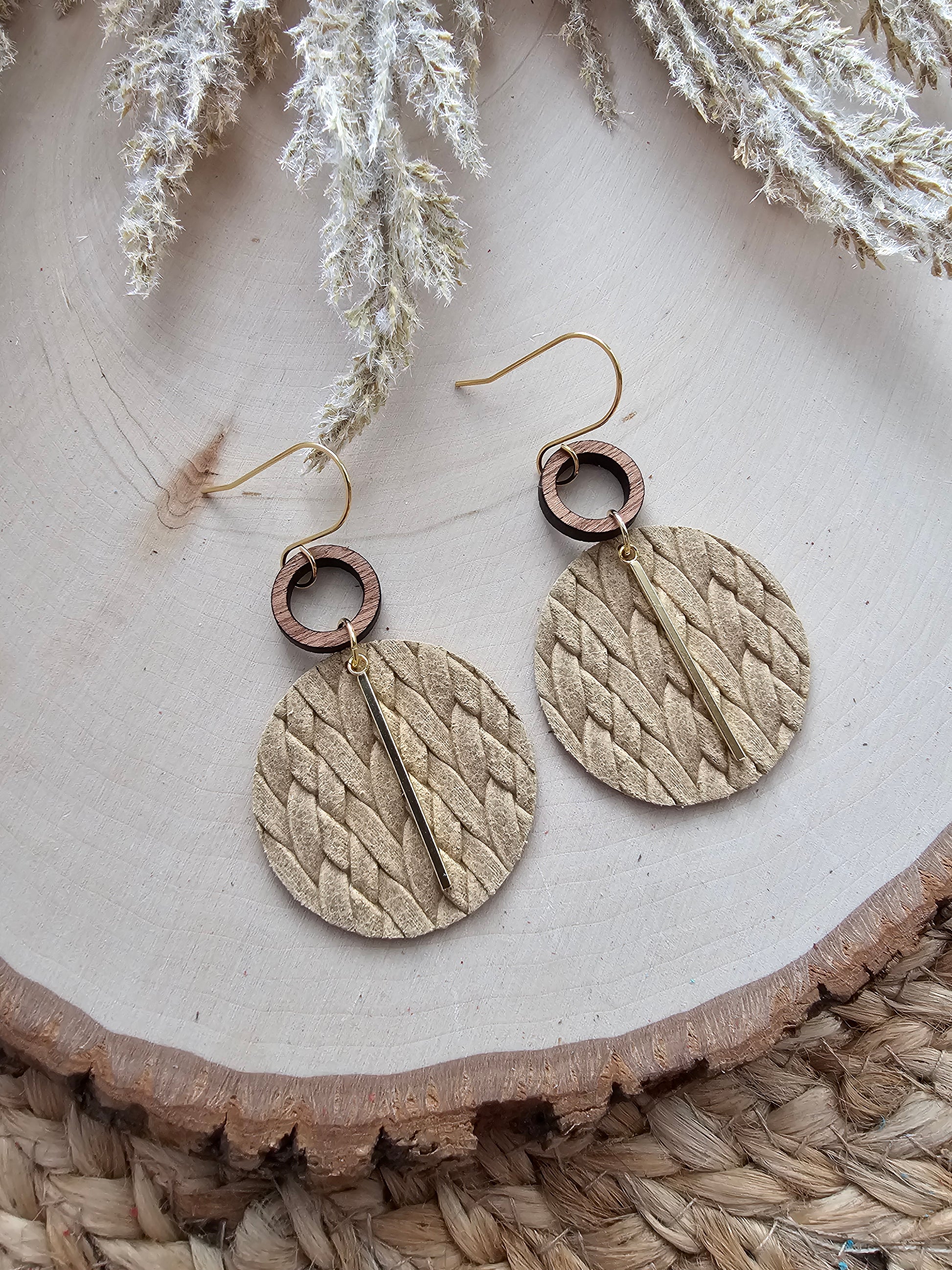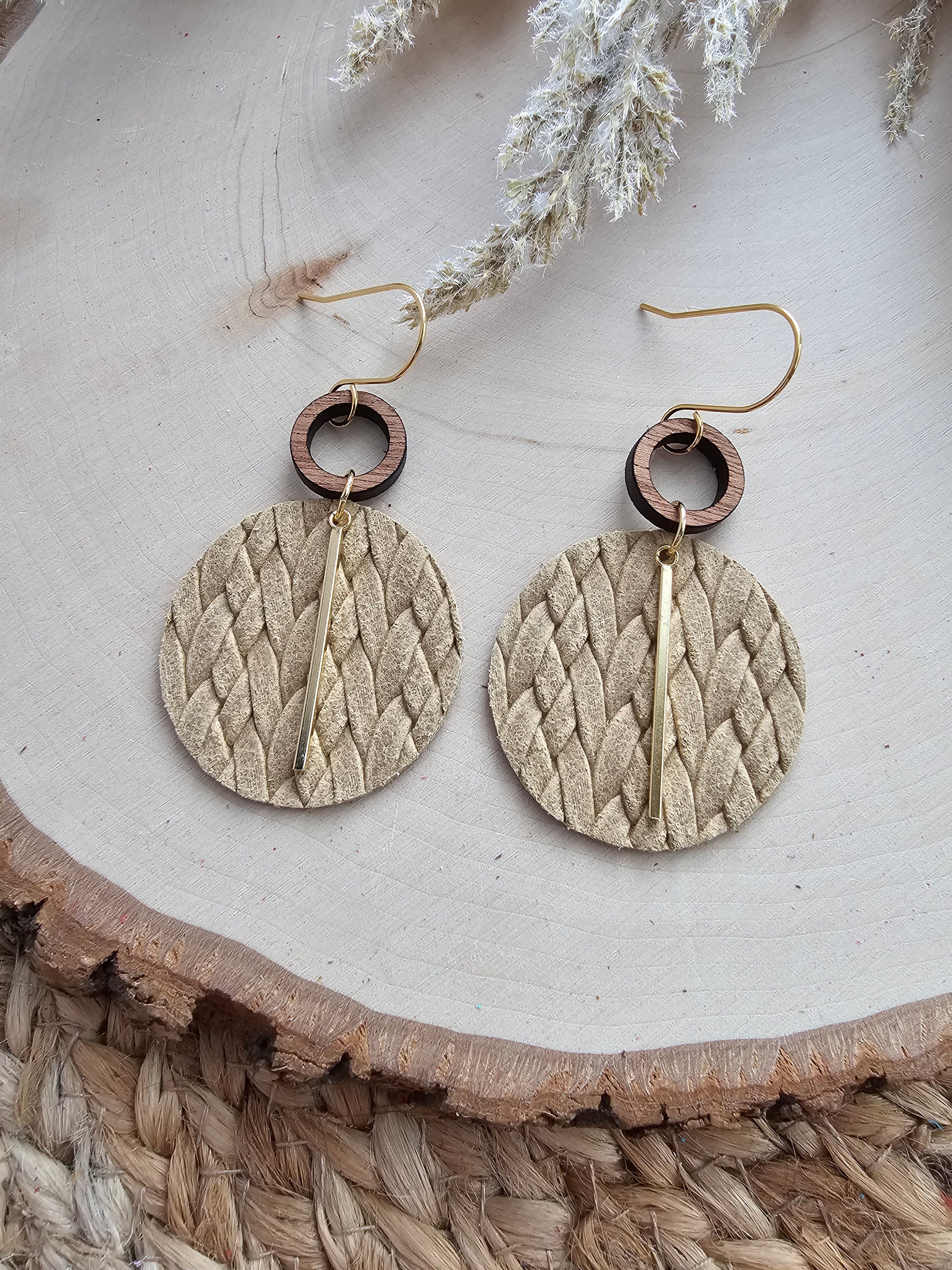 Beige braided circle earrings made with genuine leather, wood open round connector, gold or silver toned stainless steel bar charm, and gold toned stainless steel hardware (hypoallergenic and tarnish resistant).