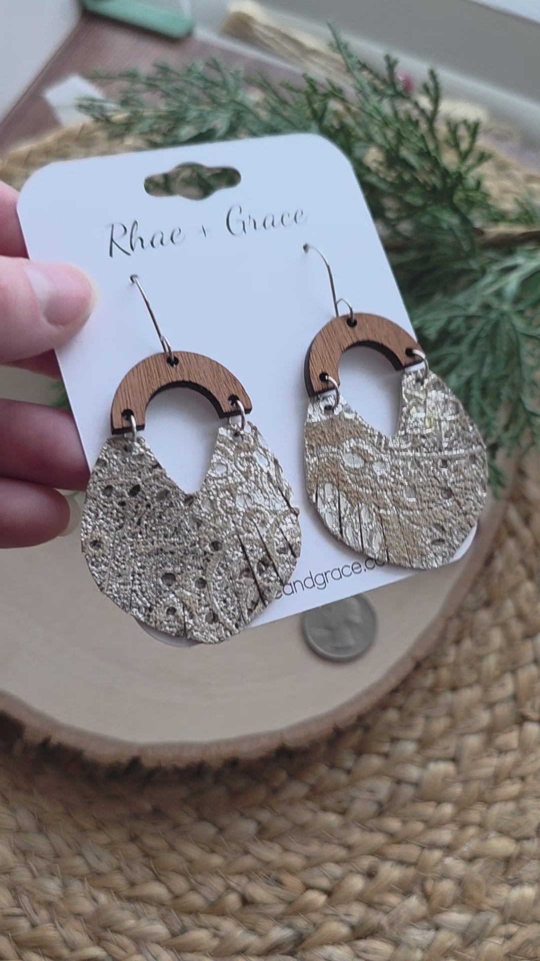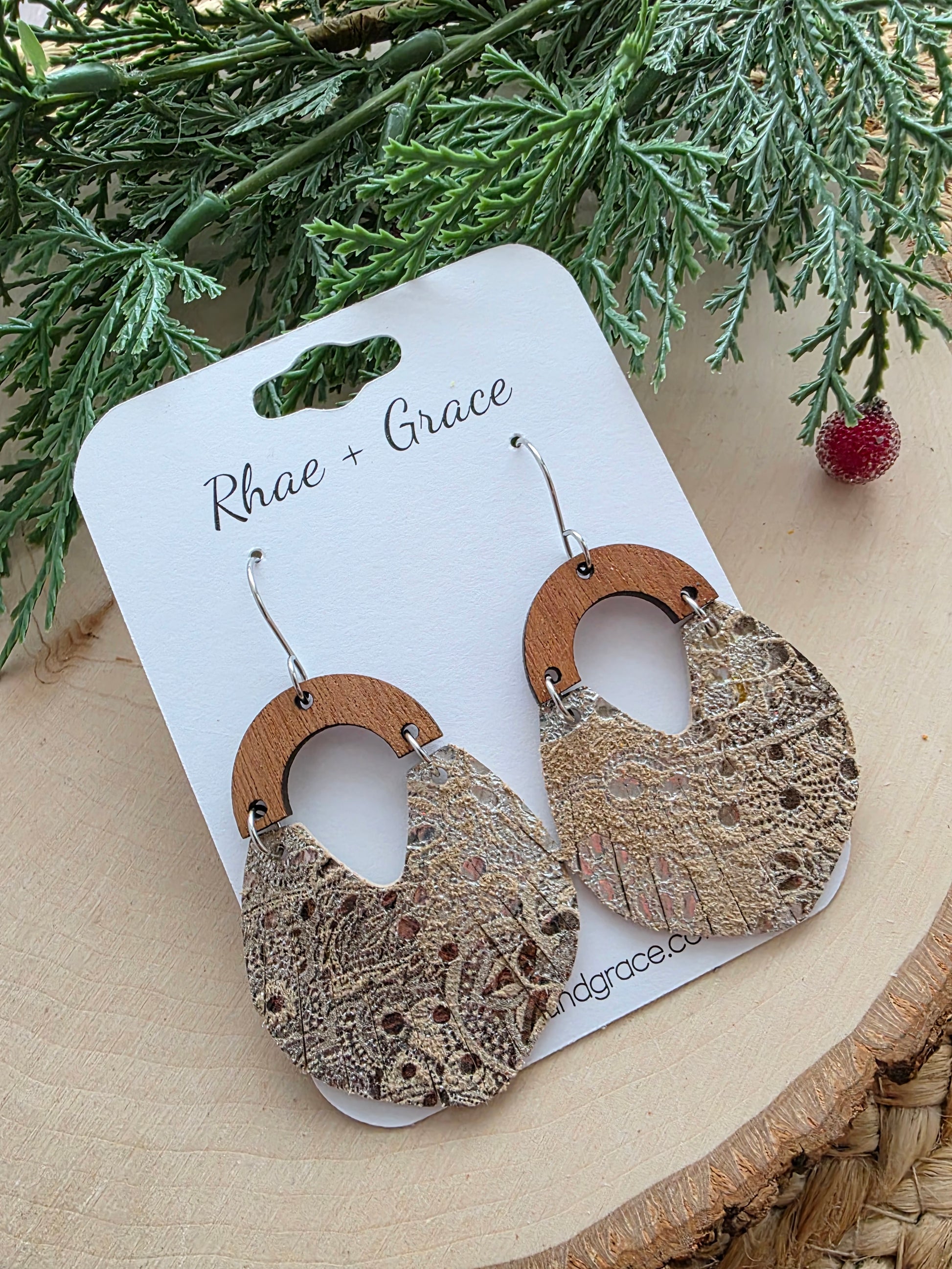 Beige and silver paisley type print fringe swoop earrings made with genuine leather, wood arch connector and stainless steel findings (hypoallergenic & tarnish resistant).