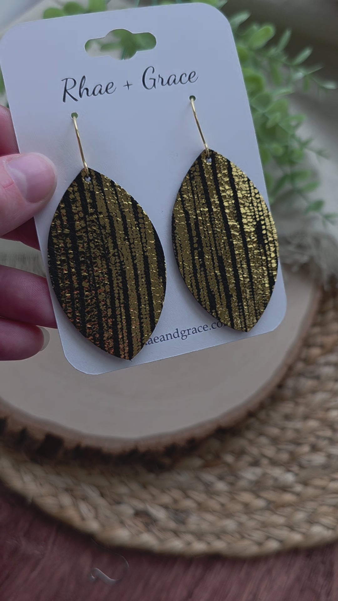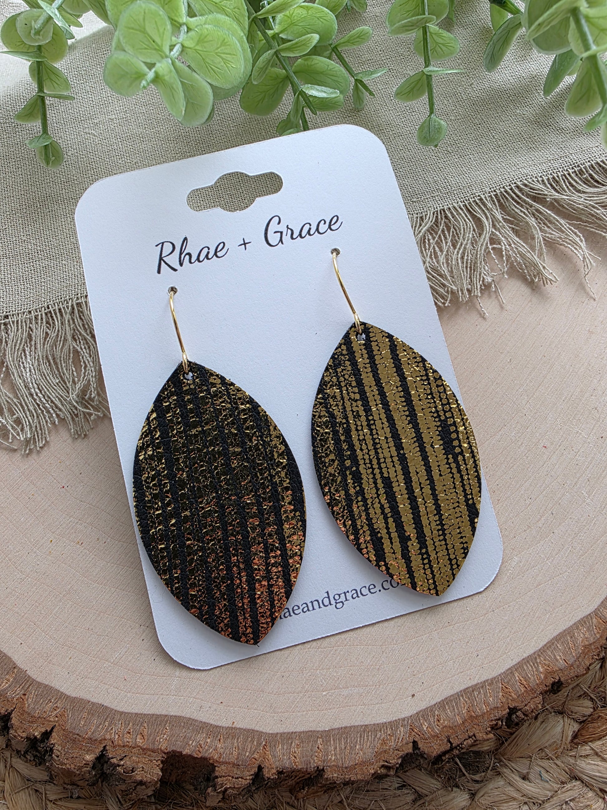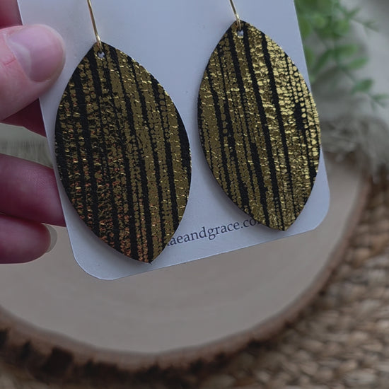Black and gold leaf earrings made with genuine leather and gold toned stainless steel earhooks (hypoallergenic & tarnish resistant).