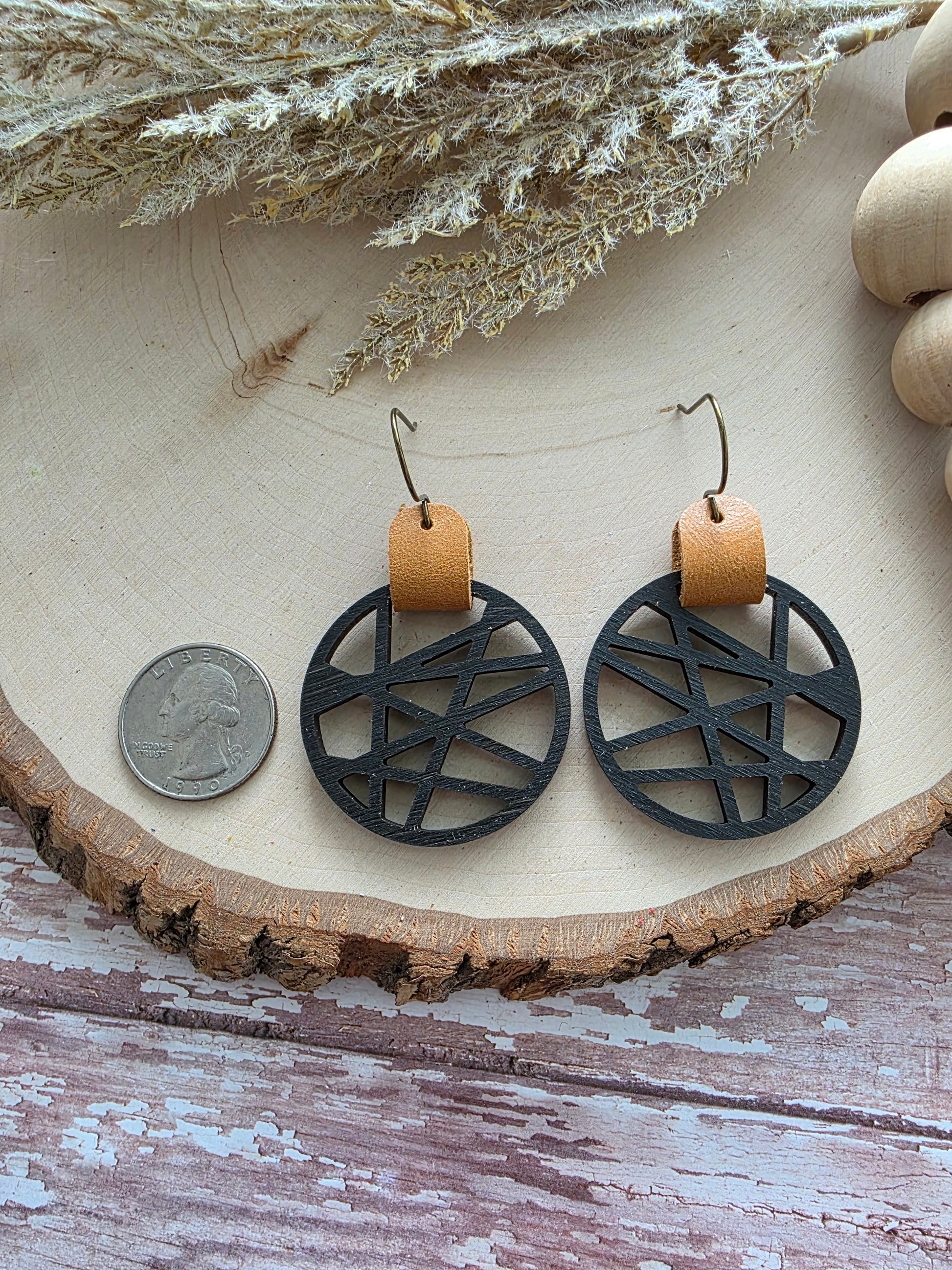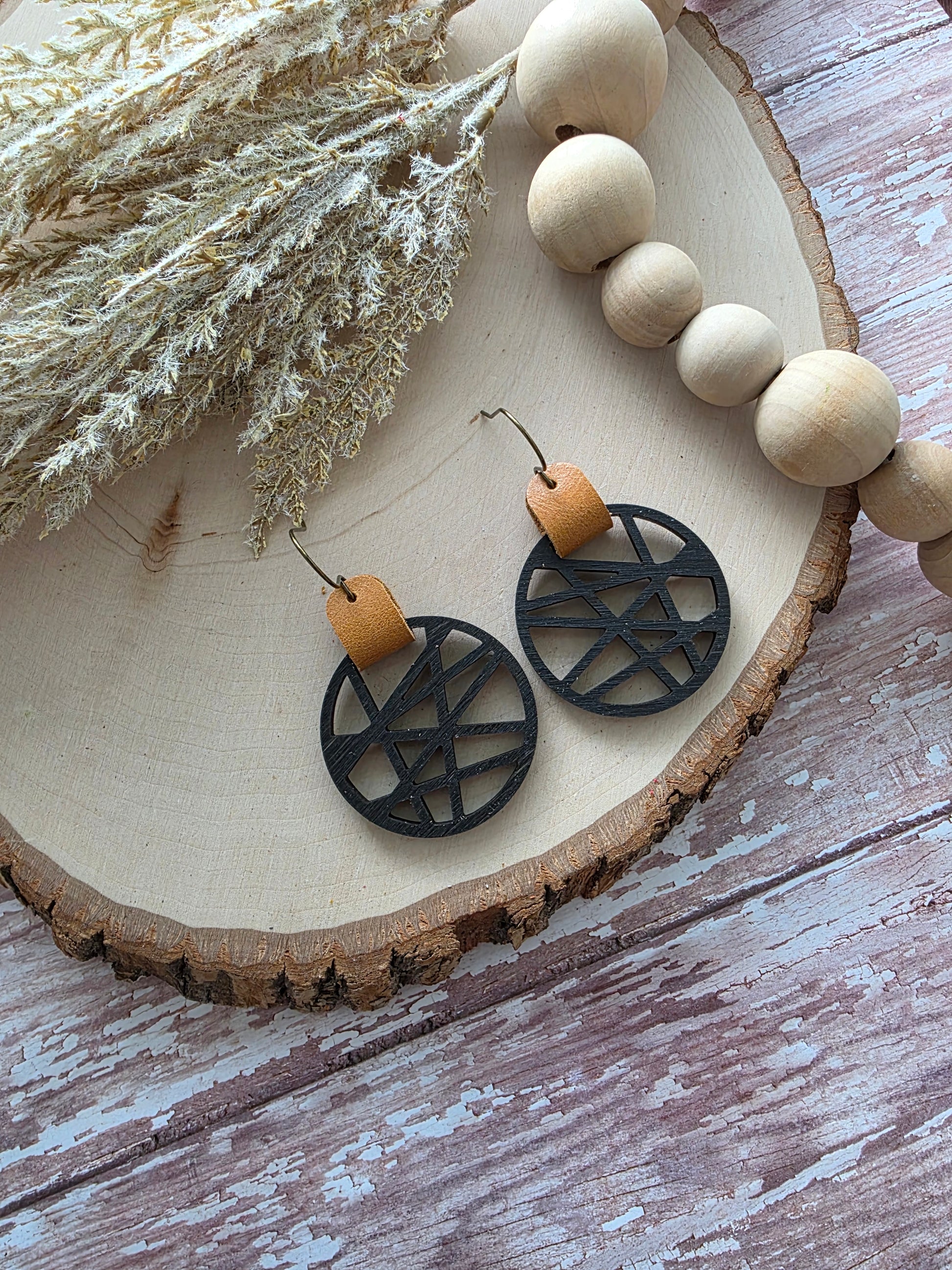 Black and brown abstract Criss-cross earrings with Criss-cross wood piece and genuine leather loop at top made with antique bronze toned stainless steel earhooks (hypoallergenic & tarnish resistant).
