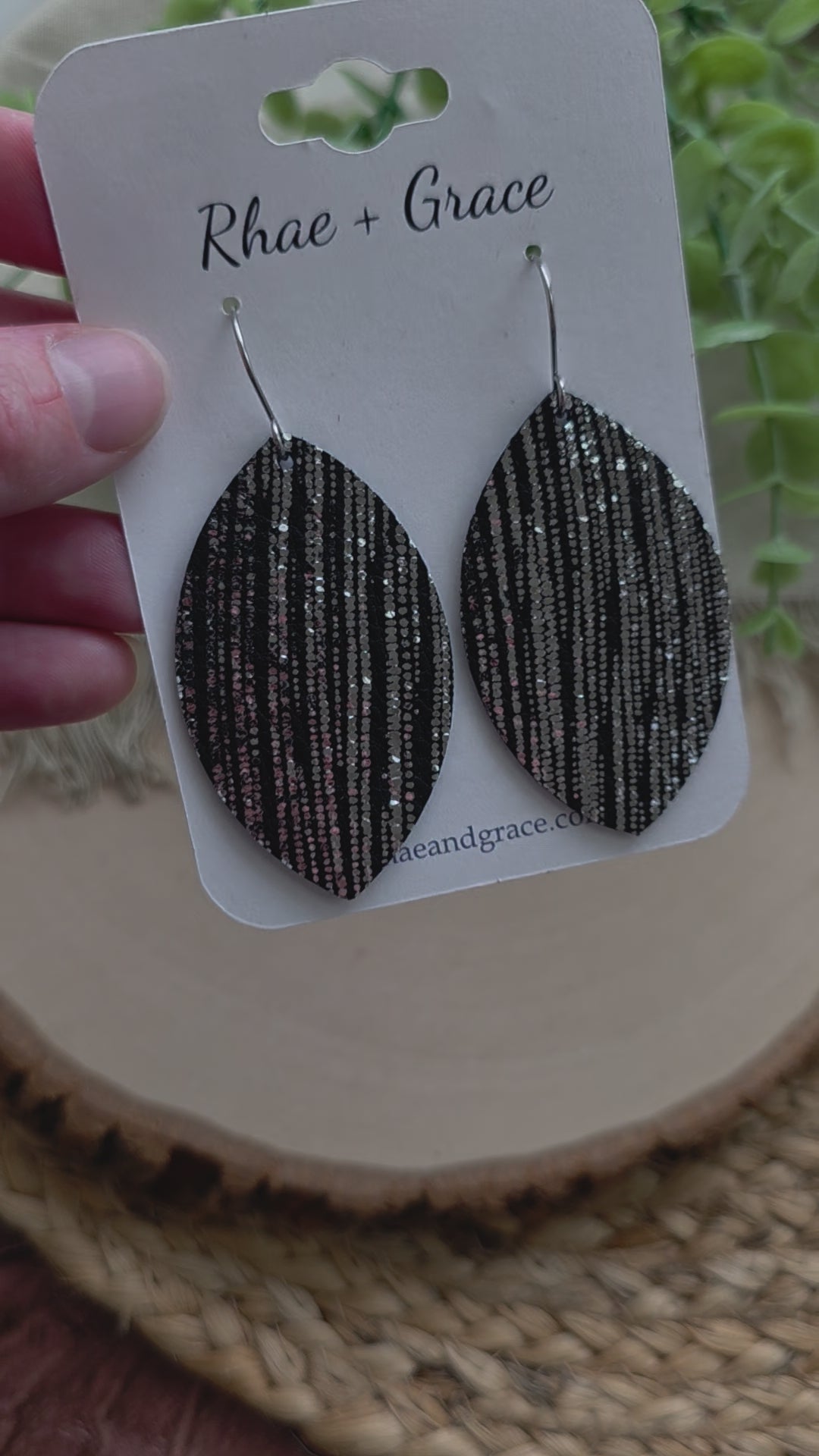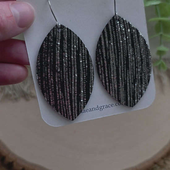 Black and silver leaf earrings made with genuine leather and stainless steel earhooks (hypoallergenic & tarnish resistant).