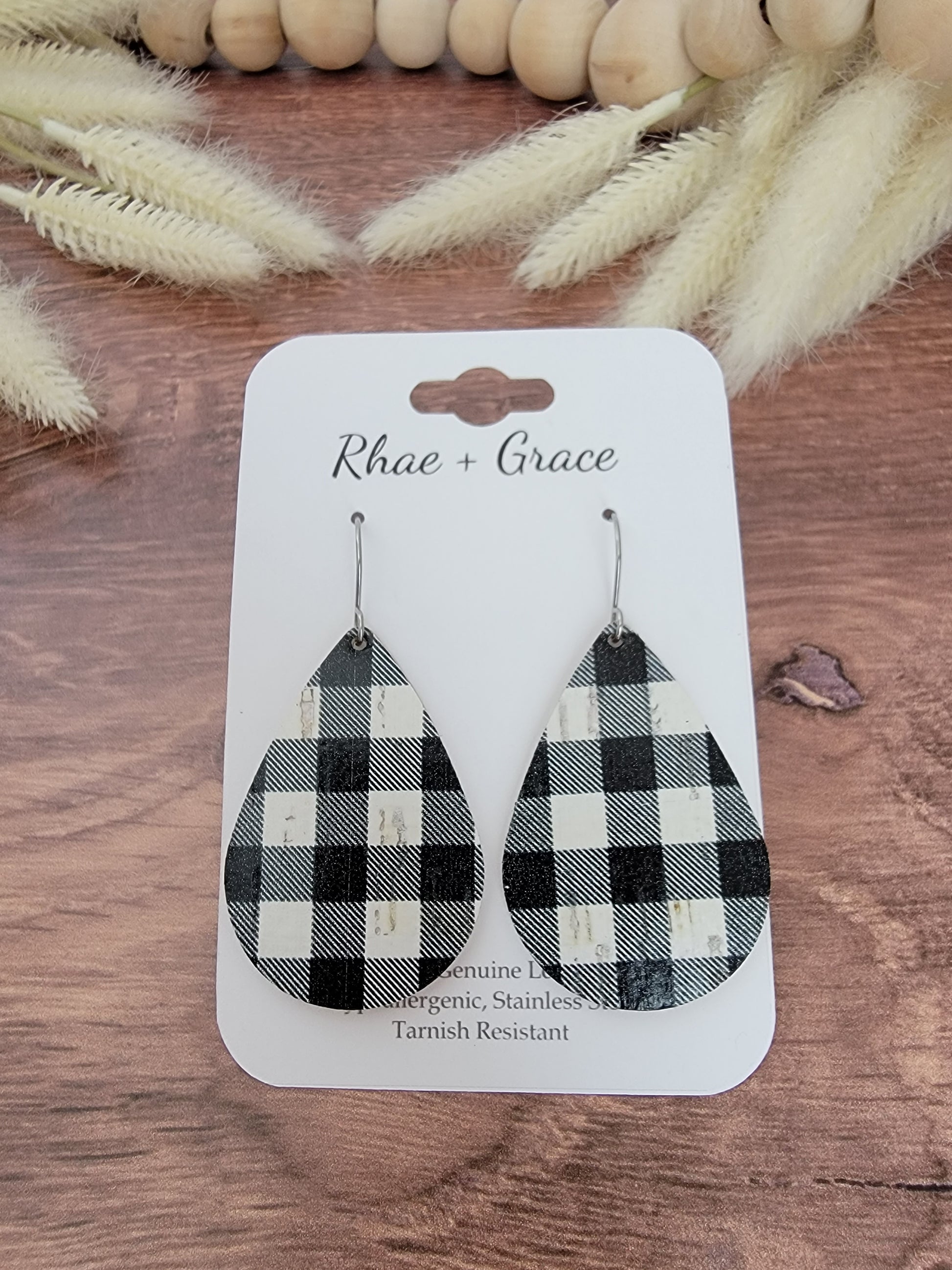 Black and white buffalo plaid teardrop earrings made with genuine leather backed cork and stainless steel earhooks (hypoallergenic & tarnish resistant).