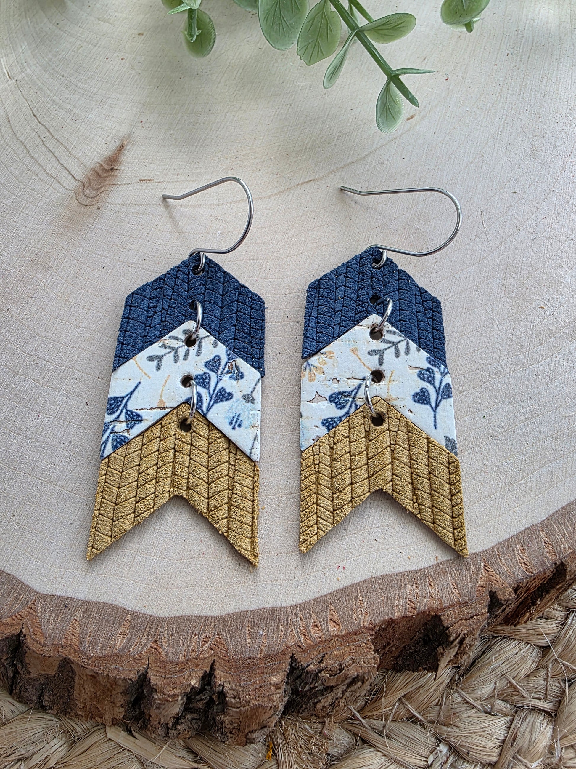 Blue and mustard floral triple chevron earrings made with genuine leather backed cork and stainless steel hardware (hypoallergenic & tarnish resistant).