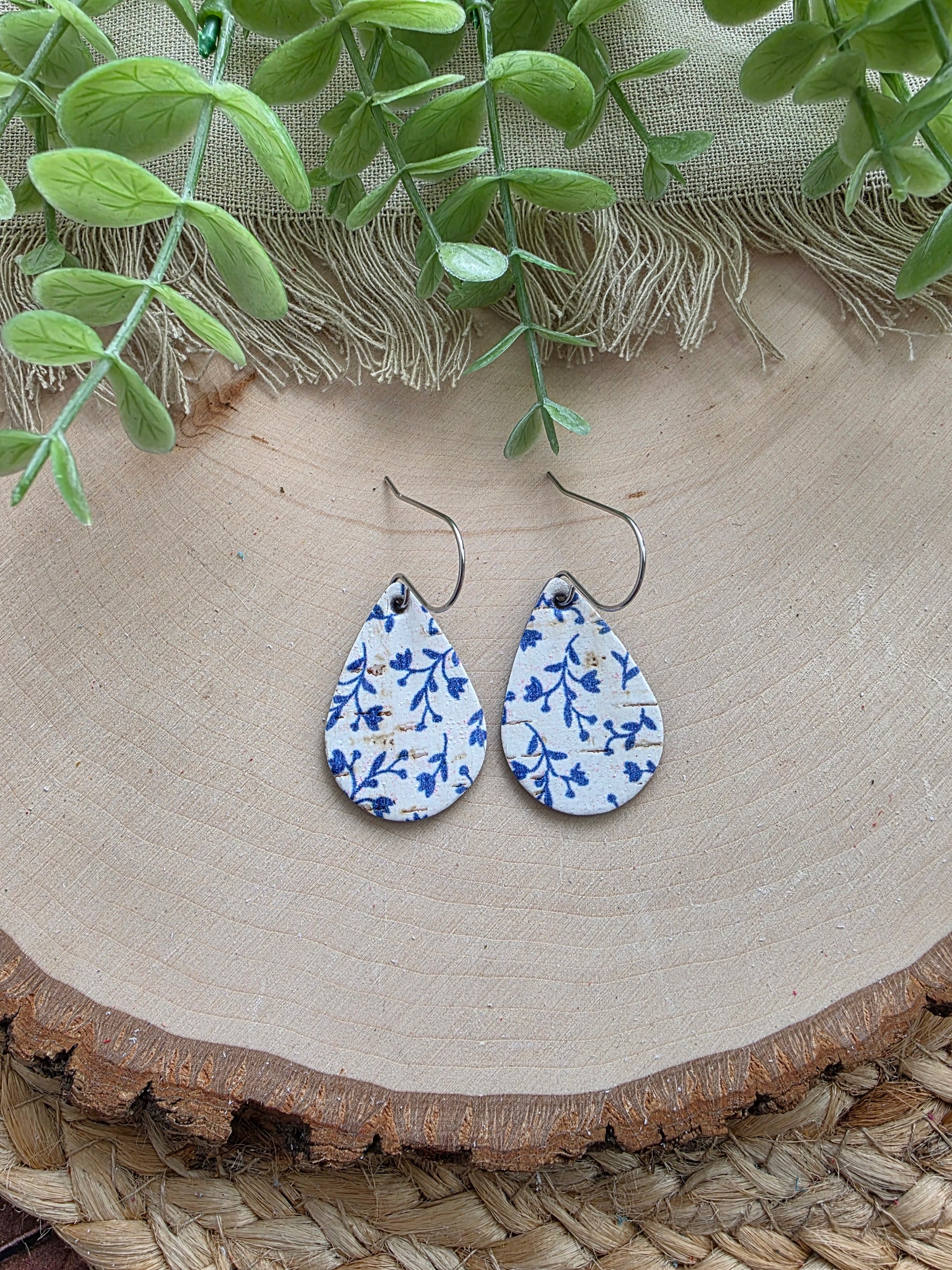 Bluebell blue and white small teardrop earrings made with genuine leather and stainless steel earhooks (hypoallergenic & tarnish resistant).