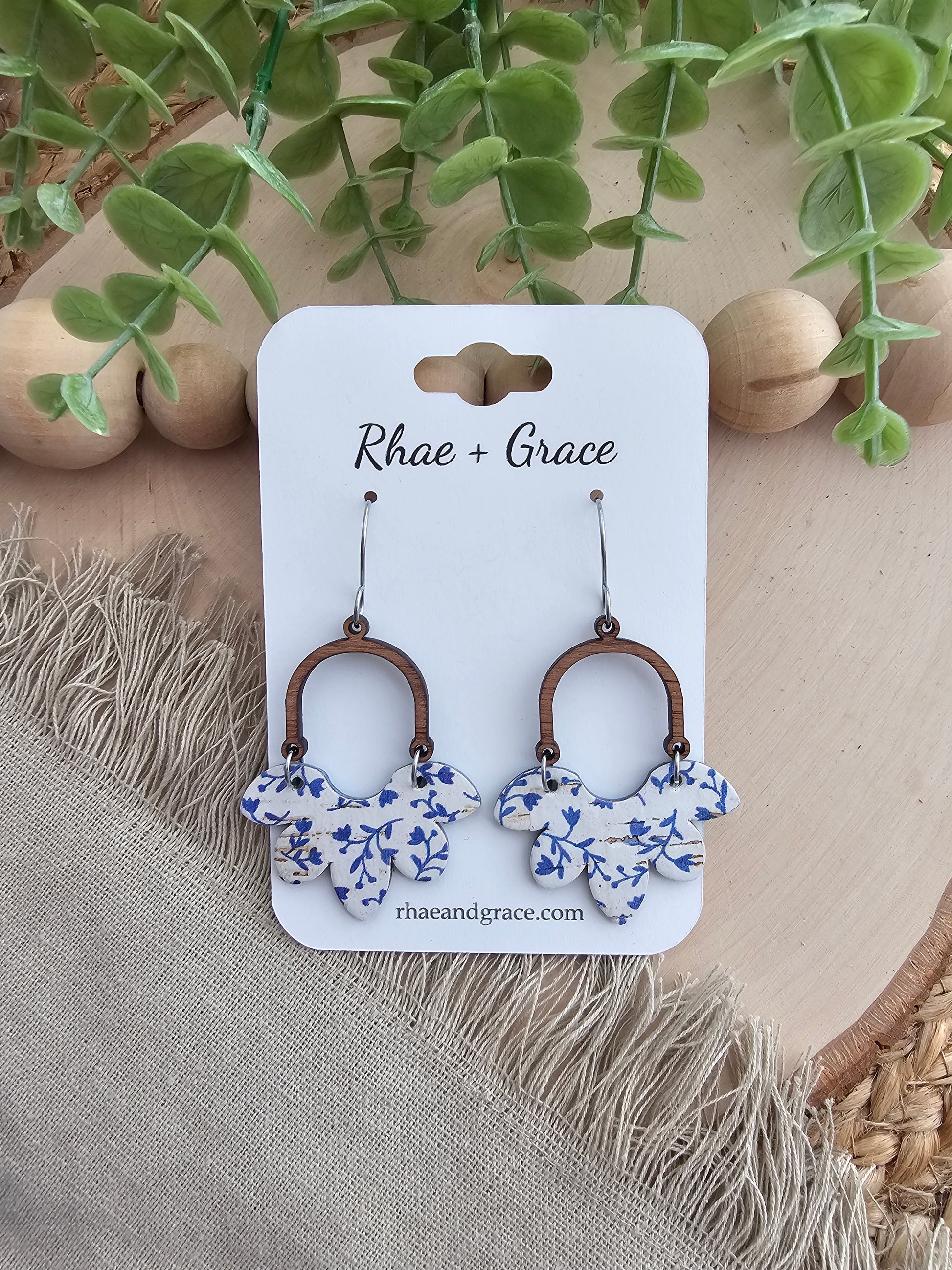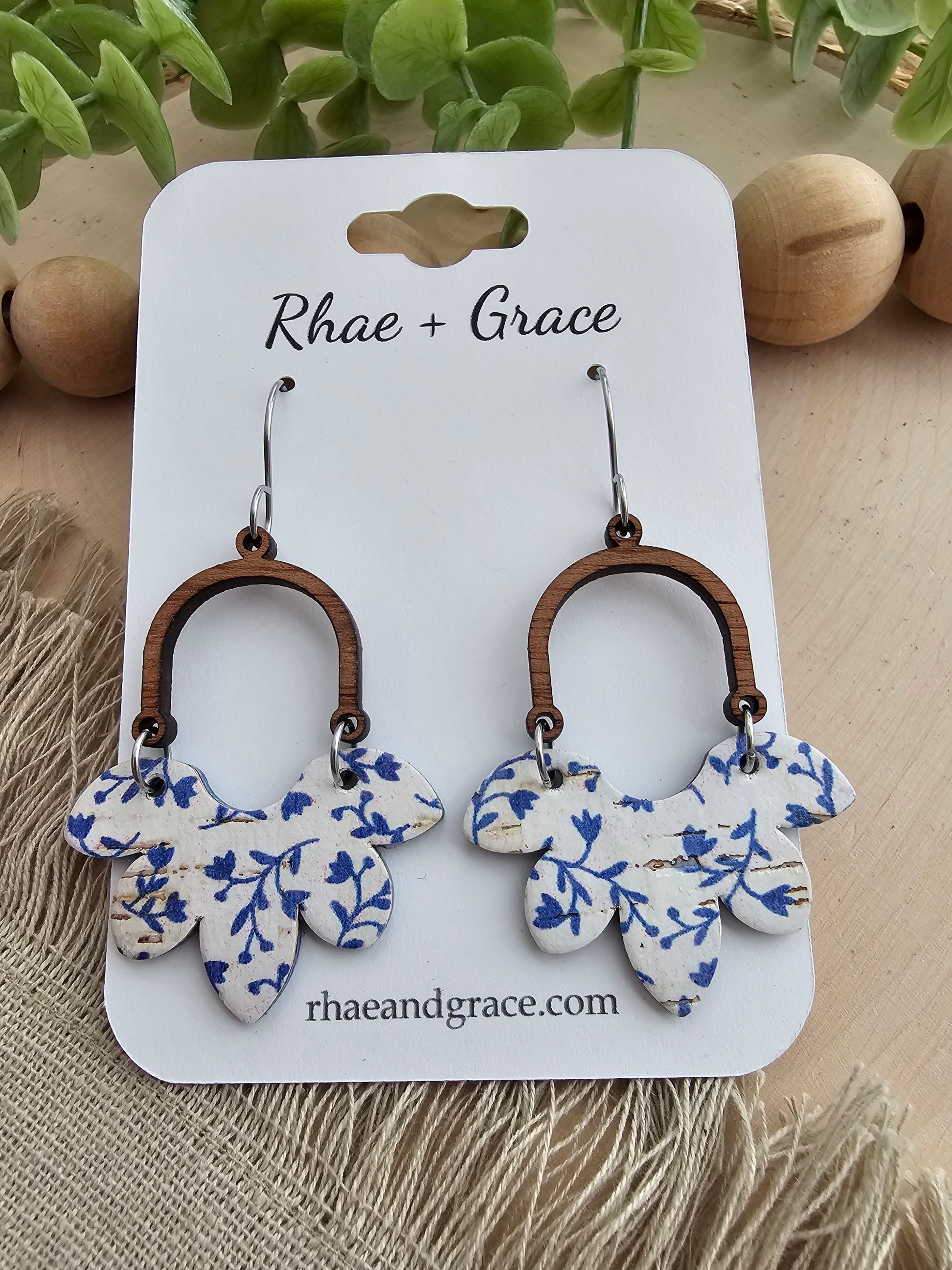 Bluebell blue and white floral earrings made of genuine leather backed cork and stainless steel earhooks (hypoallergenic & tarnish resistant.)