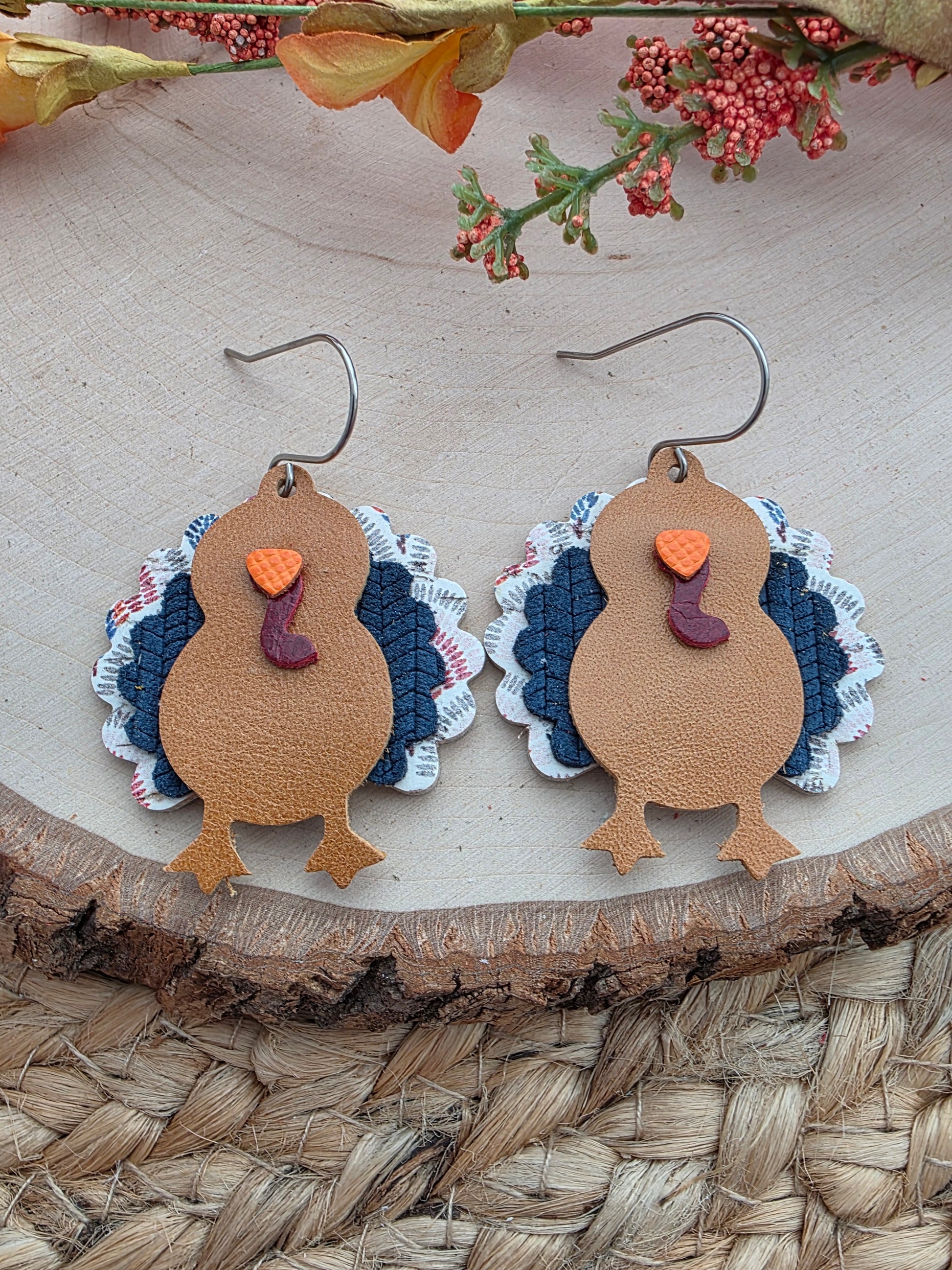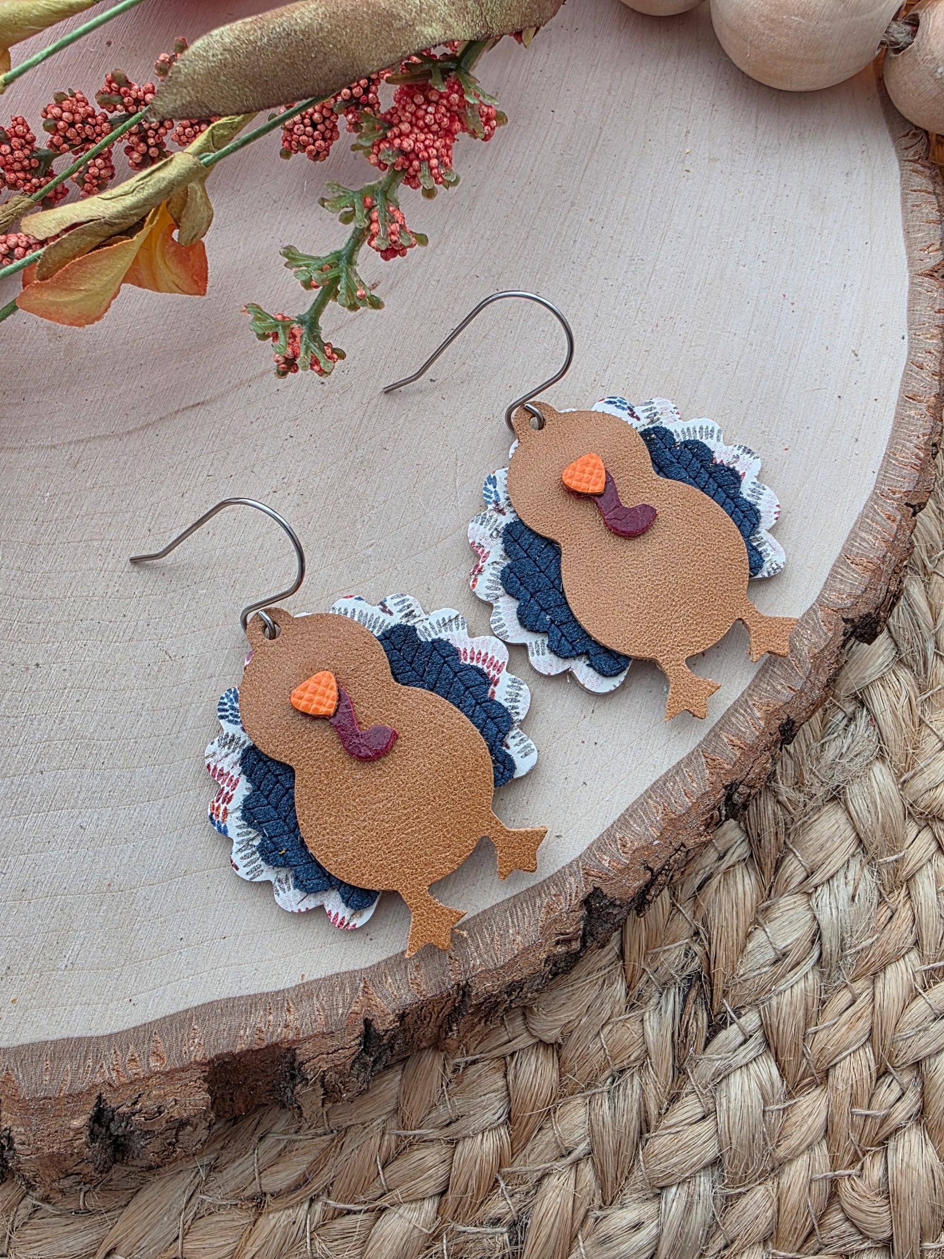 Boho scallops and navy blue turkey earrings made with genuine leather and stainless steel hooks (hypoallergenic & tarnish resistant).
