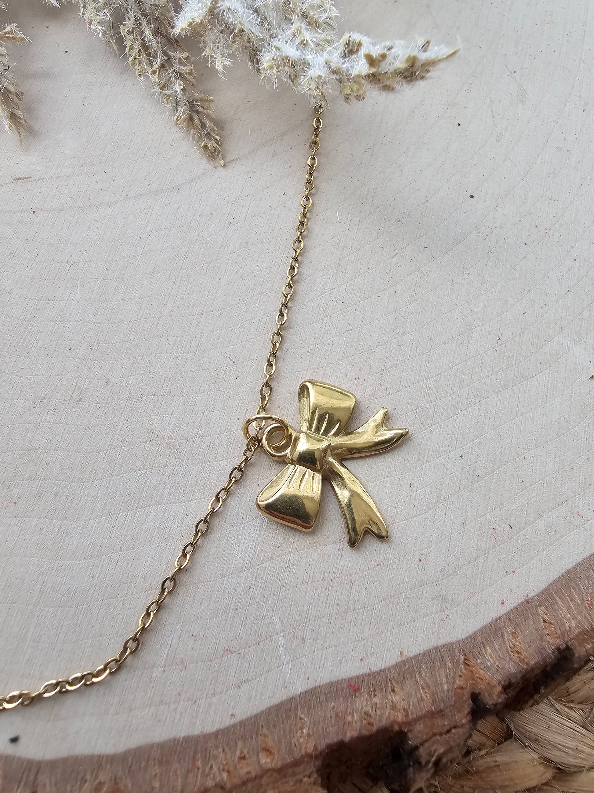 Bow necklace in gold plated stainless steel.