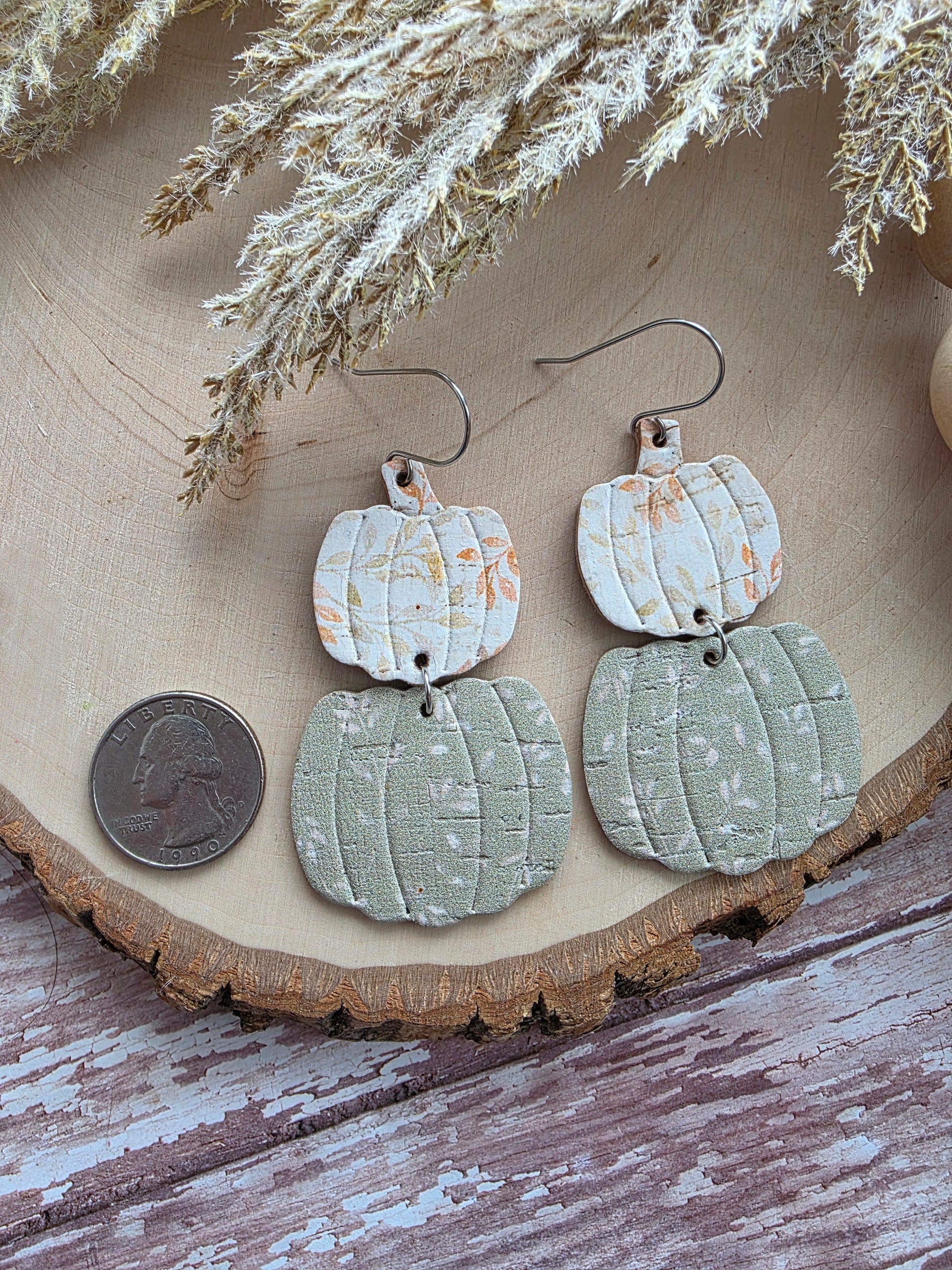 Cinderella stacked pumpkin earrings made with genuine leather backed cork and stainless steel hardware (hypoallergenic and tarnish resistant).