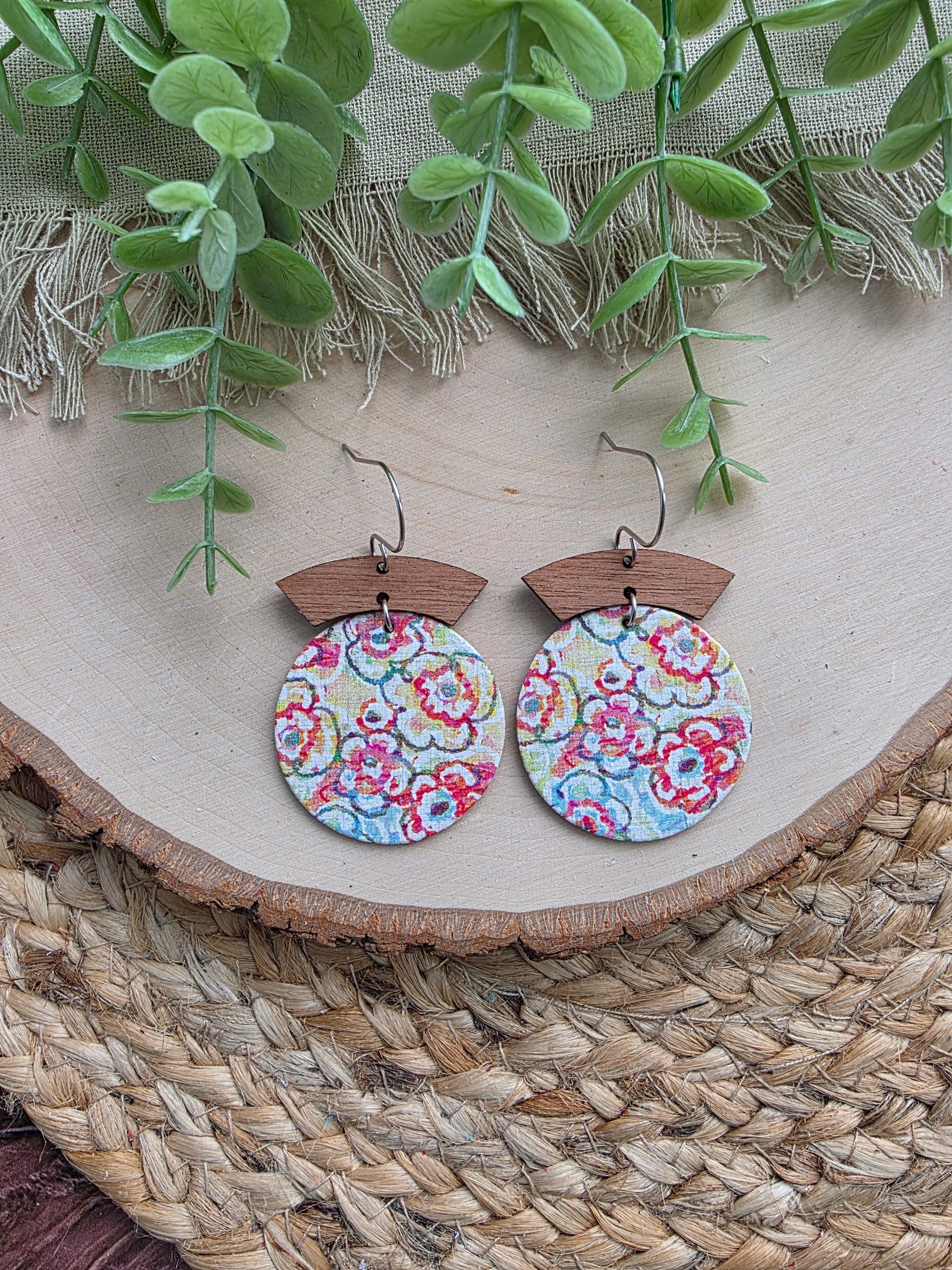 Colorful sketched floral earrings made with genuine leather backed cork, wood arc connector and stainless steel hardware (hypoallergenic & tarnish resistant).
