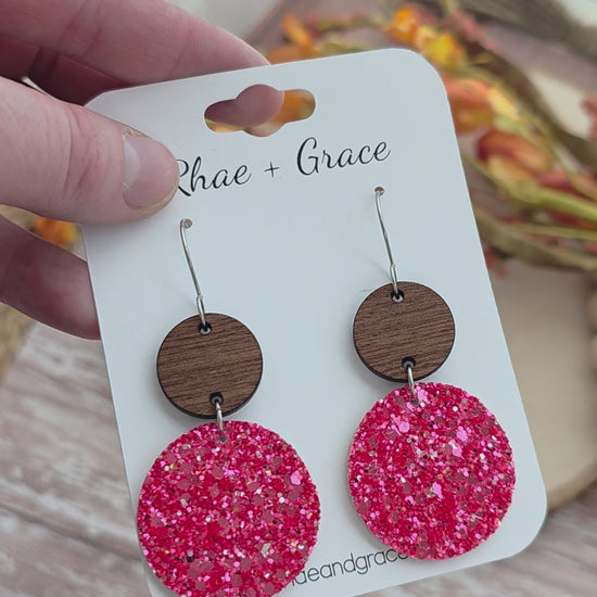 Coral glitter circle drop earrings made with genuine leather backed cork, wood circle and stainless steel earhooks (hypoallergenic & tarnish resistant).