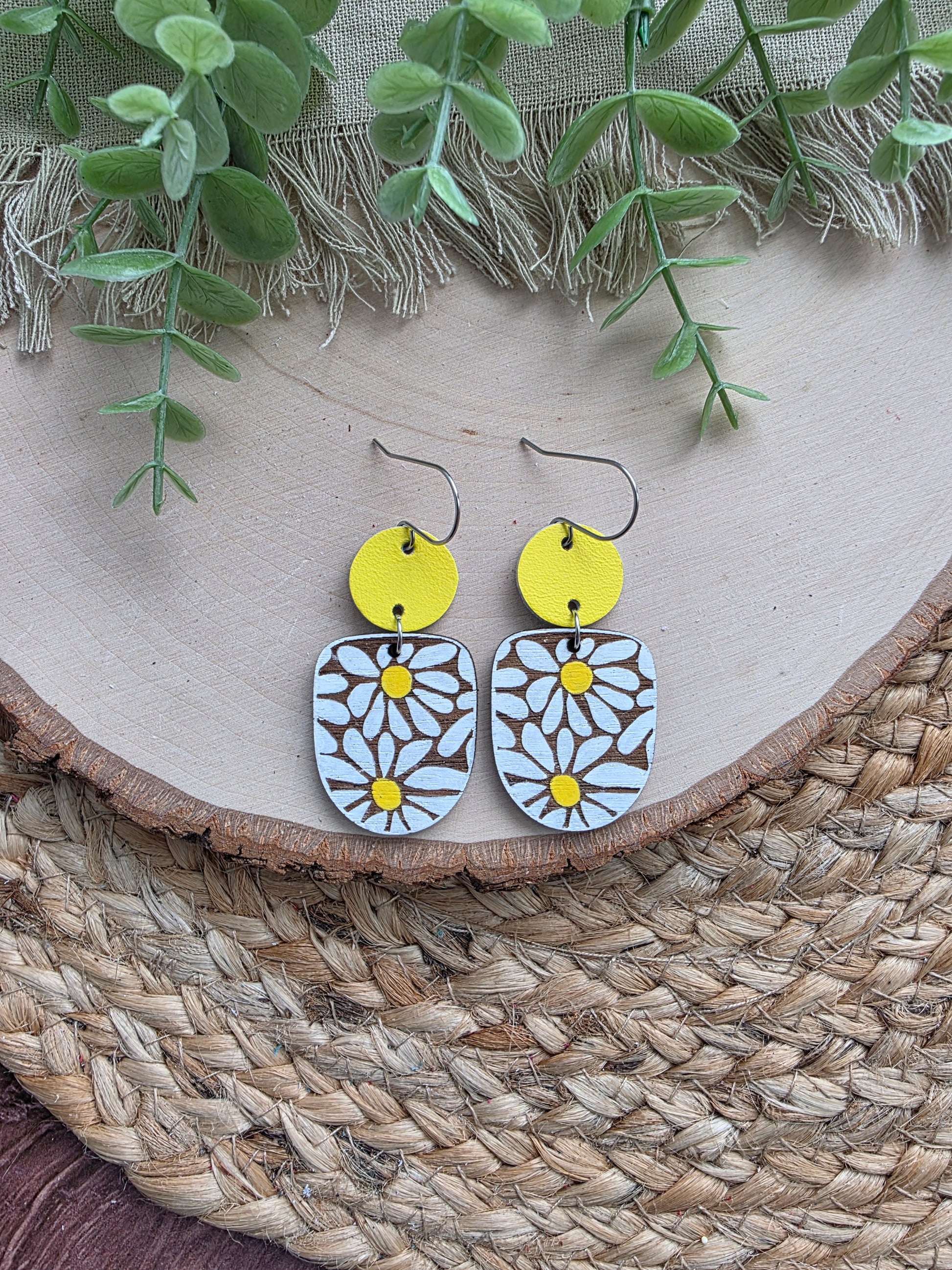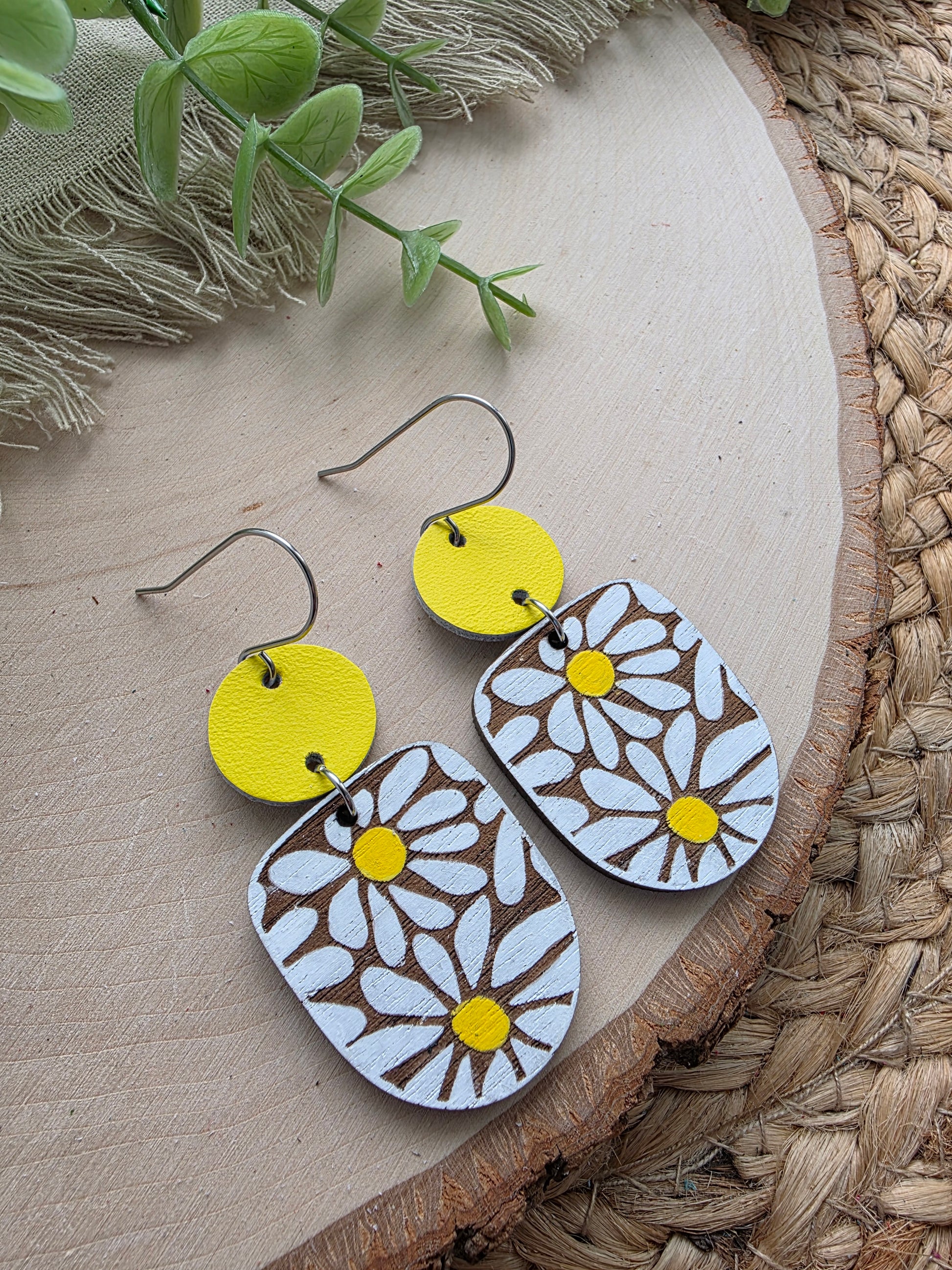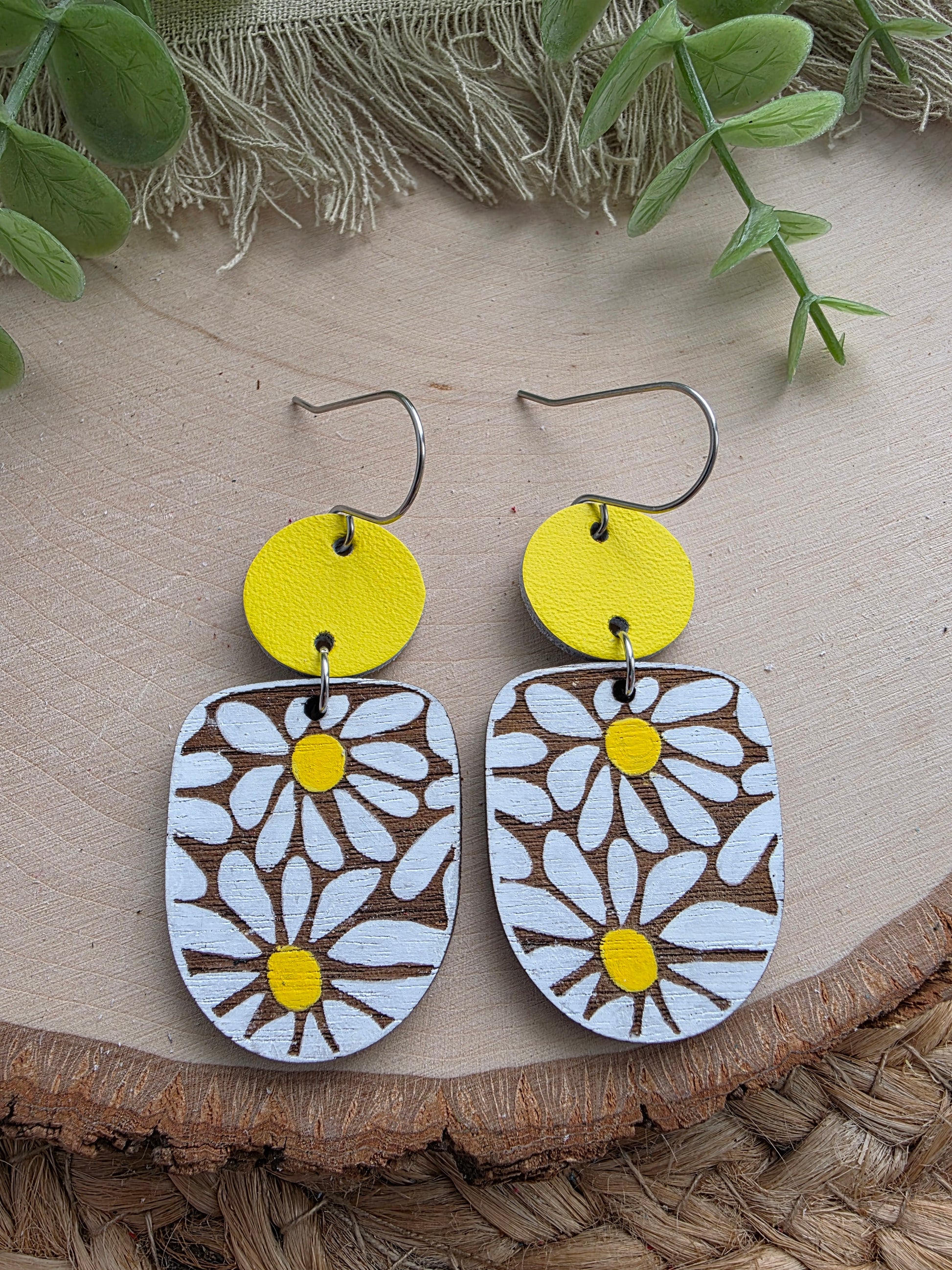 Daisy Earrings made with handpainted wood, yellow leather connectors and stainless steel hardware (hypoallergenic and tarnish resistant).