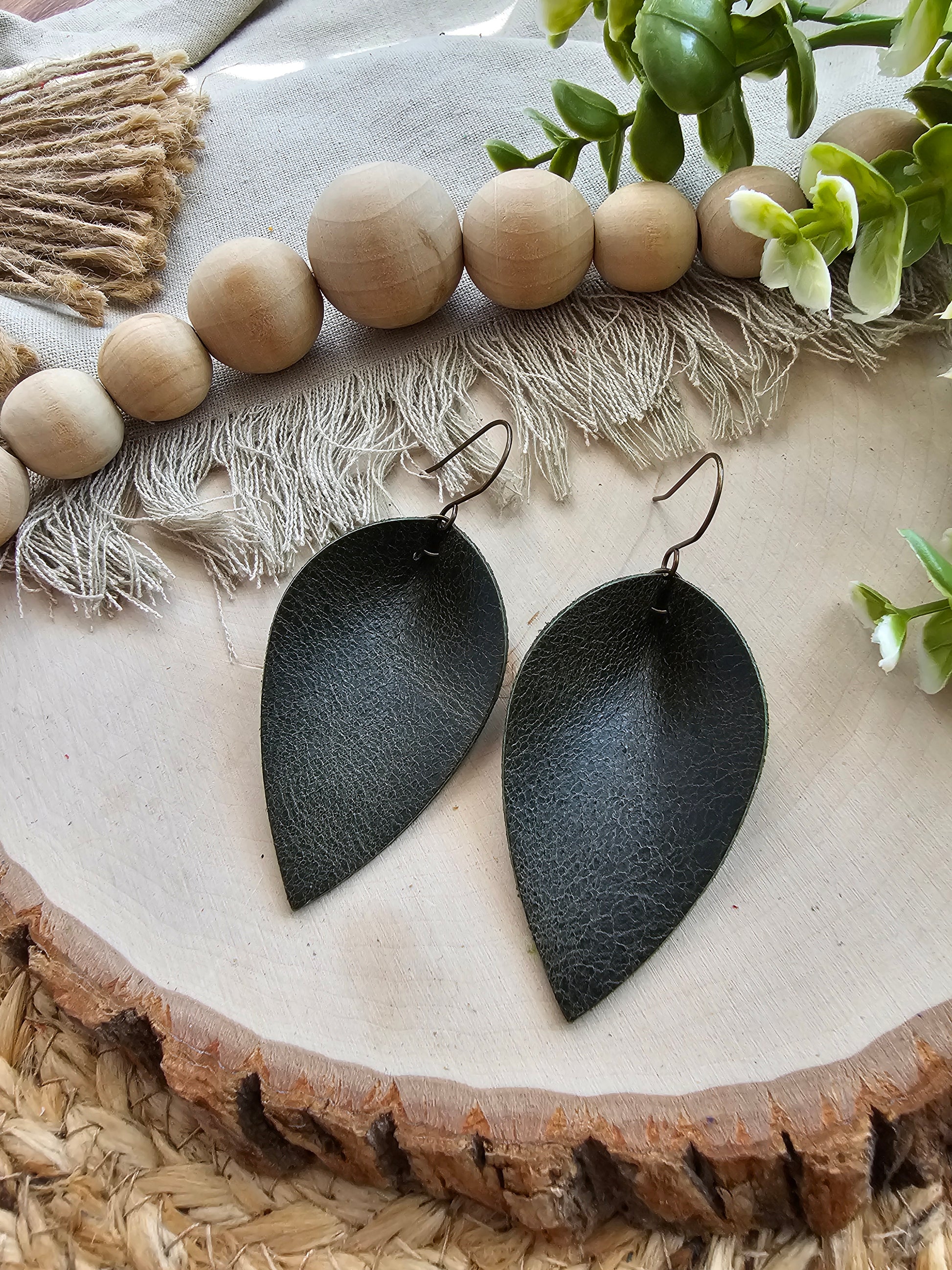 Deep green pinched petal earrings made with genuine leather and antique bronze toned stainless steel hardware (hypoallergenic & tarnish resistant).