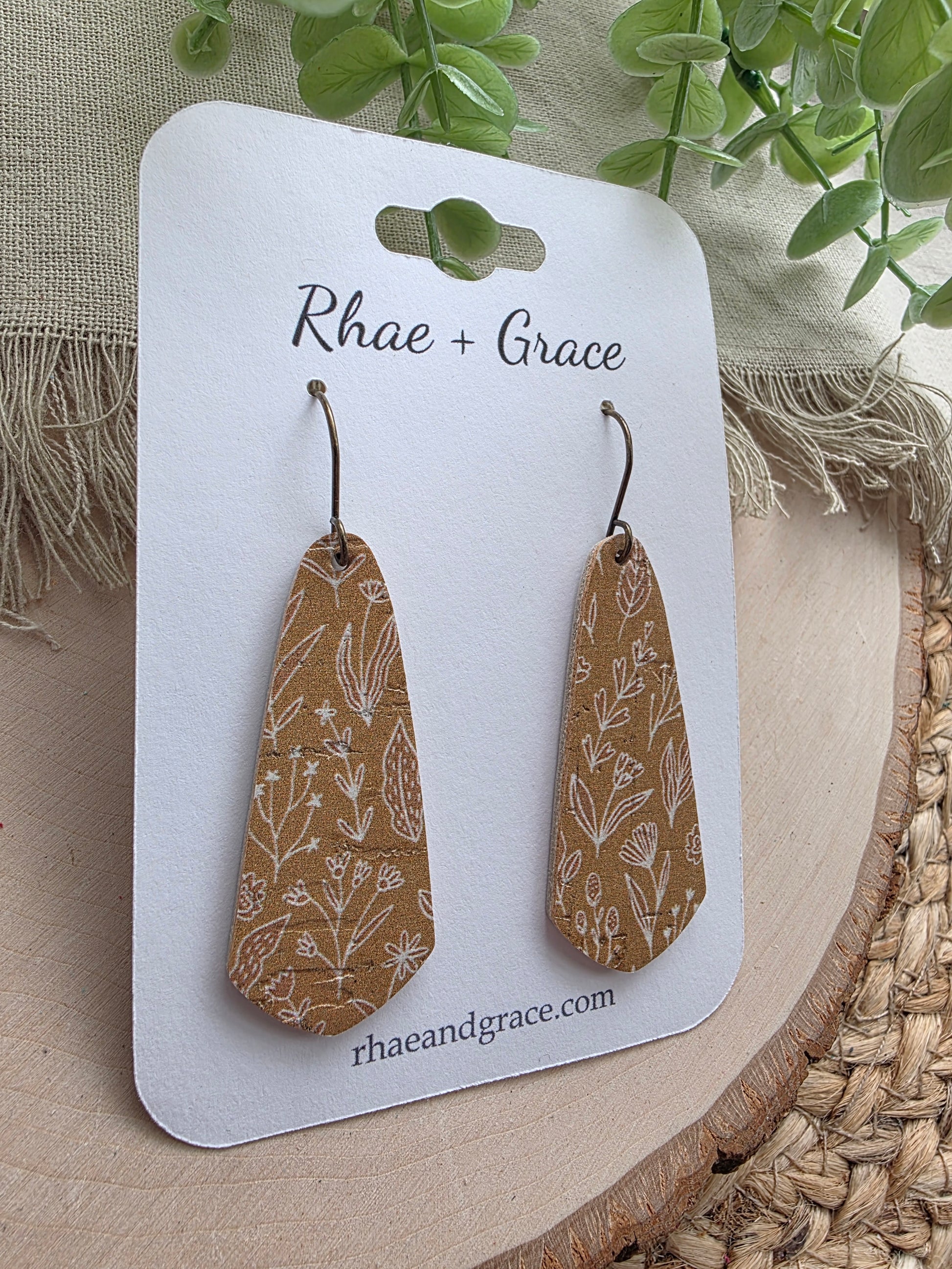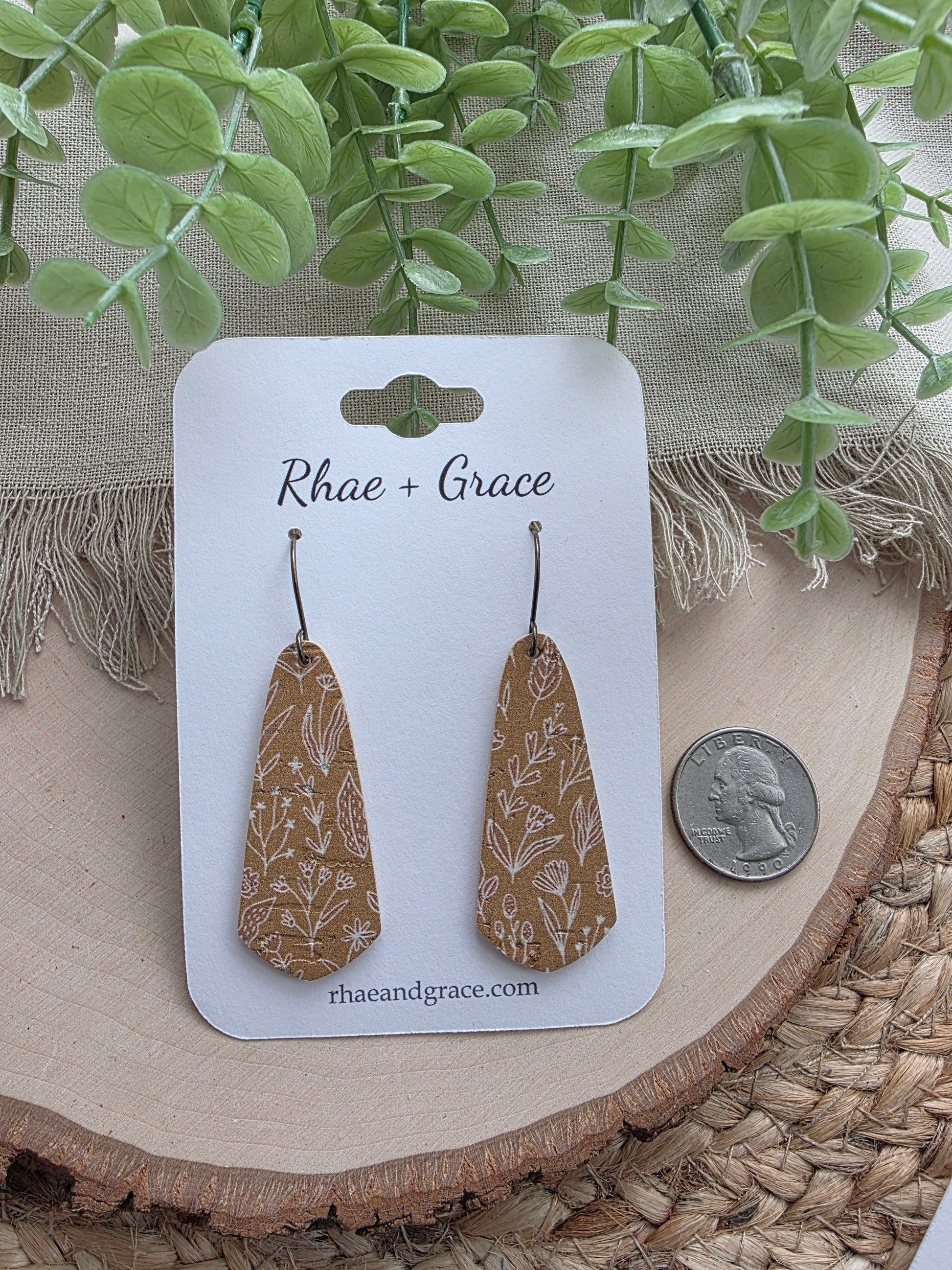 Dijon brown and cream floral skinny drop earrings made with leather backed glitter and antique bronze stainless steel hardware (hypoallergenic and tarnish resistant).