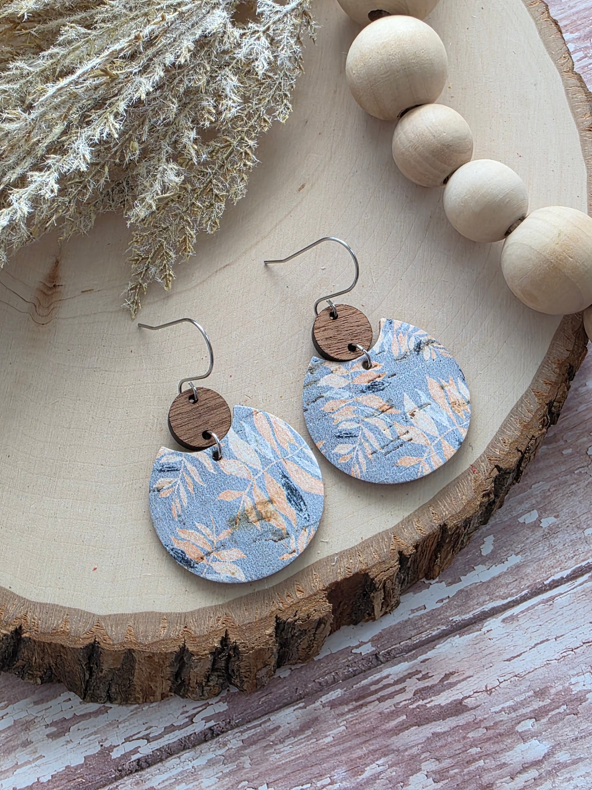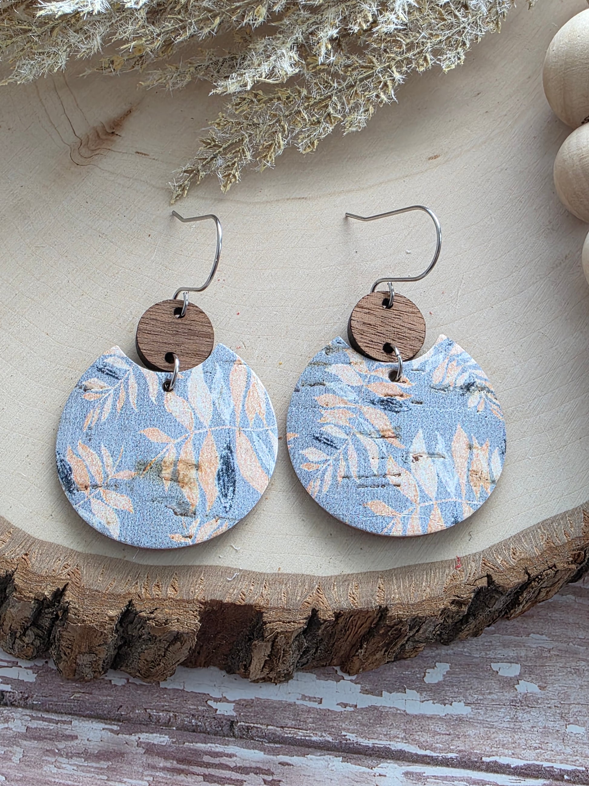 Dusty blue autumn palms circle earrings made with genuine leather backed cork in a dusty blue background, peach and cream leaves and small navy accents, stainless steel hardware (hypoallergenic & tarnish resistant).