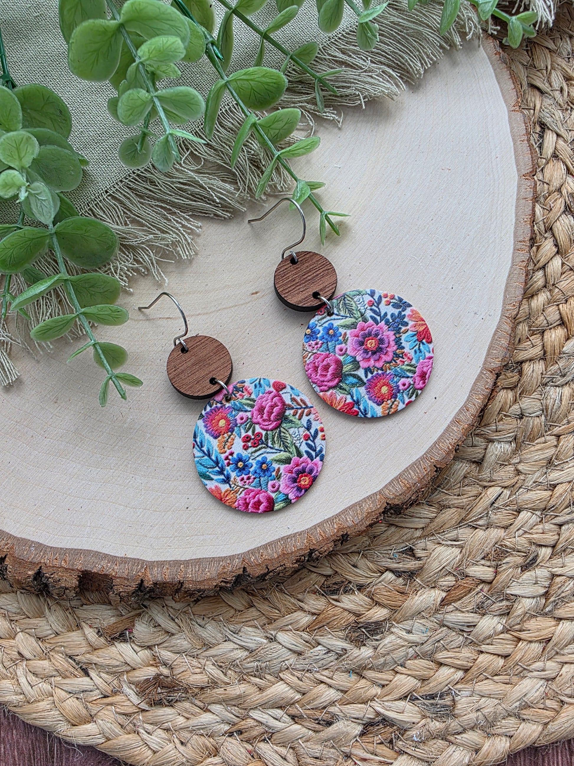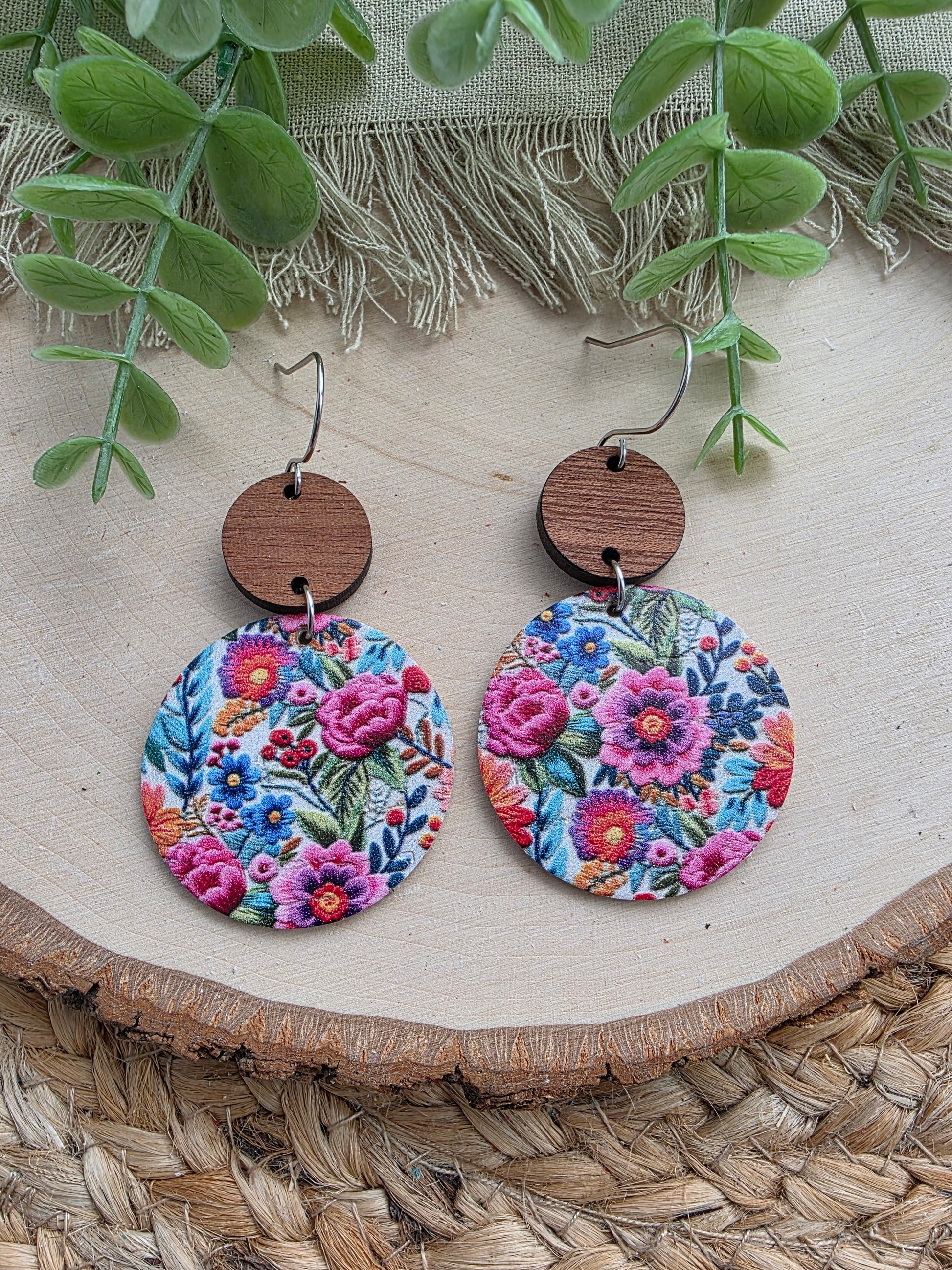 Fiesta floral earrings made with genuine leather backed cork, black stained wood connector and stainless steel hardware (hypoallergenic & tarnish resistant).