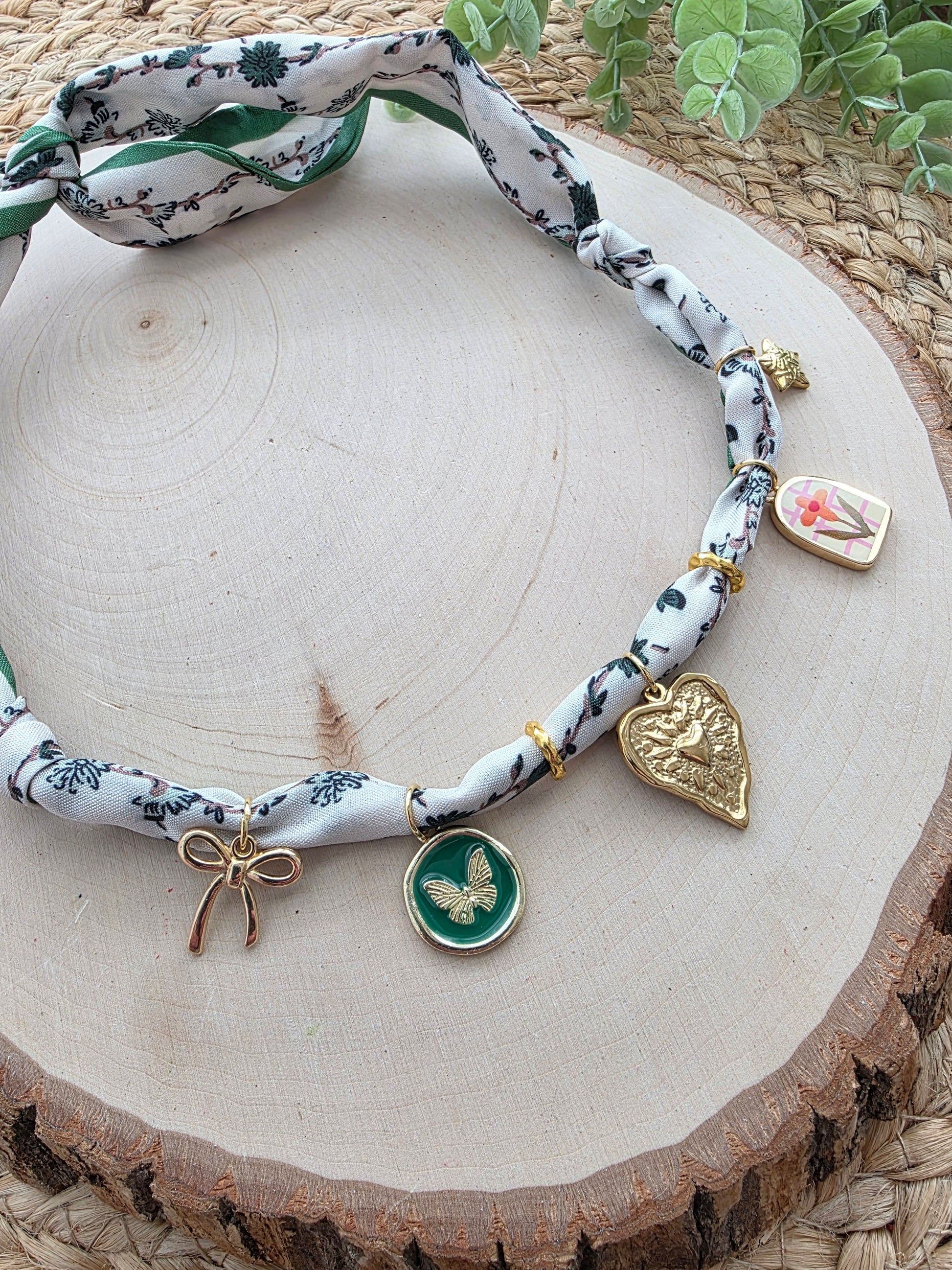 Handmade with care, each scarf charm necklace is truly one of a kind. The silky, lightweight scarf is crafted from a soft, silk-like material and tied in the back, making it adjustable for the perfect fit. Each necklace features its own unique charms, so each one is unique — a special piece that’s as individual as you are.