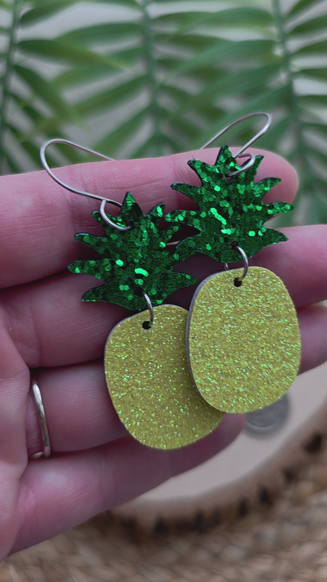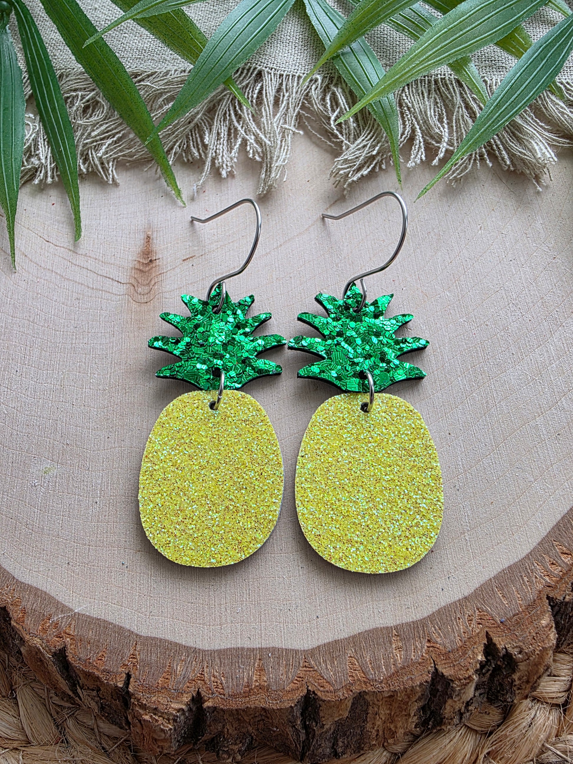 Glitter pineapple earrings made with genuine leather backed cork and stainless steel earhooks (hypoallergenic & tarnish resistant).