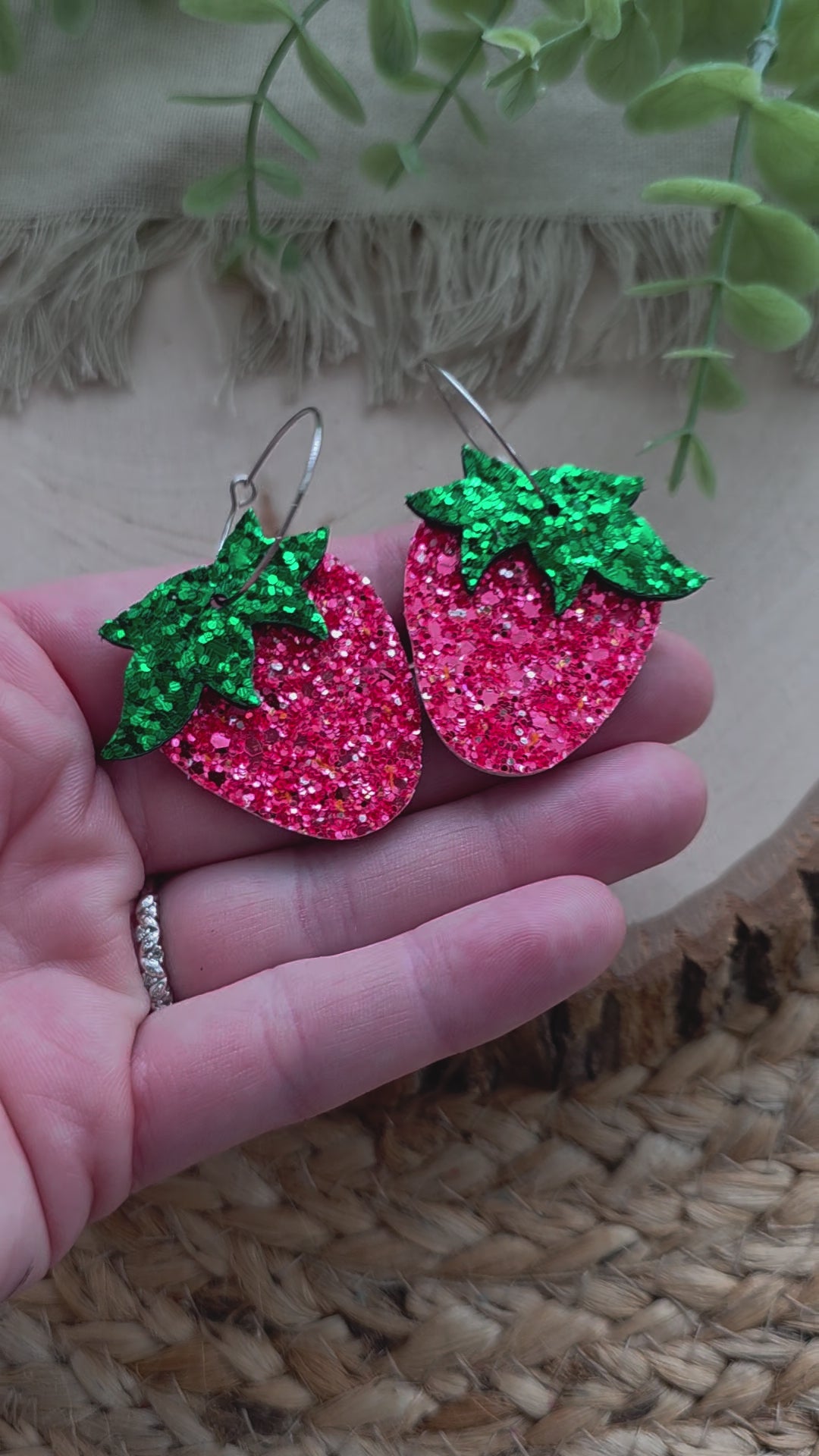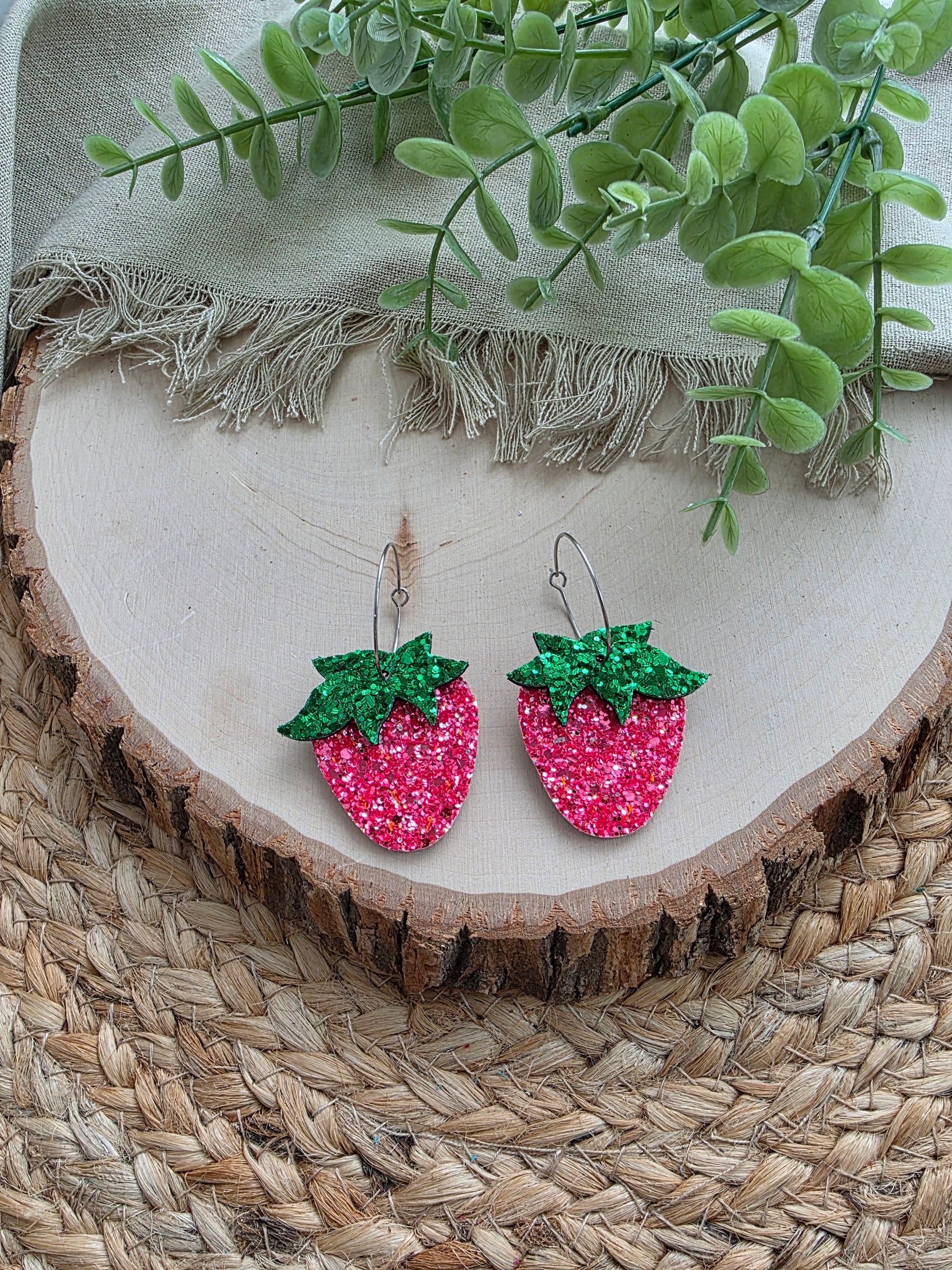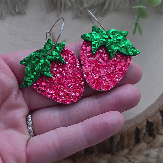 Glitter strawberry earrings made with genuine leather backed glitter and stainless steel 25mm simple hoops (hypoallergenic and tarnish resistant).