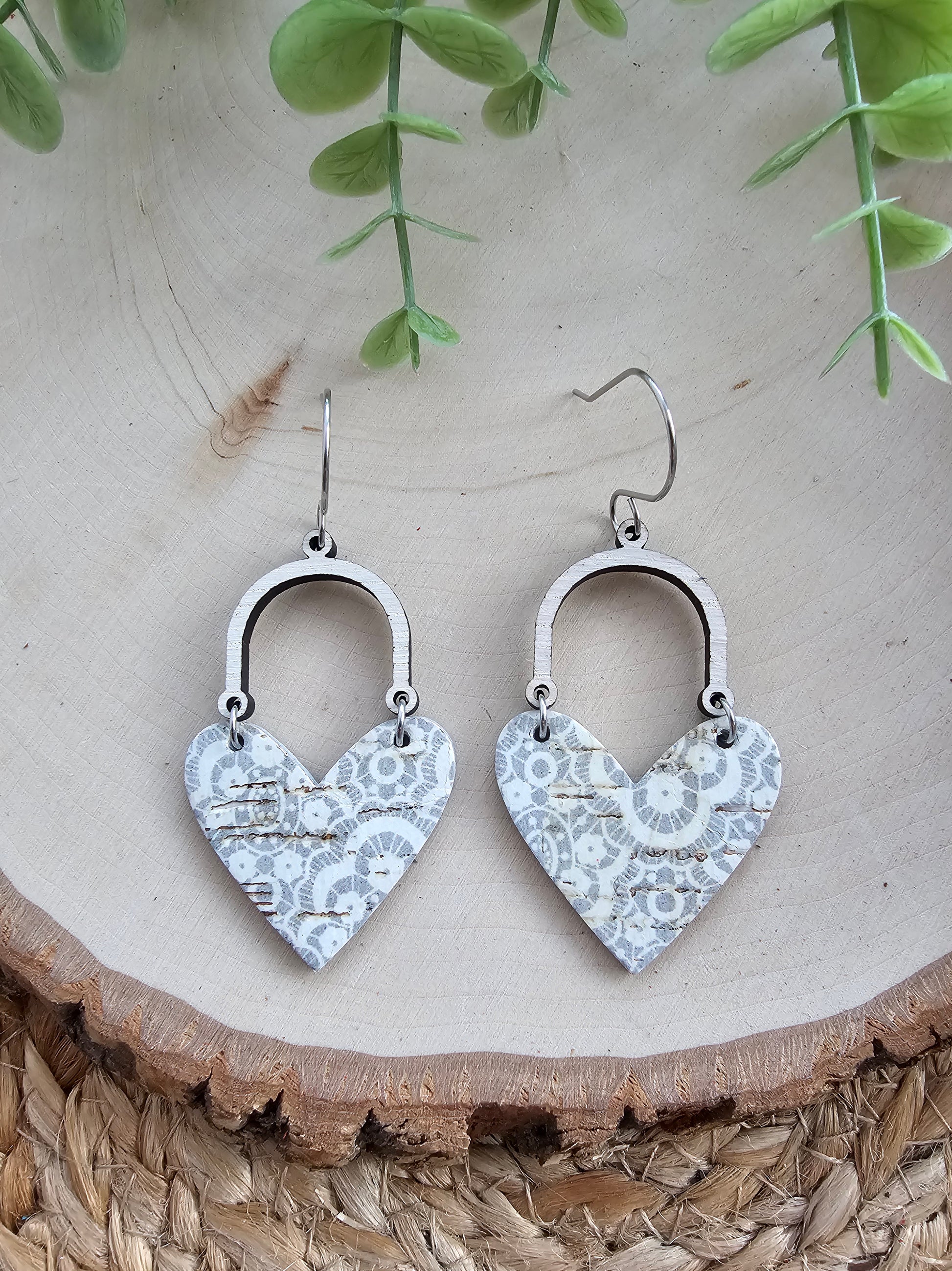 Gray and white lace doily heart arch earrings made with genuine leather backed cork, wood arch and stainless steel hardware (hypoallergenic & tarnish resistant).
