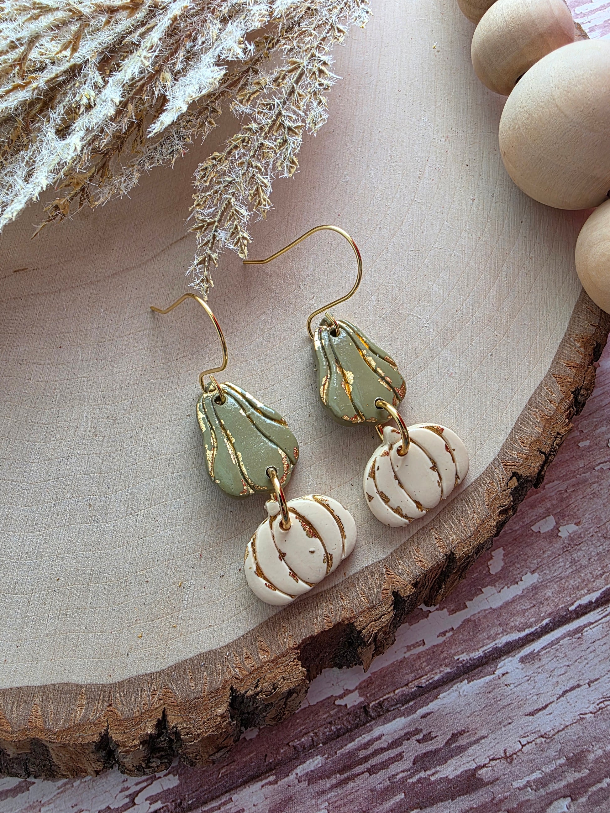 Green and cream stacked goards with gold made with polymer clay and gold toned stainless steel hardware (hypoallergenic and tarnish resistant)
