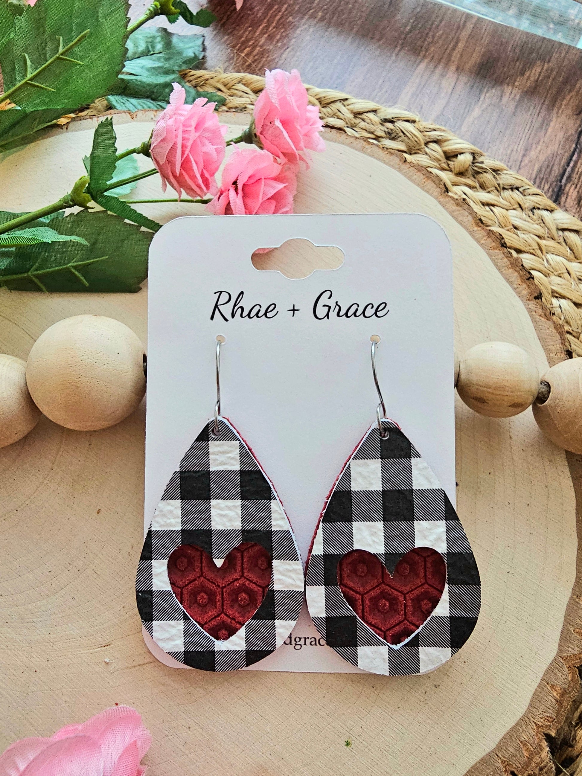 Layered black and white buffalo plaid heart cutout teardrop earrings made with genuine leather and stainless steel earhooks (hypoallergenic and tarnish resistant).