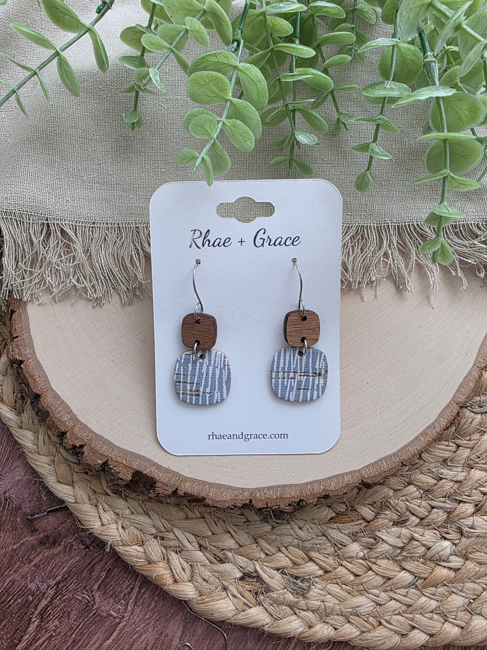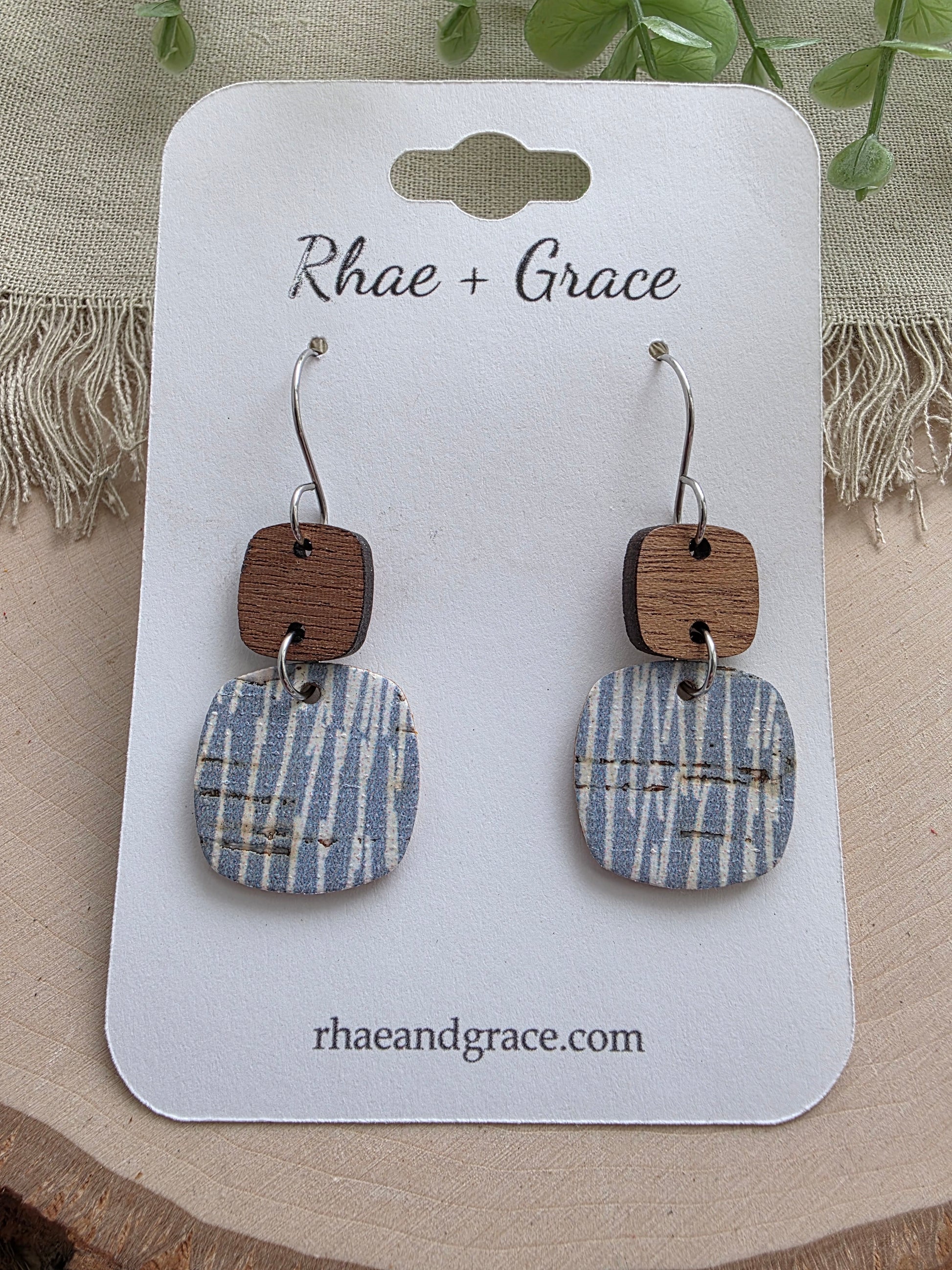 Light Blue and cream rounded square earrings are made with genuine leather backed cork, rounded square wood connector and stainless steel hardware (hypoallergenic and tarnish resistant).