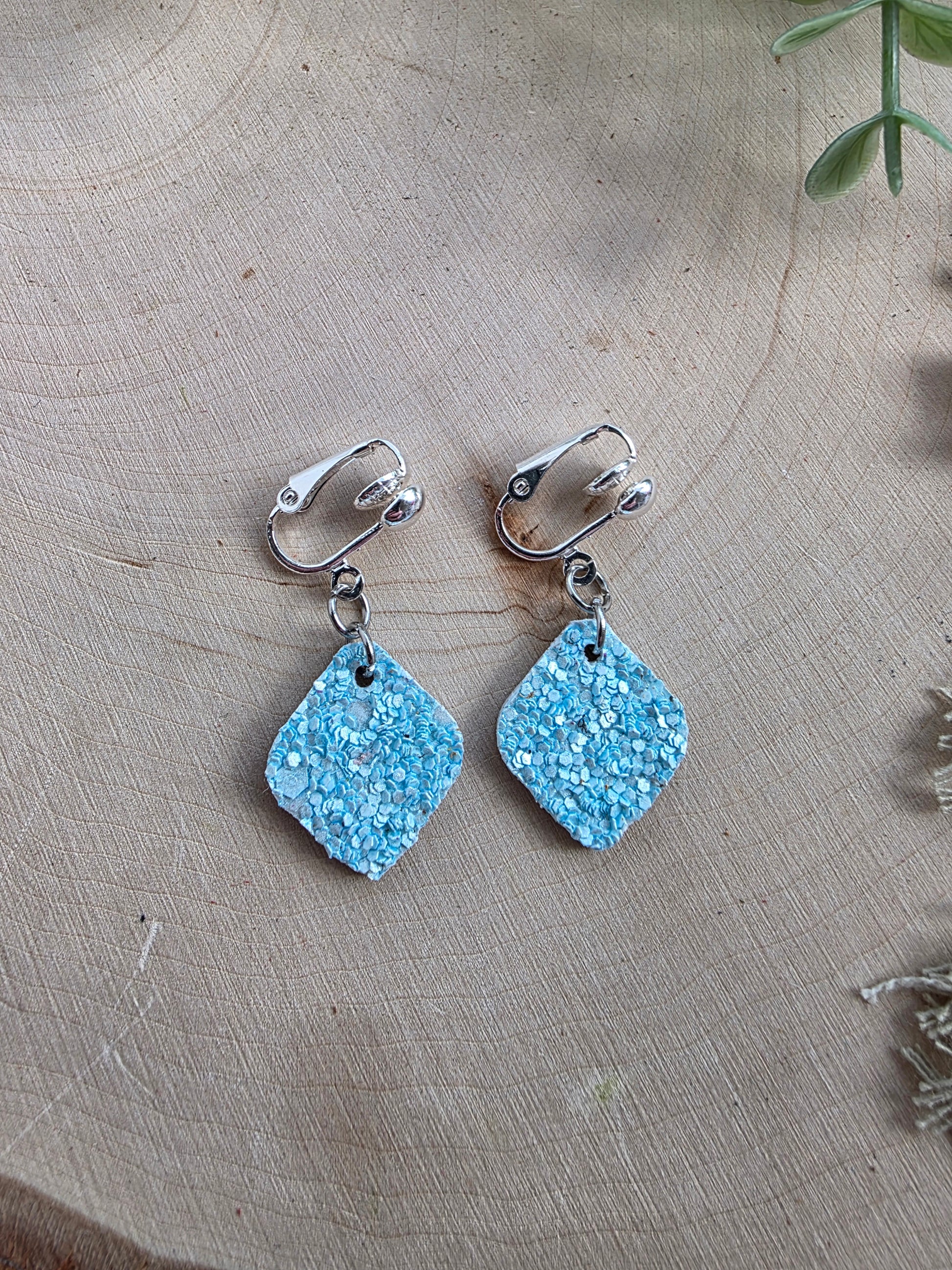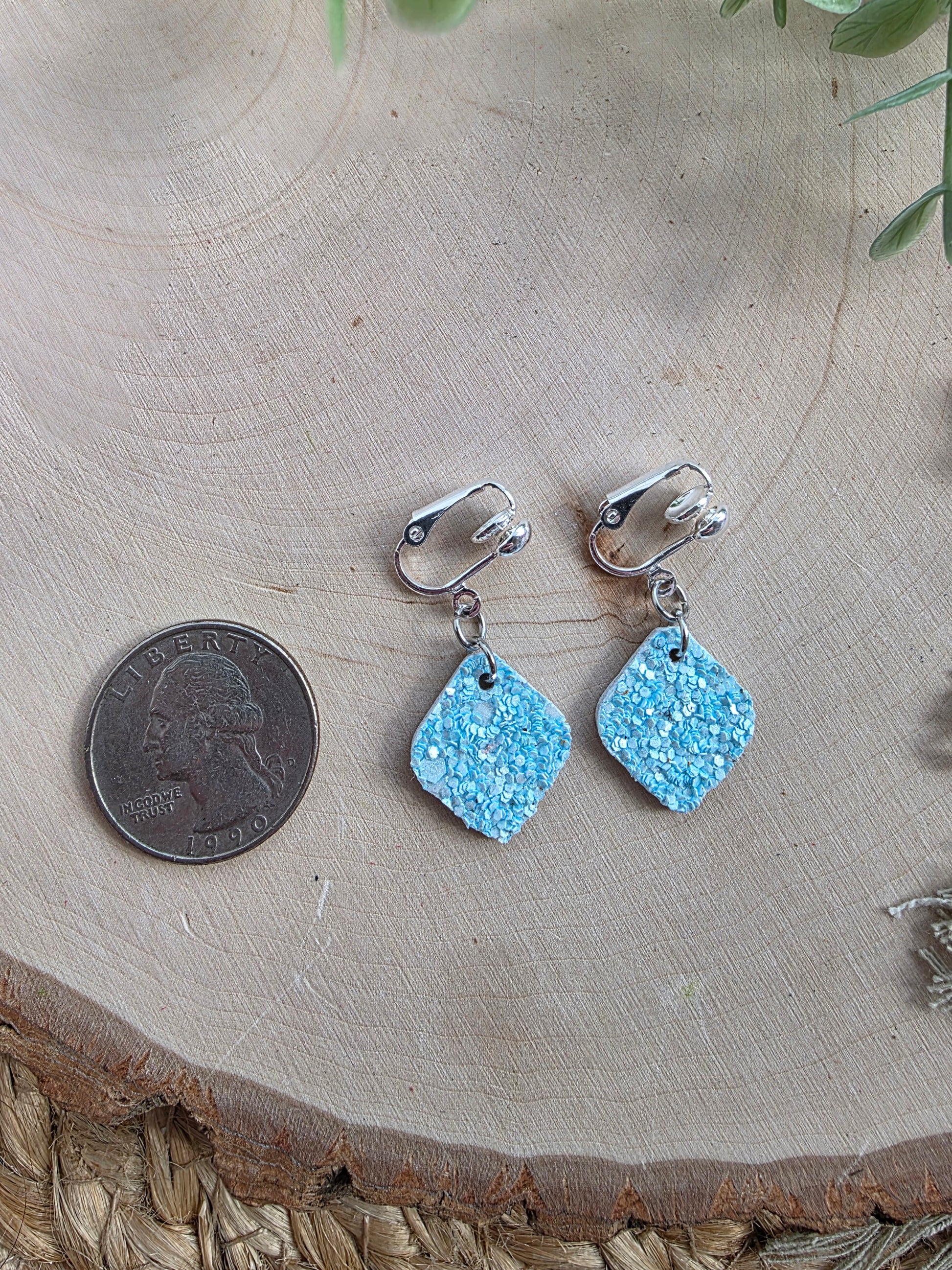 Light blue glitter clip on earrings made with genuine leather backed cork and nickel free plated steel.