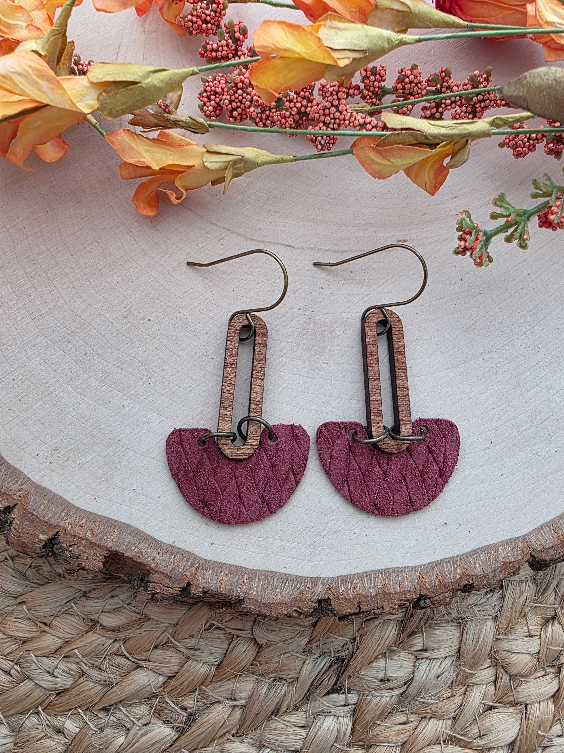 Merlot red drop earrings made with genuine leather, wood oblong piece and antique bronze toned stainless steel hardware (hypoallergenic & tarnish resistant).
