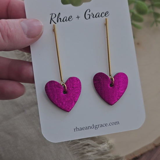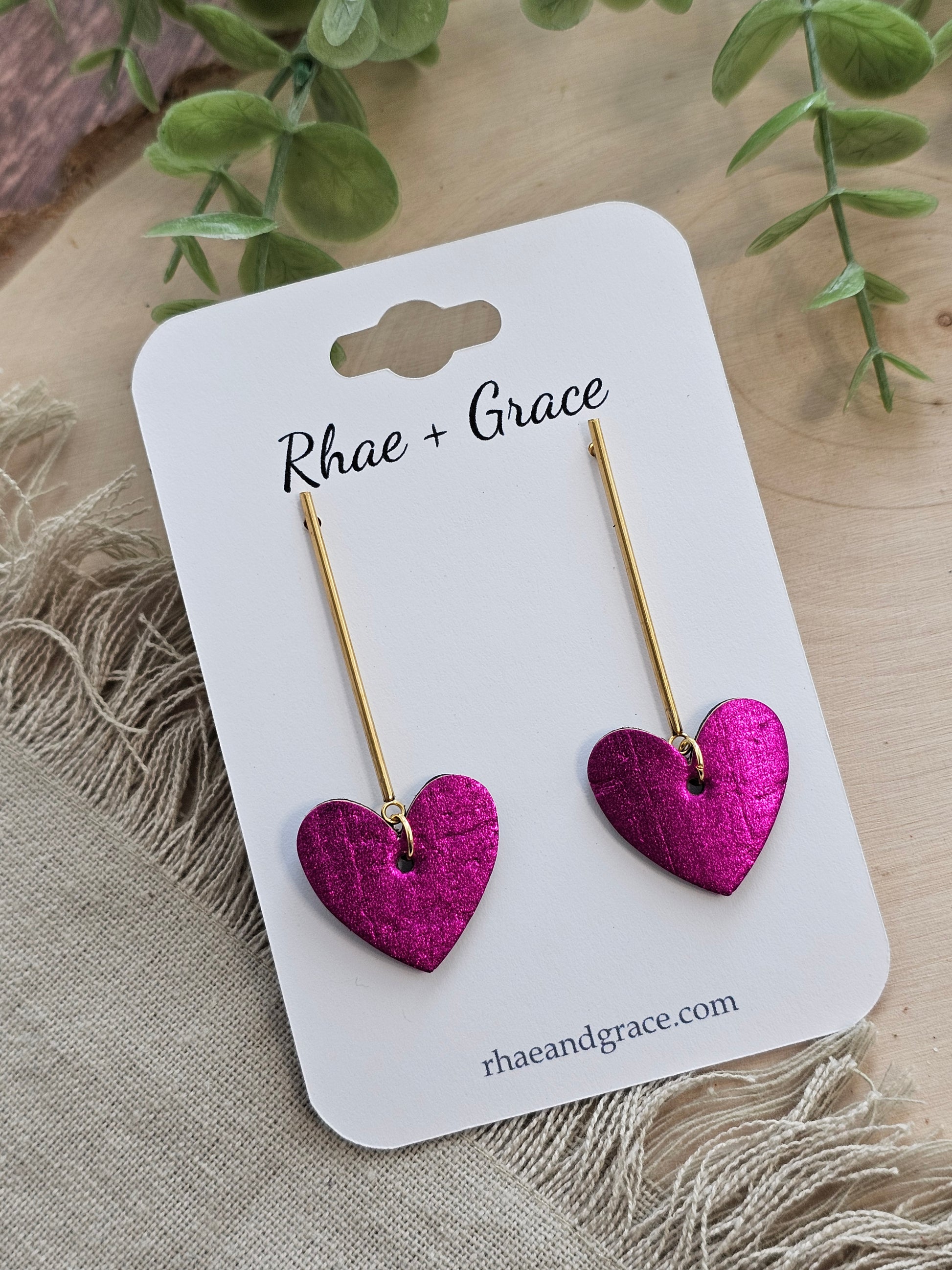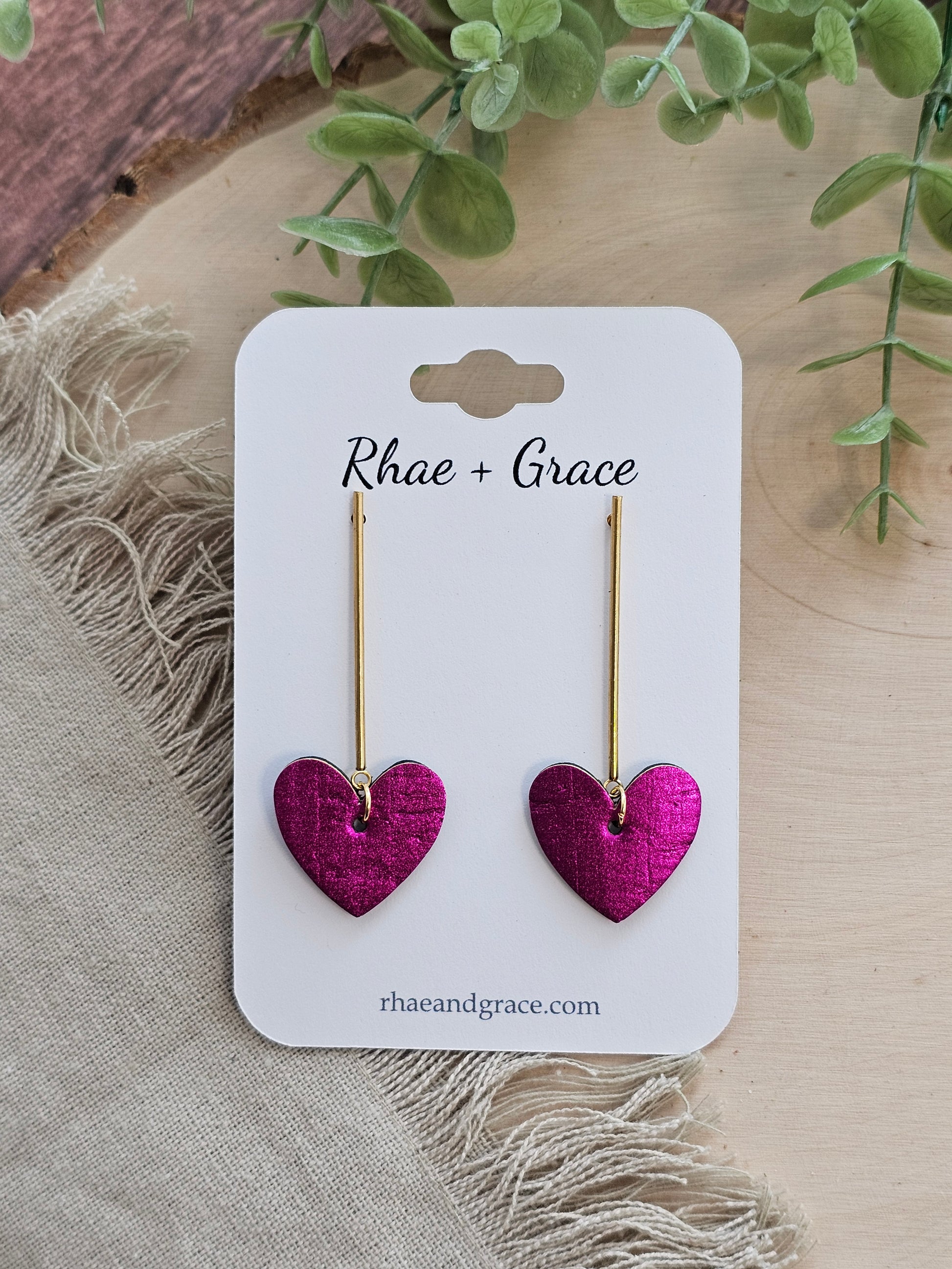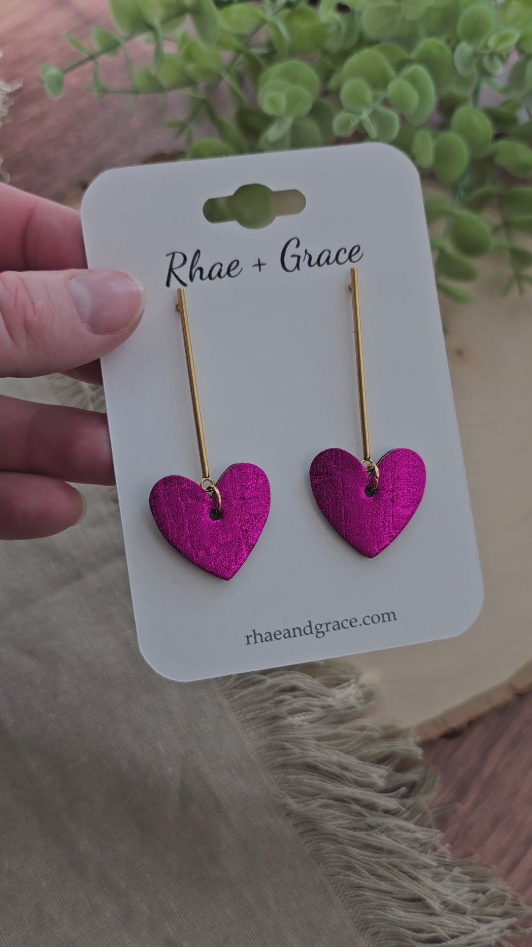 Metallic fuschia drop heart post earrings made with genuine leather backed cork and gold toned stainless steel post hardware (hypoallergenic and tarnish resistant).