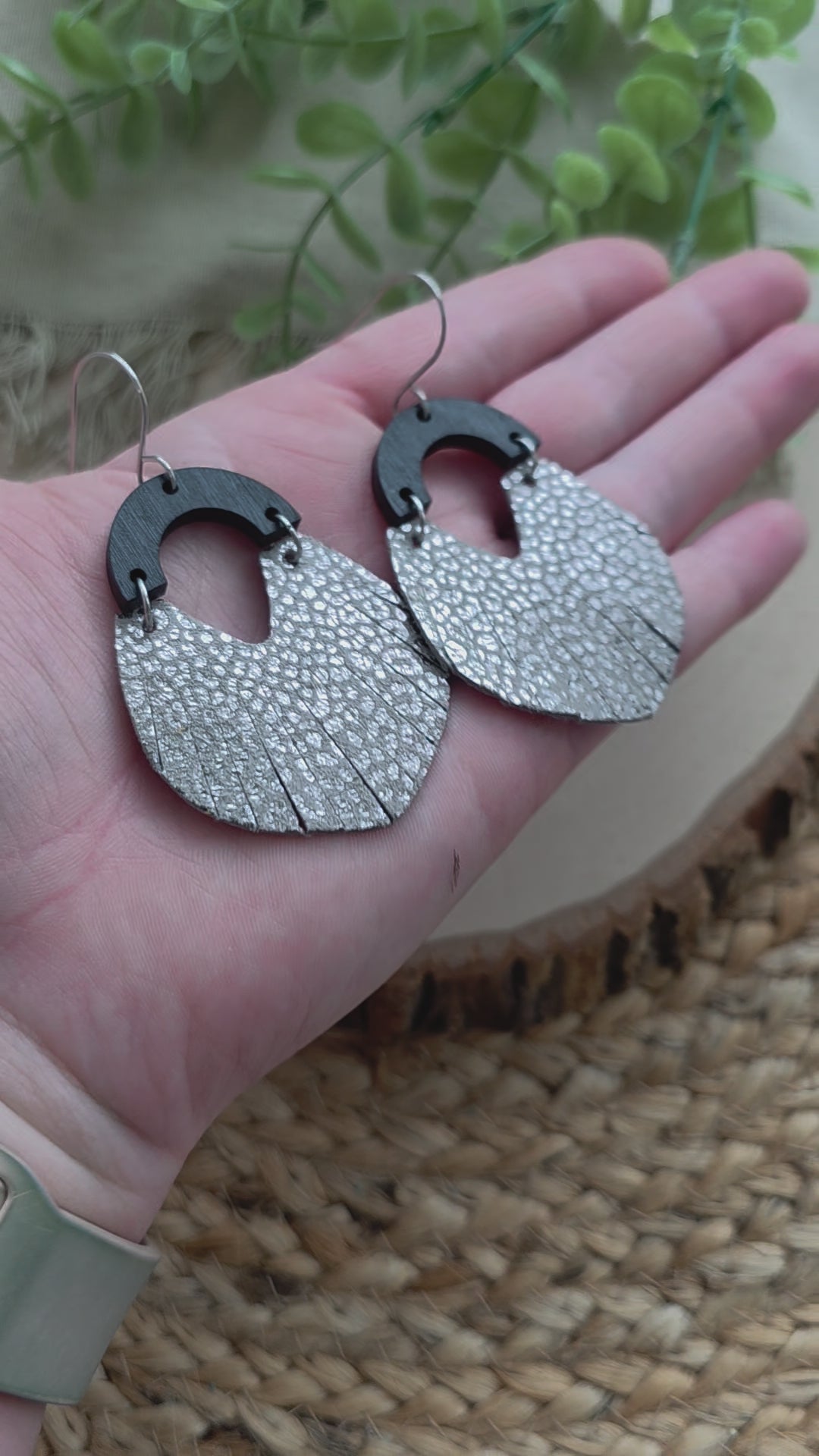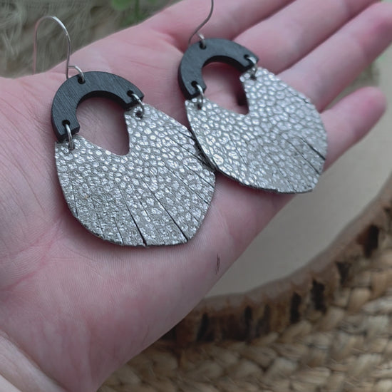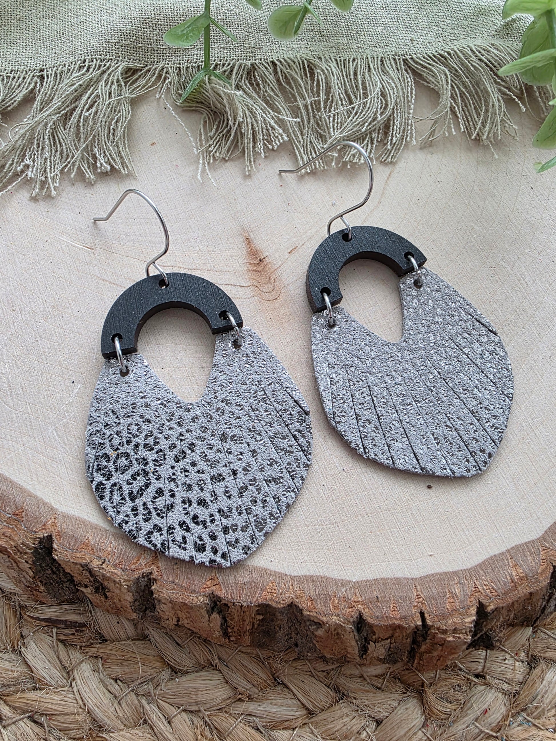 Metallic silver mircro-leopard print fringe swoop earrings made with genuine leather backed cork, black stained wood arch connector and stainless steel findings (hypoallergenic & tarnish resistant).