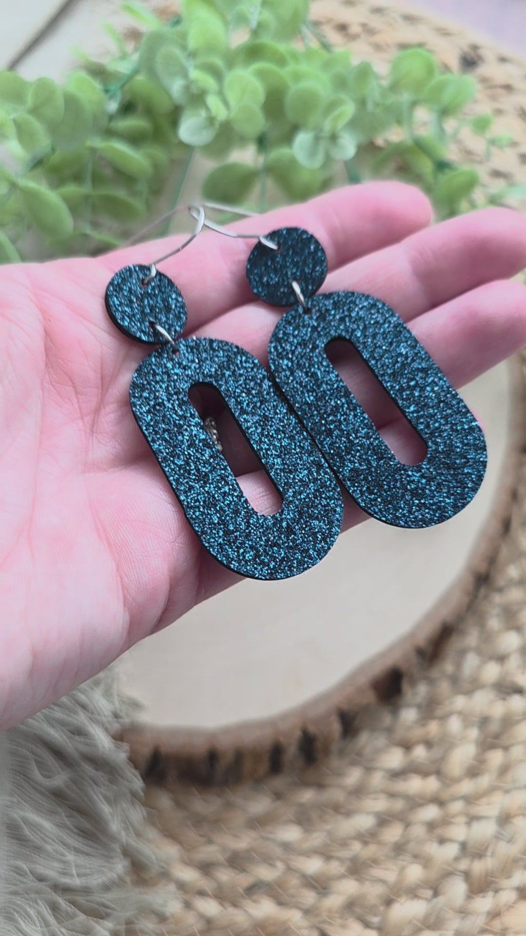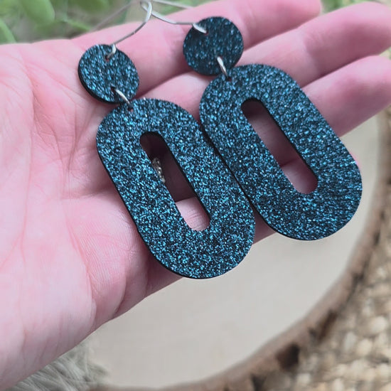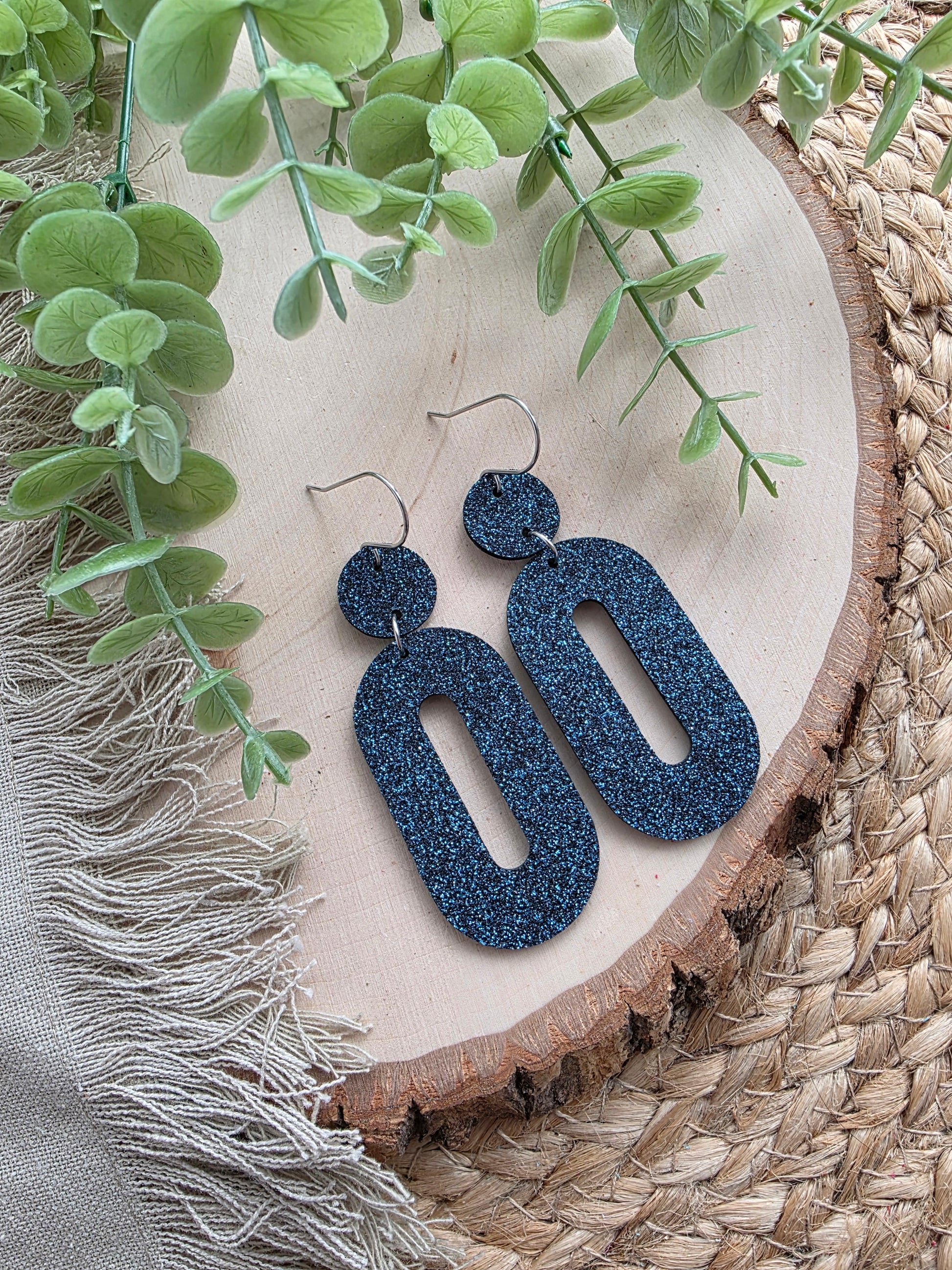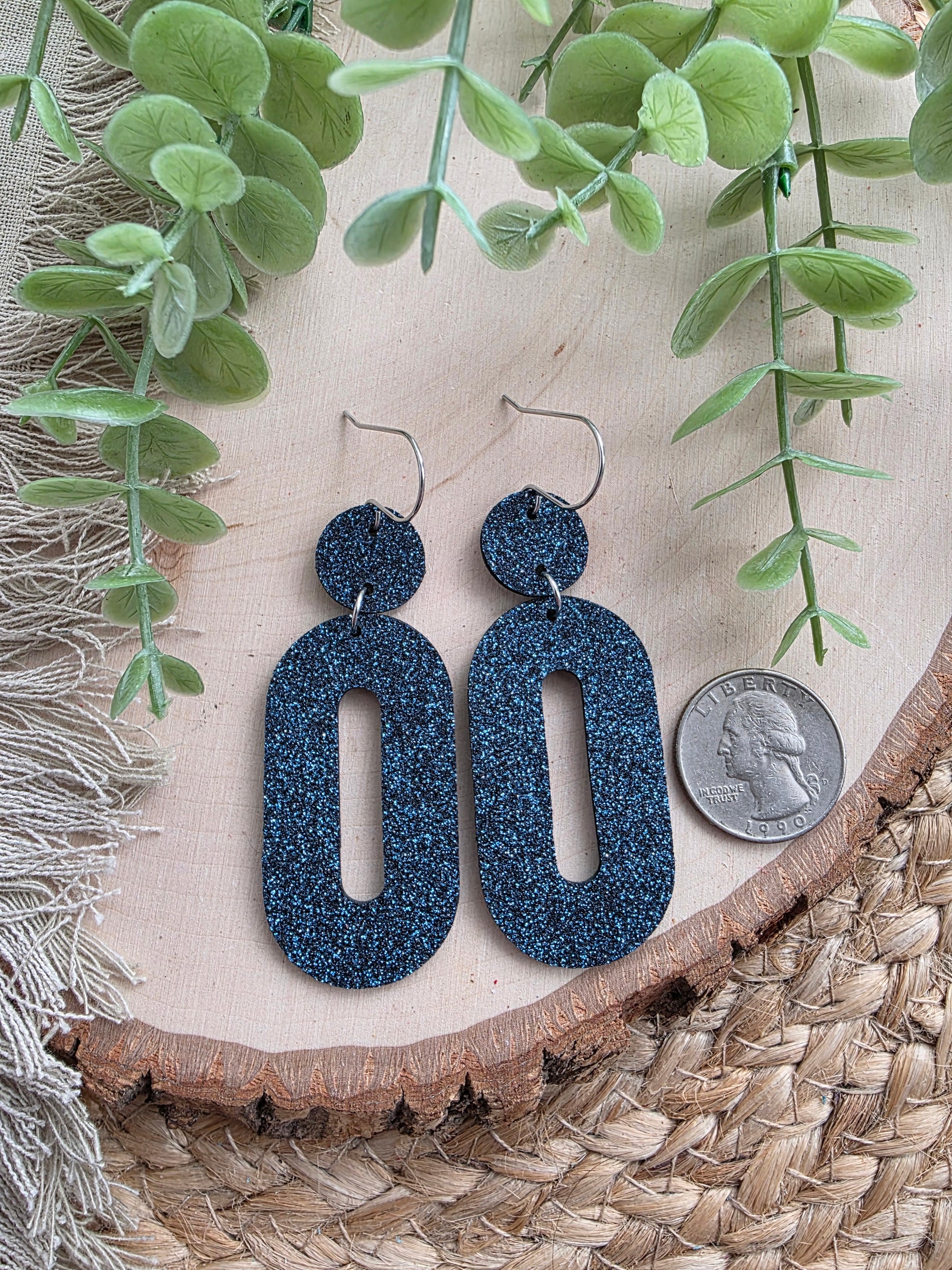 Midnight blue glitter elongated oval earrings made with genuine leather backed glitter and stainless steel hardware (hypoallergenic & tarnish resistant).