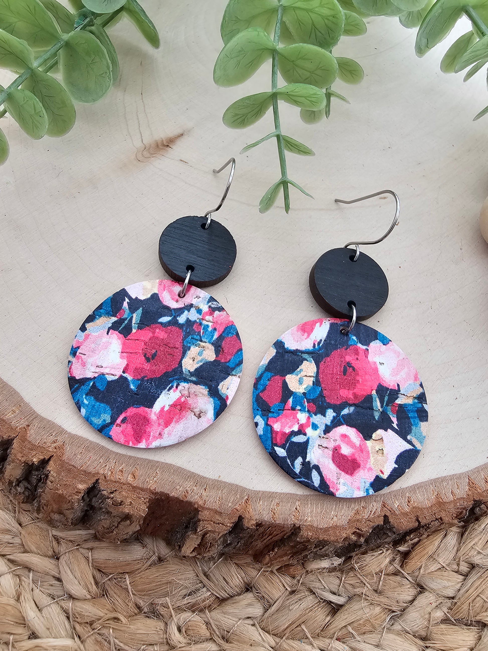 Midnight rose garden large circle drop earrings made with genuine leather backed cork, wood circle and stainless steel earhooks (hypoallergenic & tarnish resistant).
