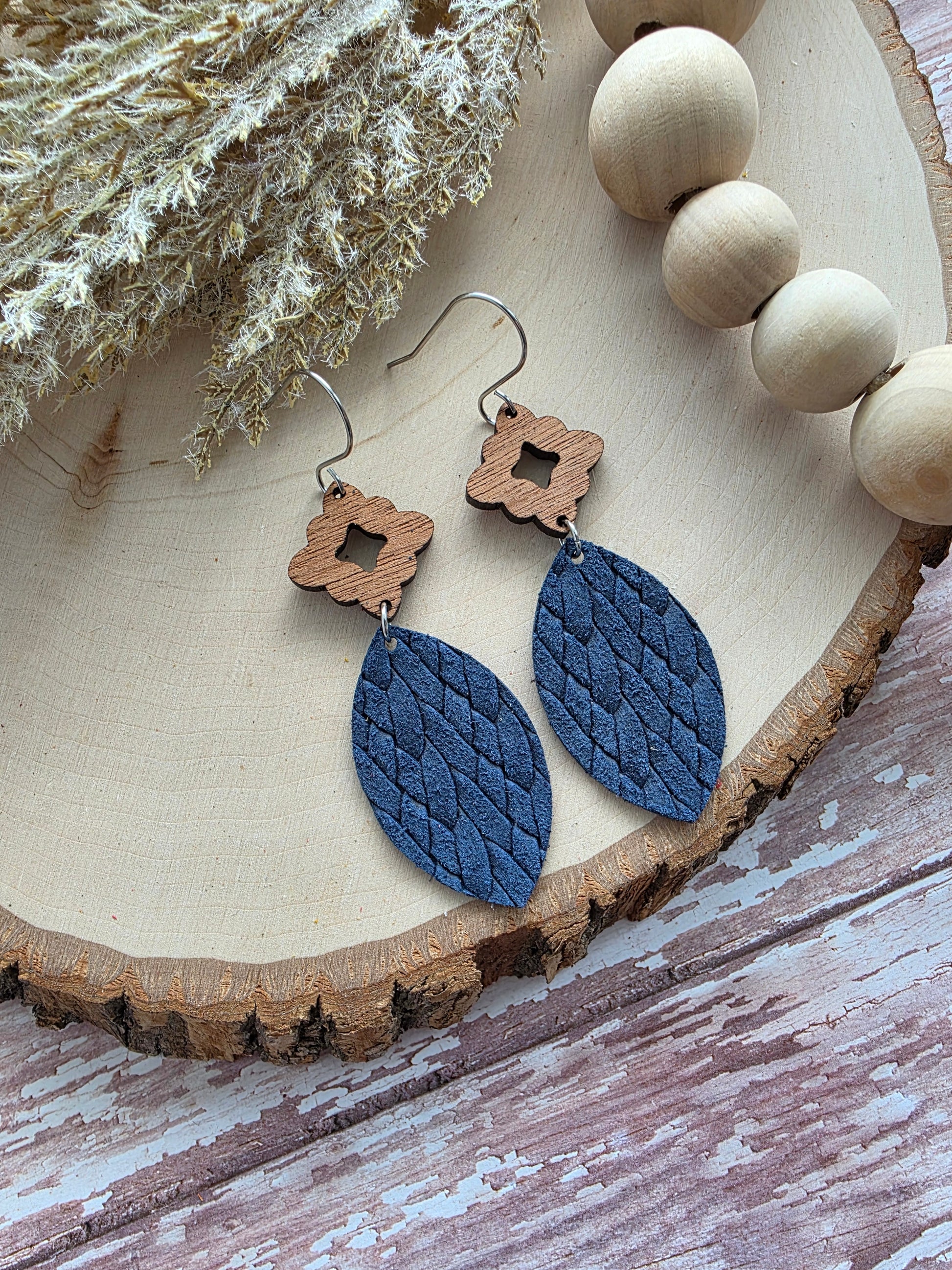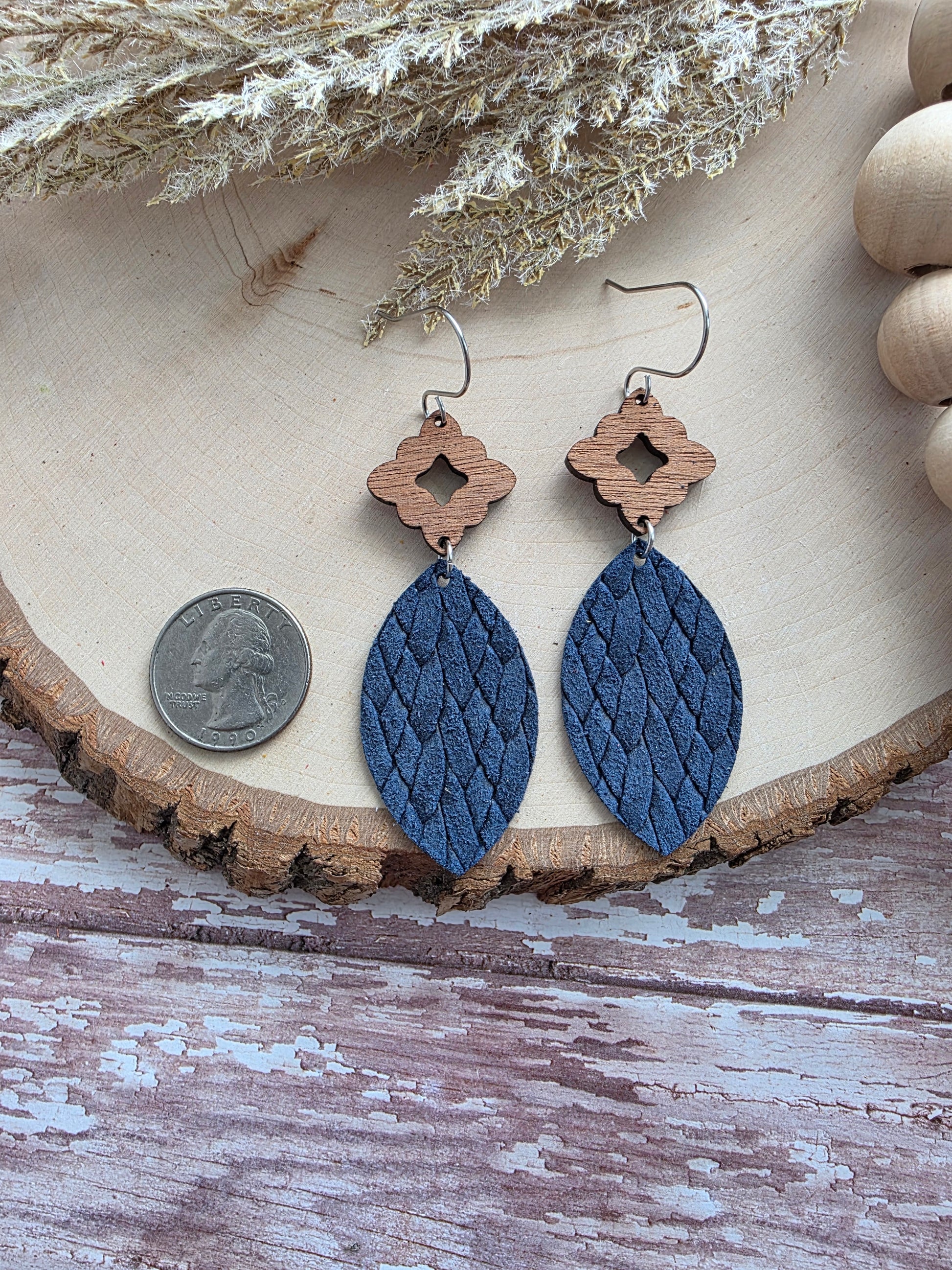 Navy blue textured genuine leather leaf earrings with wood piece and stainless steel earhooks (hypoallergenic & tarnish resistant).
