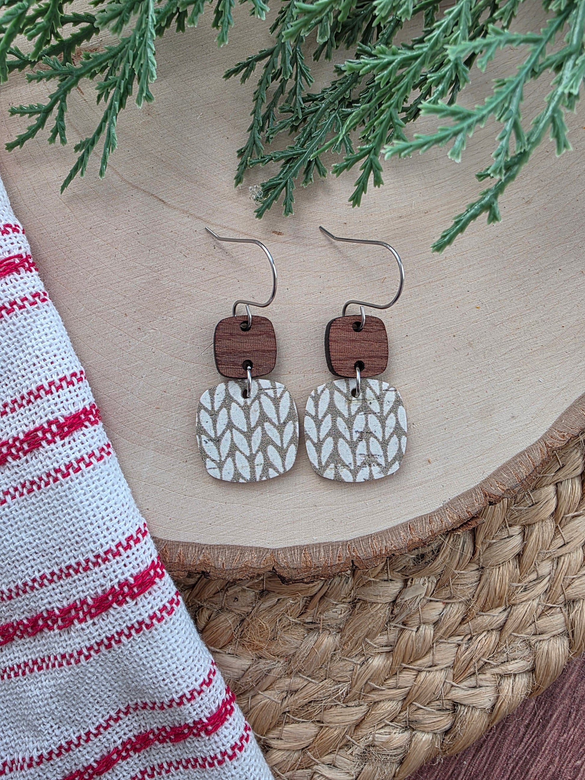 Neutral knit rounded square earrings are made with genuine leather, rounded square wood connector and stainless steel hardware (hypoallergenic and tarnish resistant).