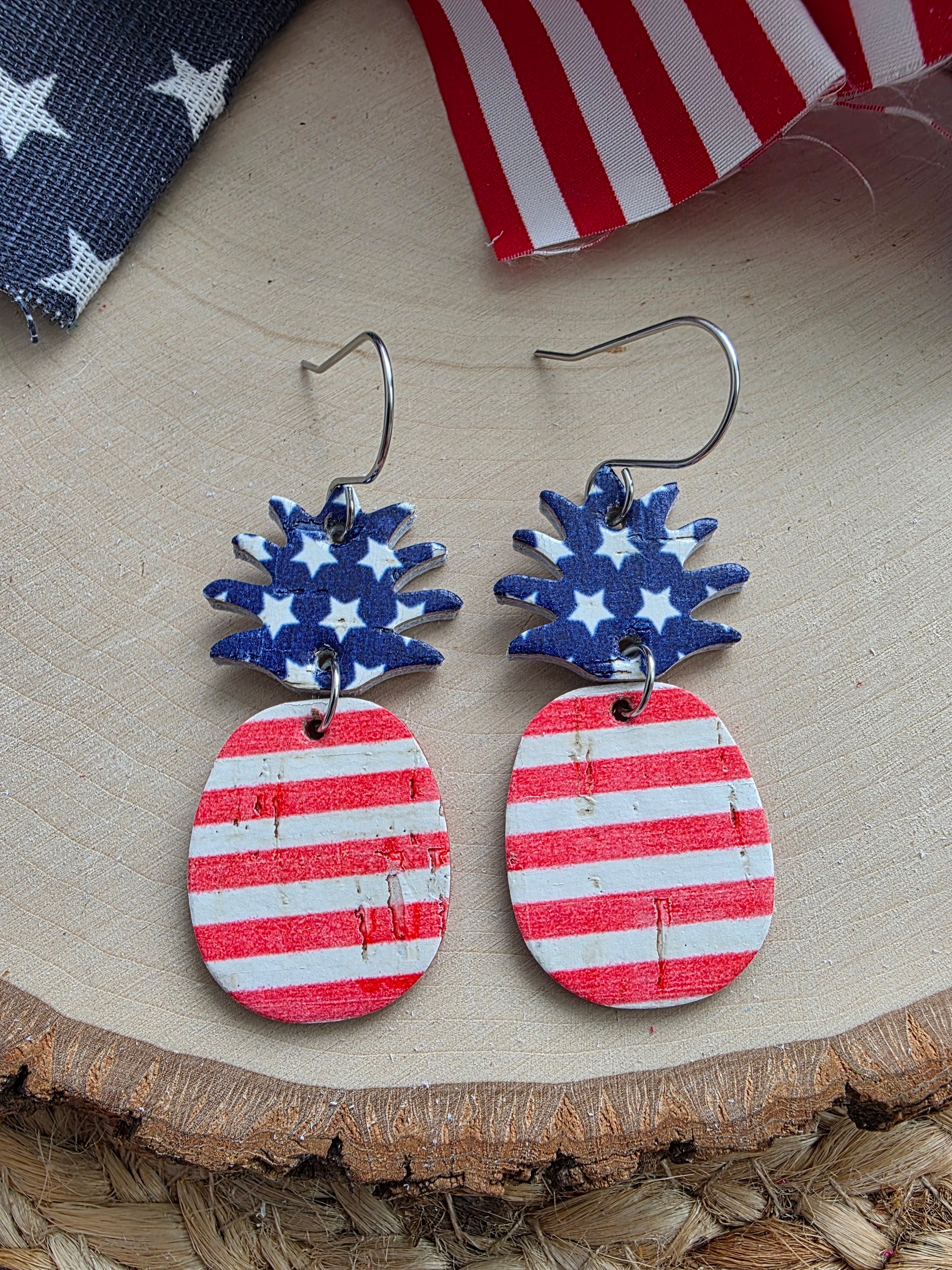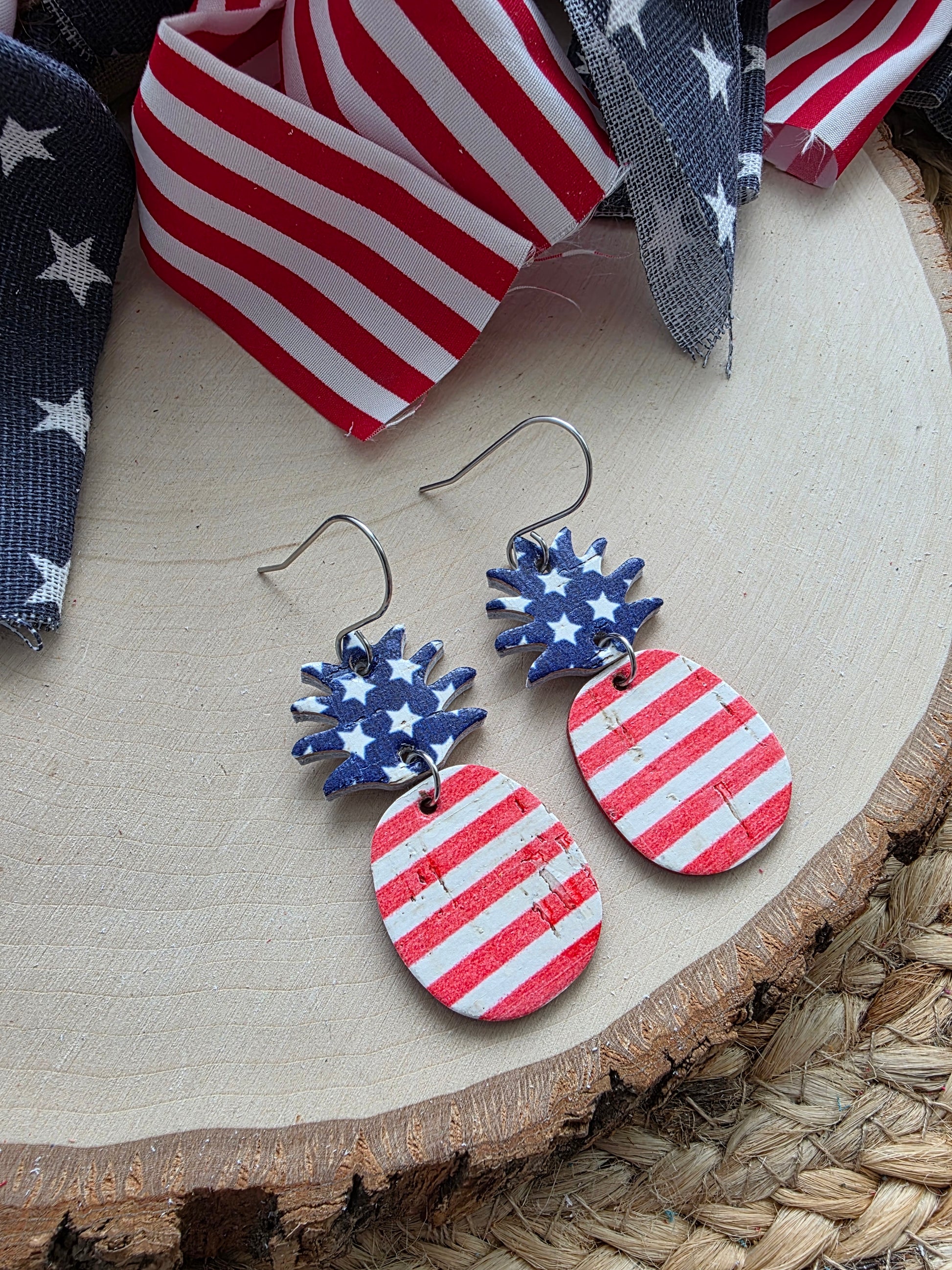 Patriotic pineapple earrings made with genuine leather backed cork and stainless steel earhooks (hypoallergenic & tarnish resistant).