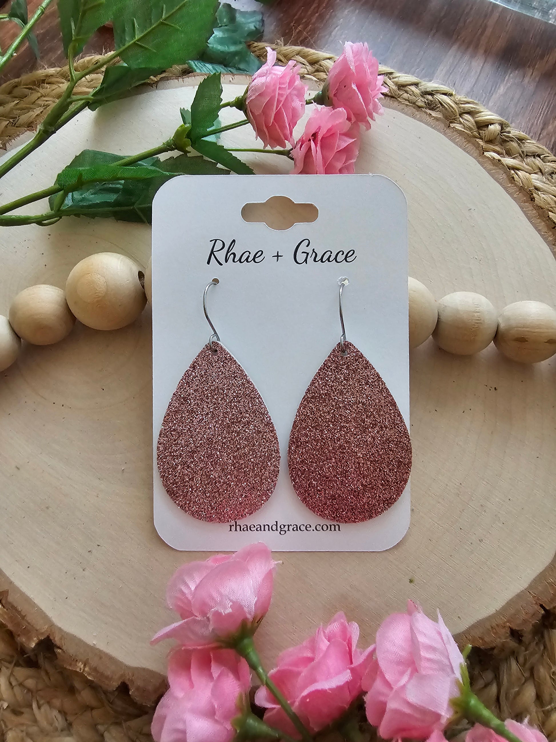 Rose glitter teardrop earrings made with genuine leather backed cork and stainless steel earhooks (hypoallergenic & tarnish resistant).
