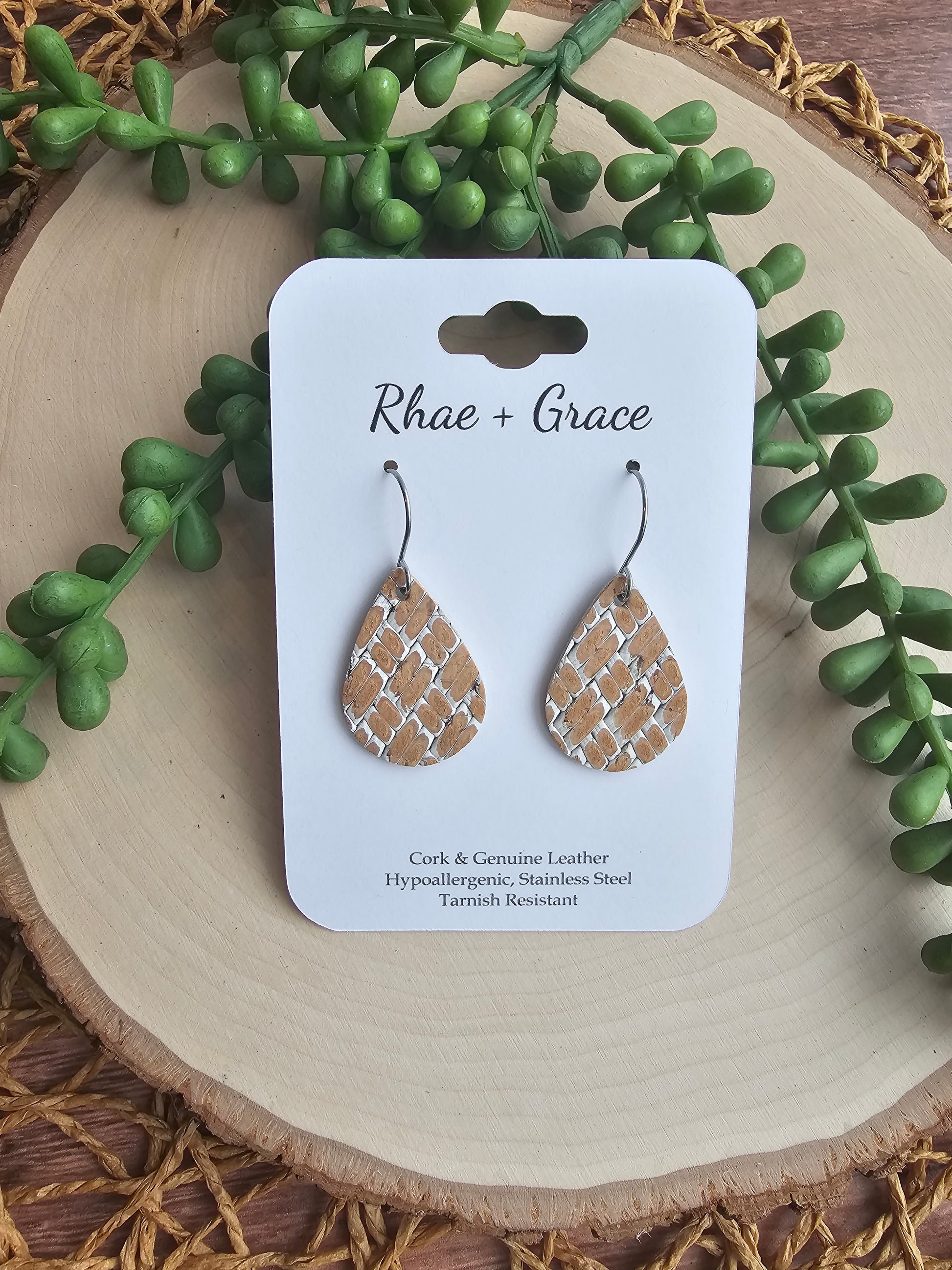 Rustic basketweave teardrop earrings made with genuine leather backed cork and stainless steel earhooks (hypoallergenic & tarnish resistant).