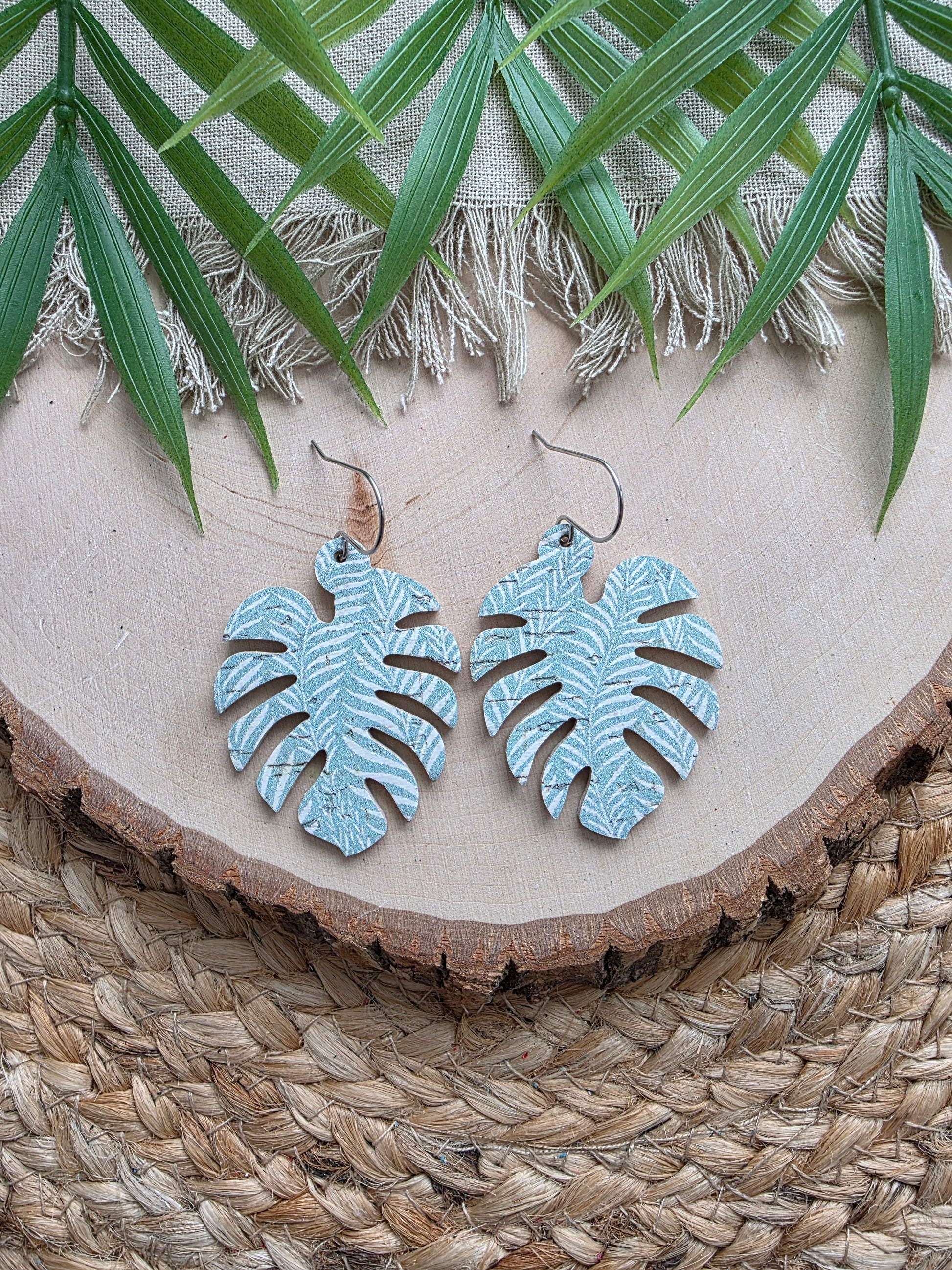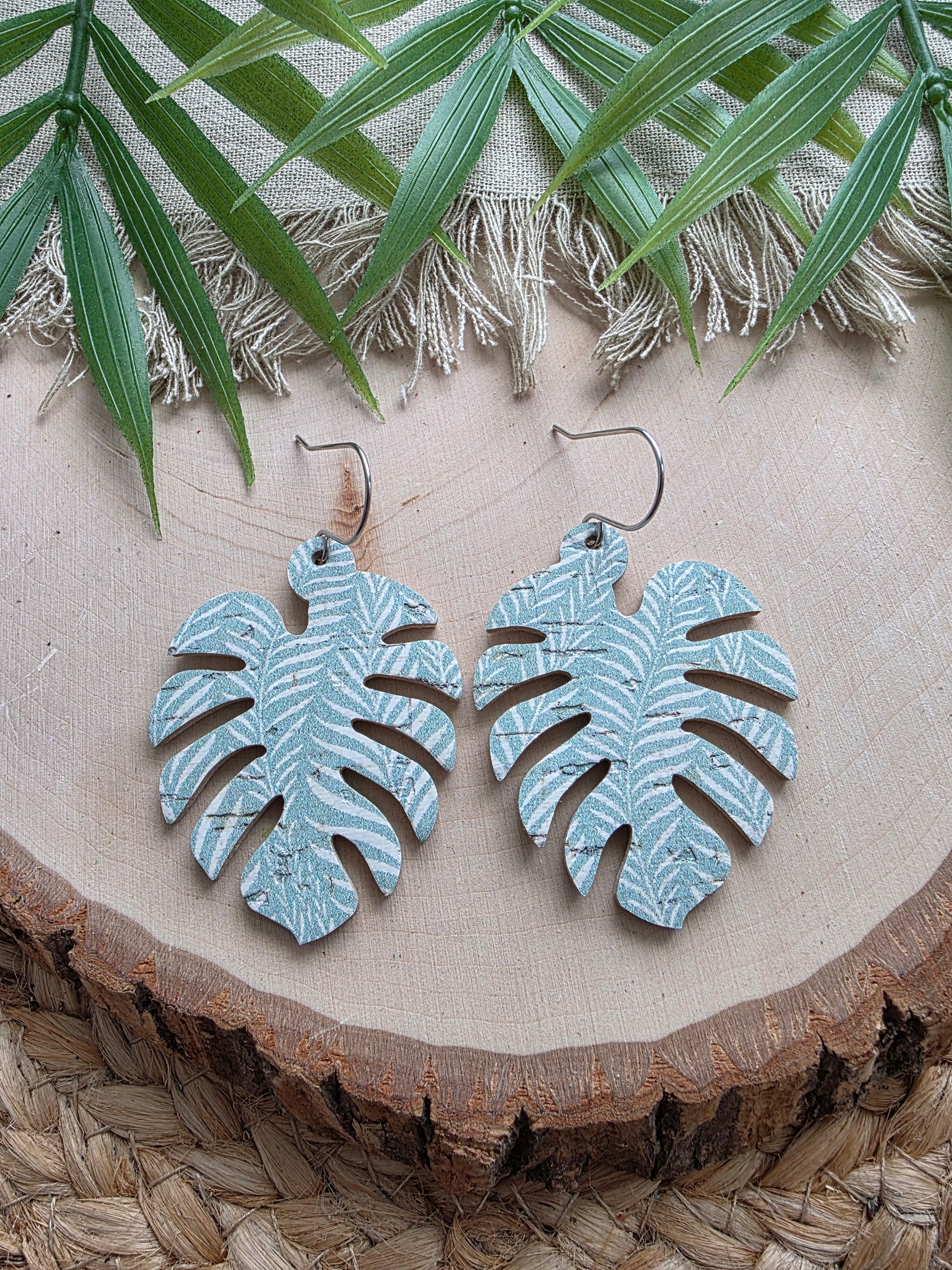 Seafoam green foliage monstera leaf earrings made with genuine leather backed cork and stainless steel earhooks (hypoallergenic & tarnish resistant).