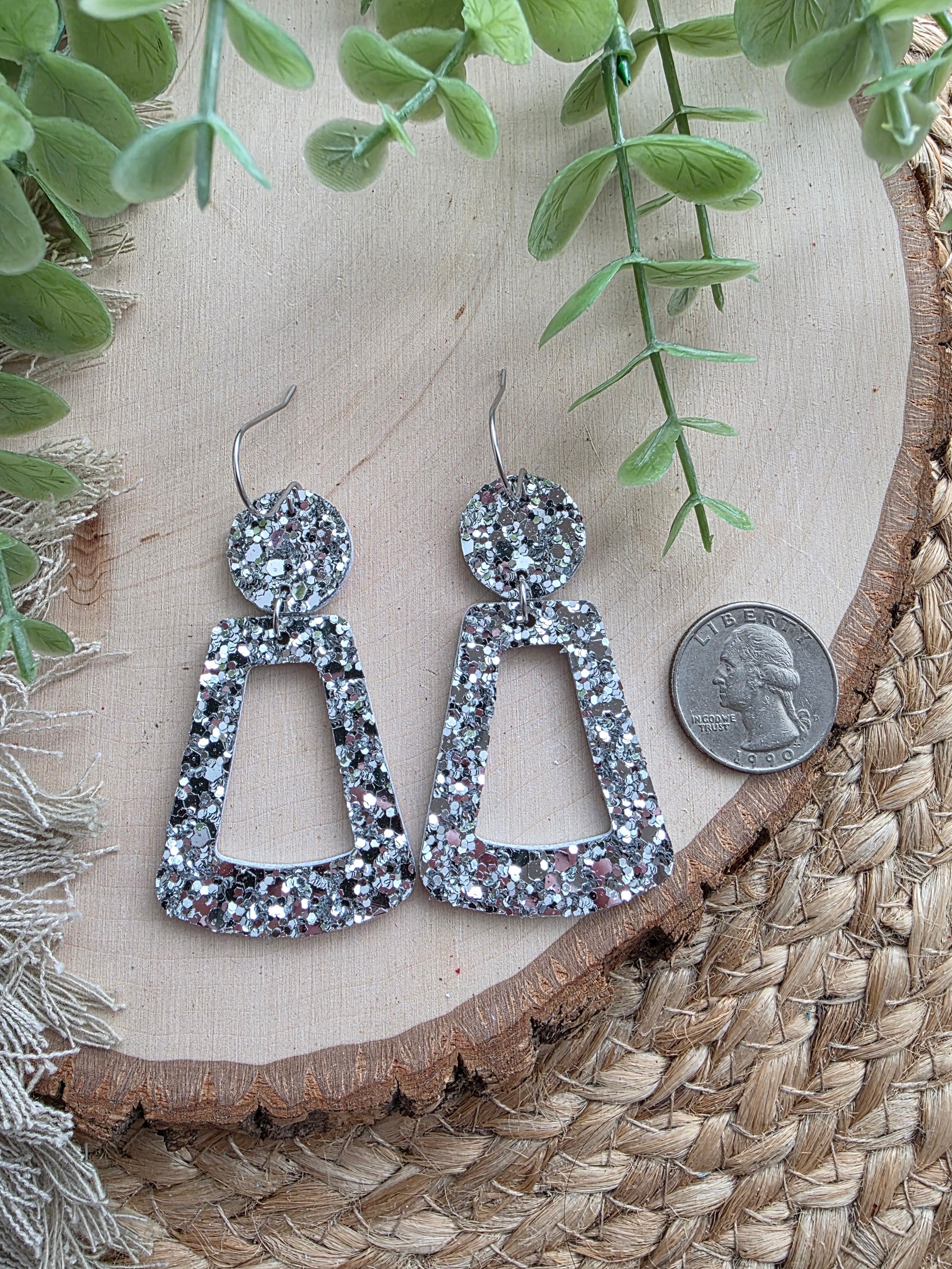 Silver glitter open trapezoid earrings made genuine leather backed glitter and stainless steel earhooks (hypoallergenic & tarnish resistant).