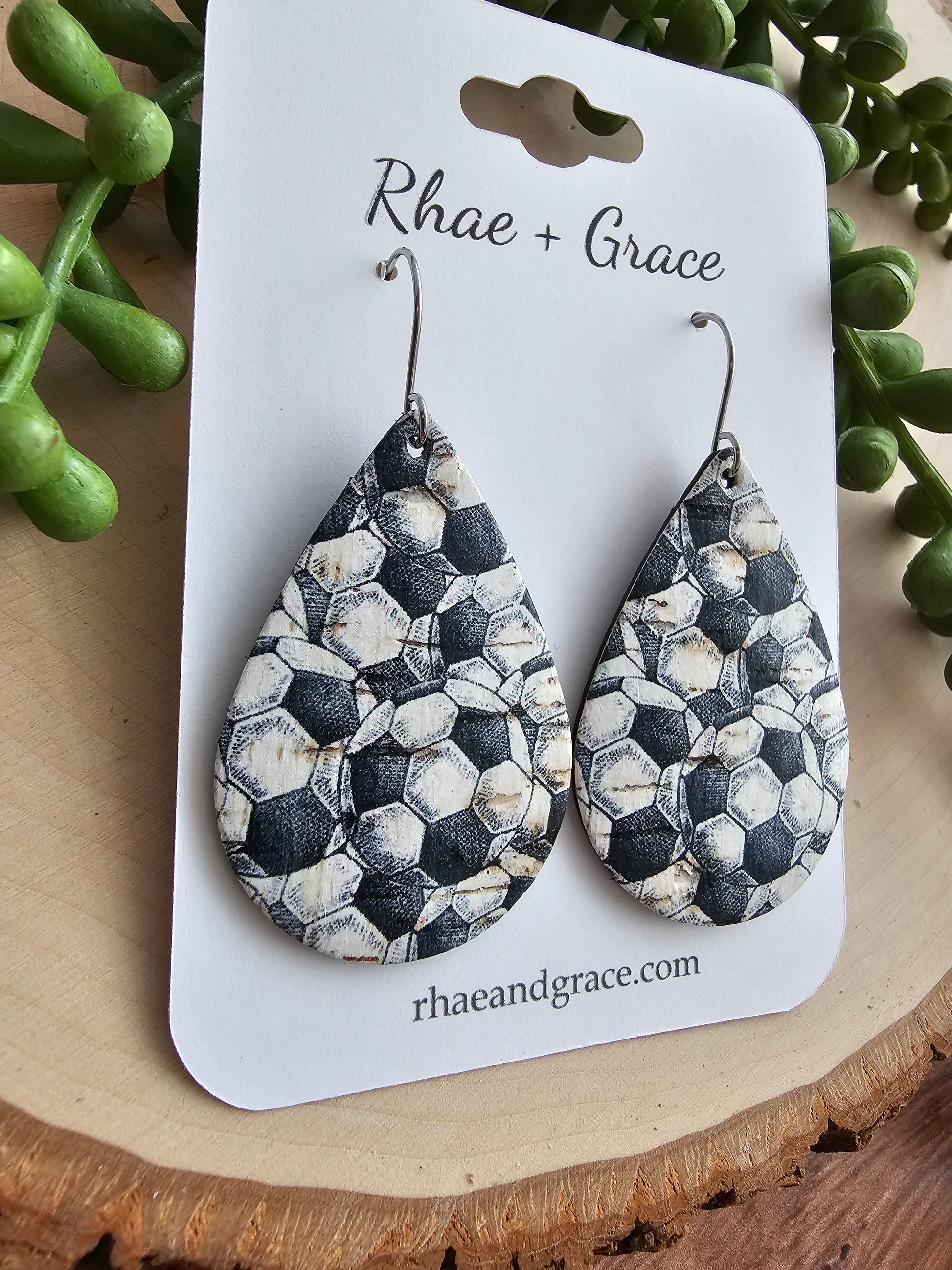 Soccer teardrop earrings made with genuine leather backed cork and stainless steel hardware (hypoallergenic & tarnish resistant).
