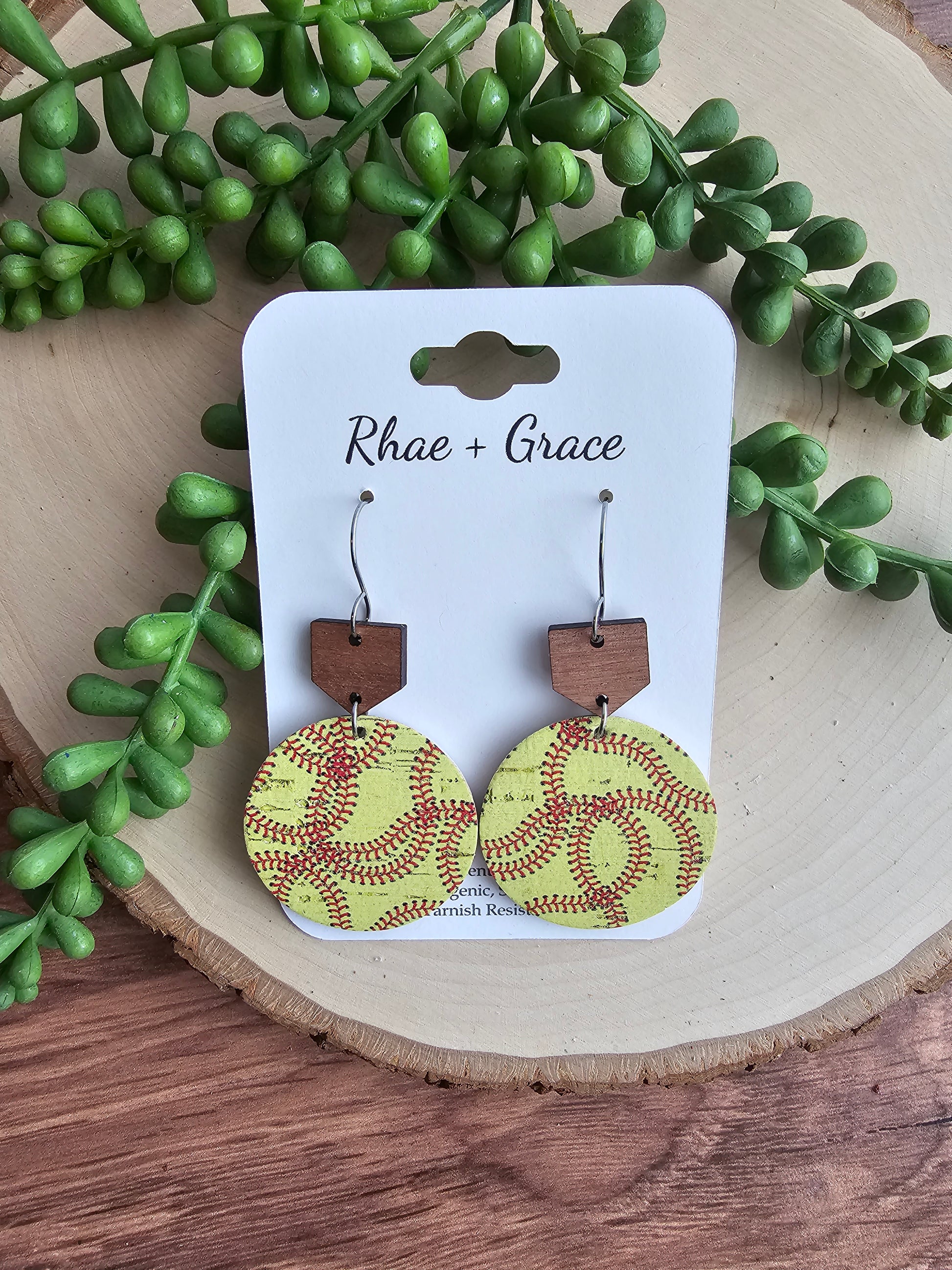 Softball homeplate earrings made with genuine leather backed cork, wood homeplate and stainless steel earhooks (hypoallergenic & tarnish resistant).