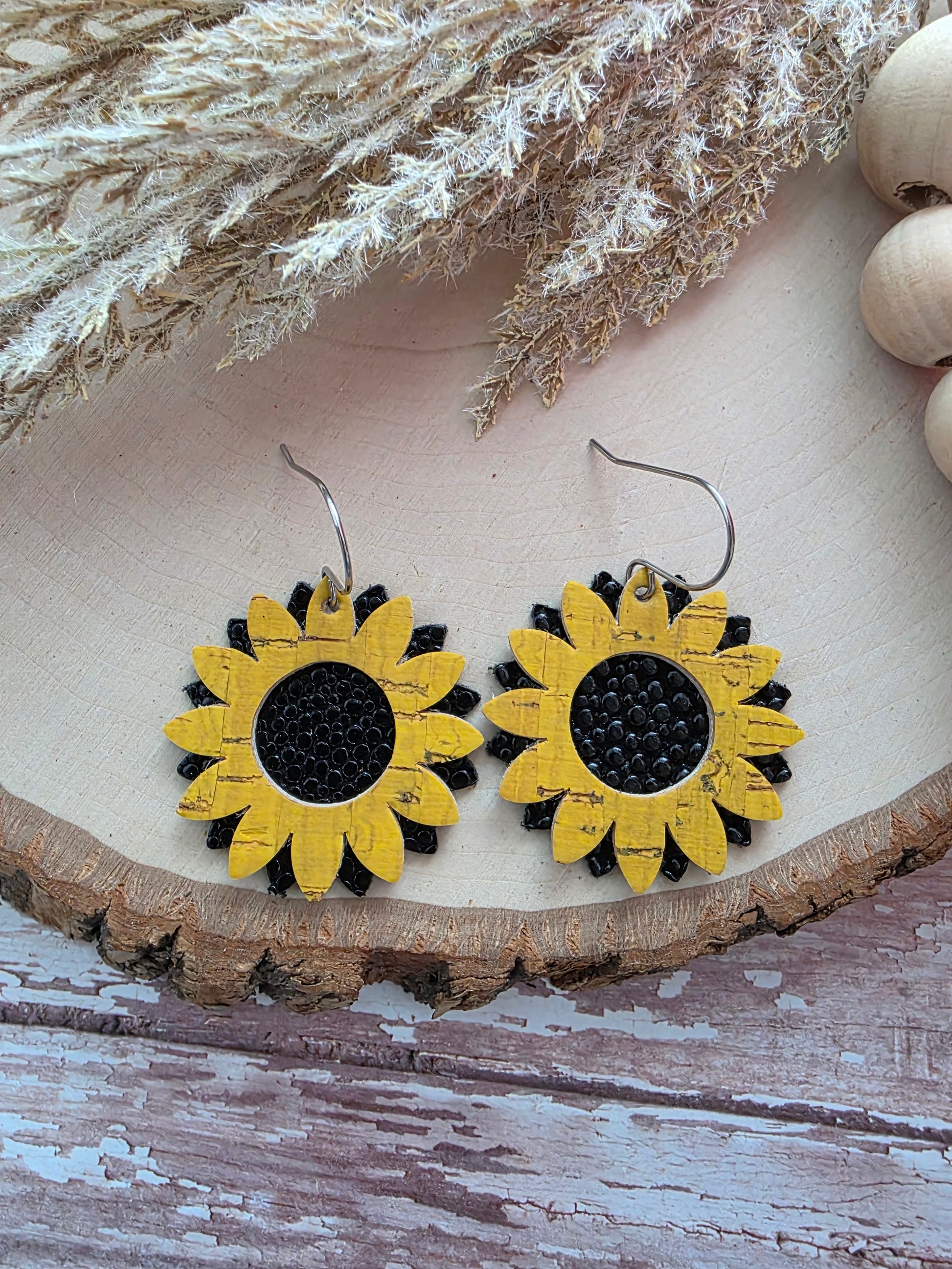 Sunflower earrings made with a layer of yellow leather backed cork, textured black leather and stainless steel hardware (hypoallergenic & tarnish resistant).