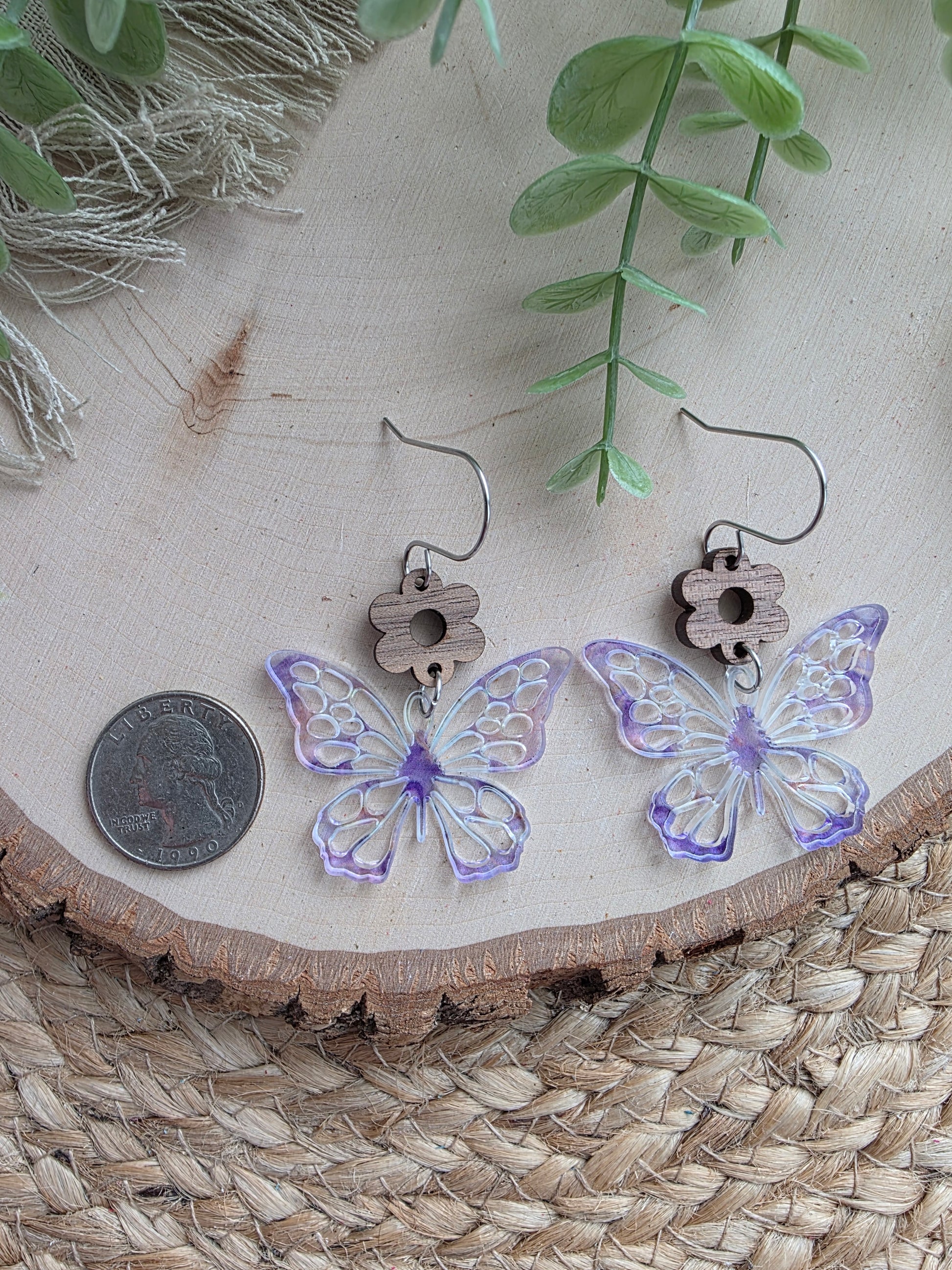 Acrylic and wood purple butterfly earrings made with clear purple acrylic, wood flower connector and stainless steel hardware (hypoallergenic and tarnish resistant).