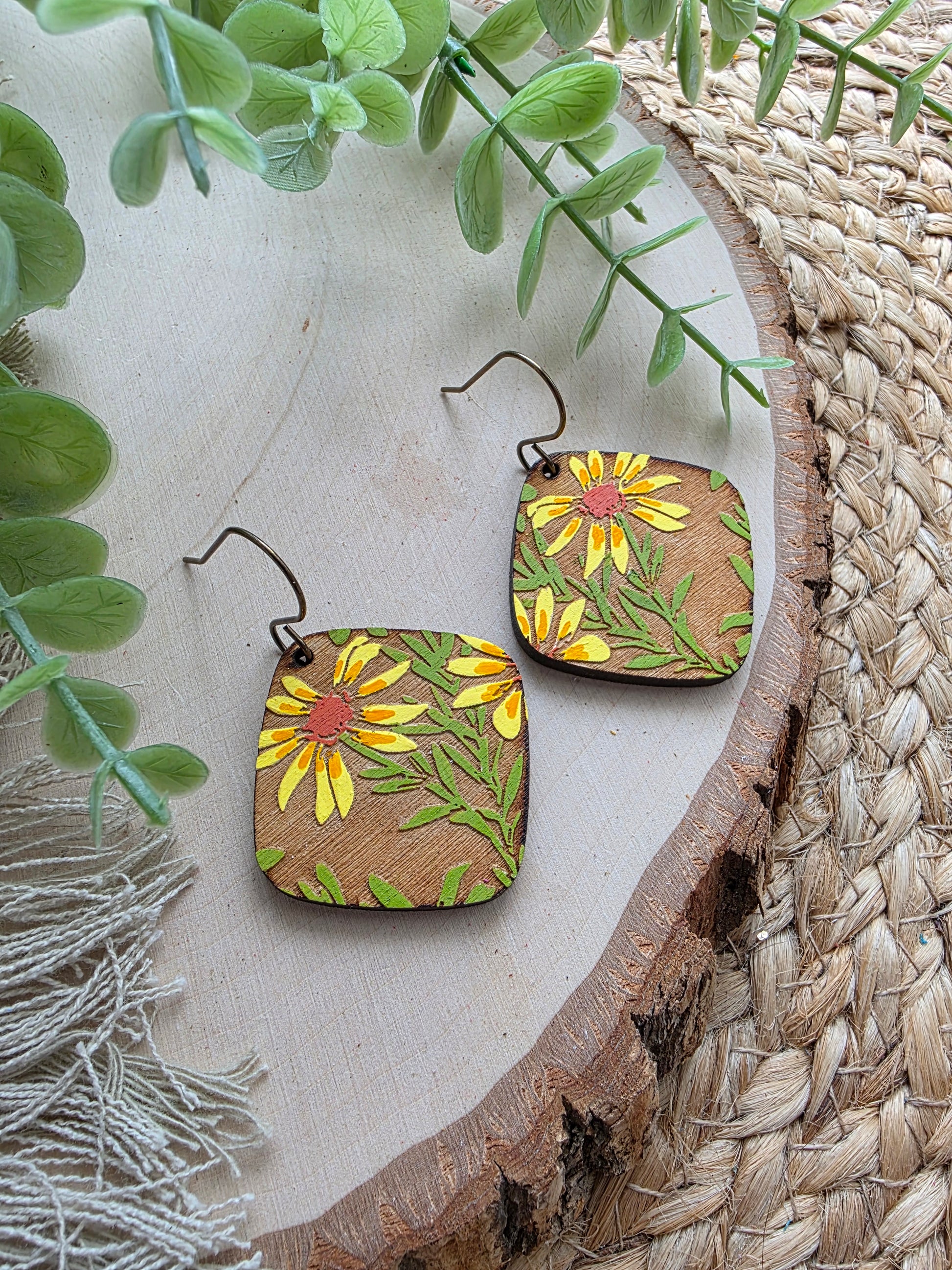 Made with engraved wood, these handpainted Floral earrings a lightweight and unique! Made with antique bronze toned stainless steel hardware (hypoallergenic and tarnish resistant).