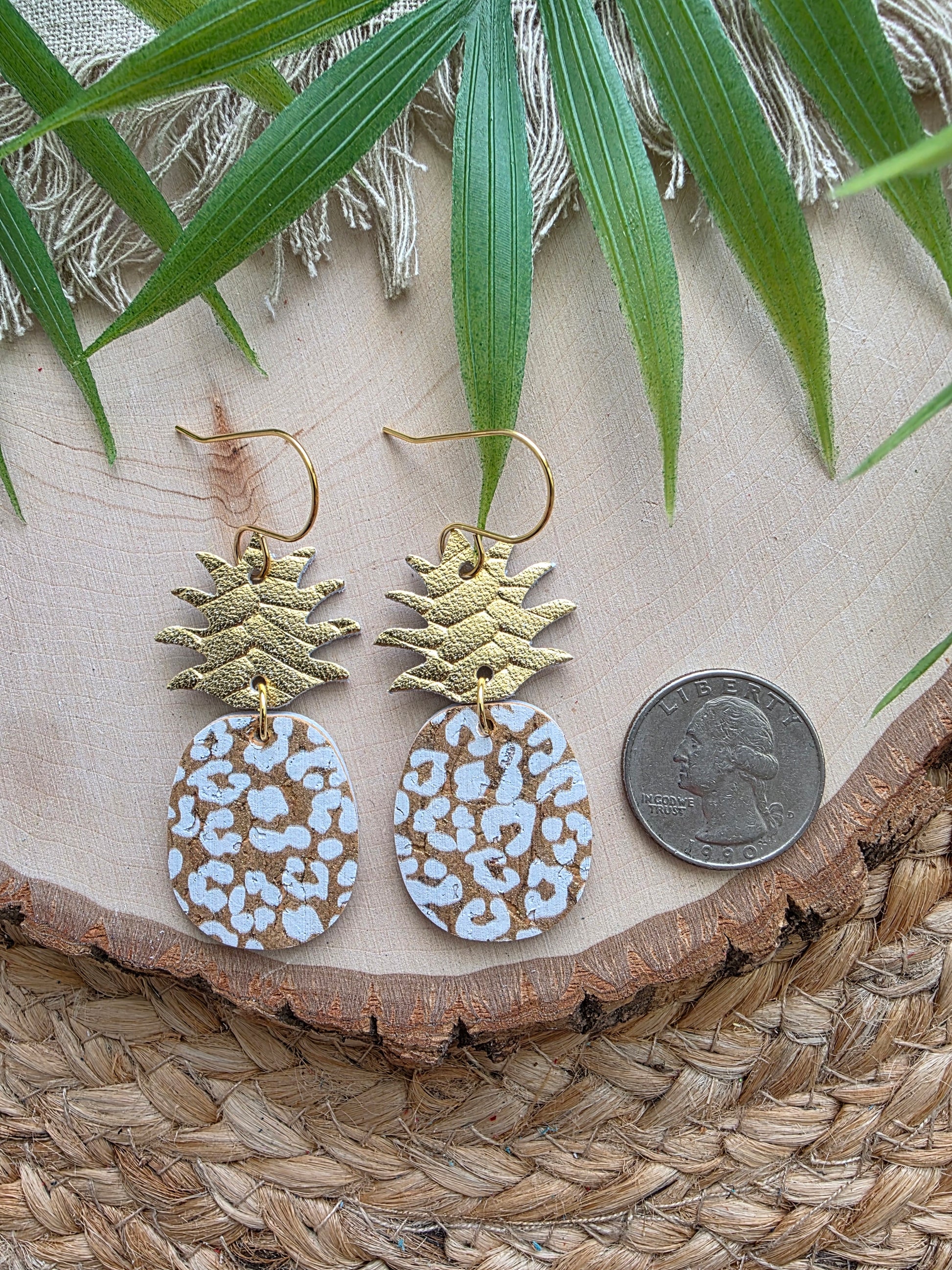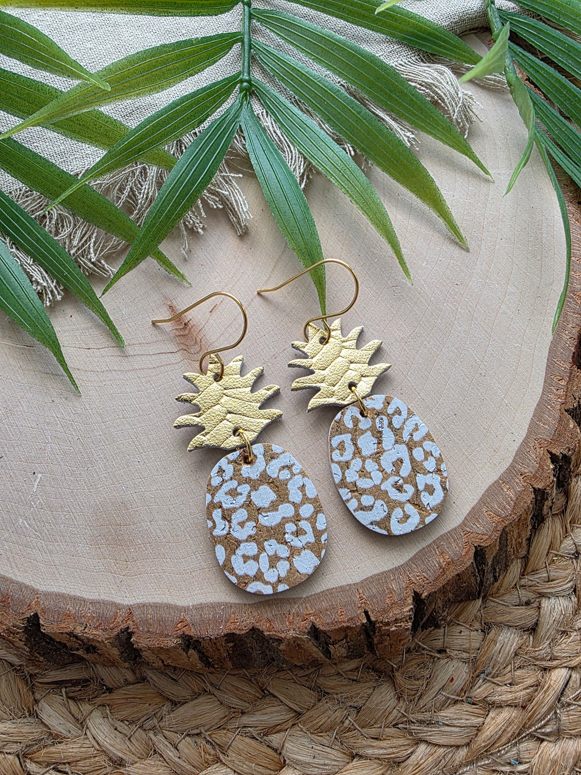 White leopard print pineapple earrings made with genuine leather backed cork, genuine leather top and stainless steel earhooks (hypoallergenic & tarnish resistant).