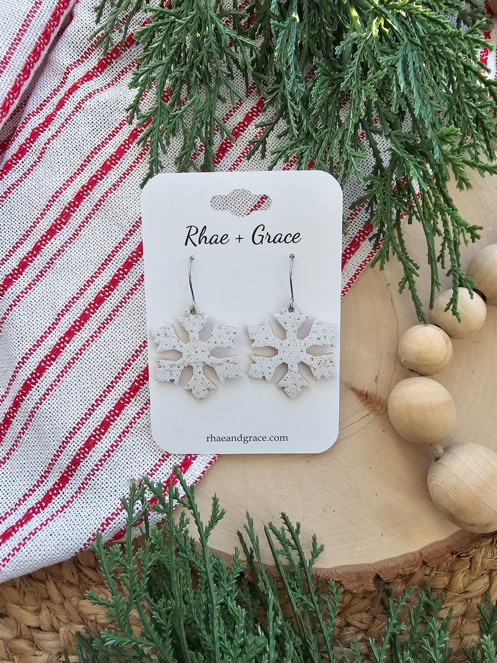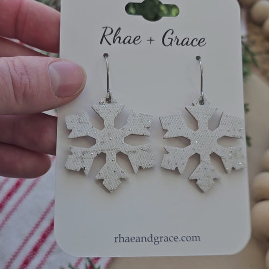 White sparkle snowflakes made with genuine leather backed cork, topped with a layer of sparkly mesh and stainless steel earhooks (hypoallergenic and tarnish resistant).