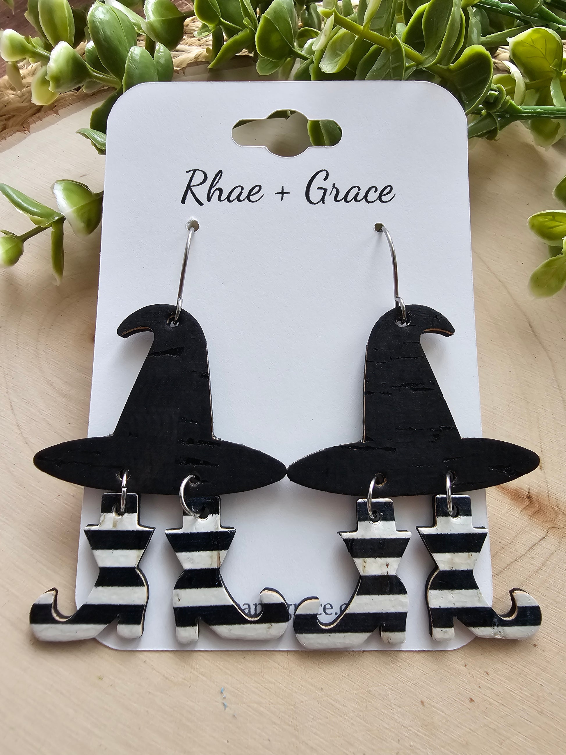 Witch hat with black and white striped boots earrings made with genuine leather backed cork and stainless steel hardware (hypoallergenic and tarnish resistant).