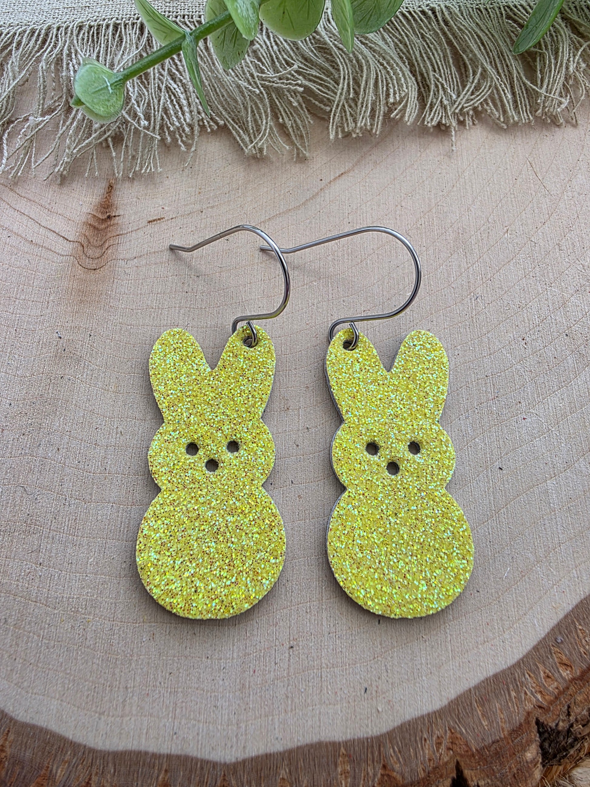 Yellow glitter bunny peep earrings made with glitter backed with genuine leather and stainless steel earhooks (hypoallergenic & tarnish resistant).
